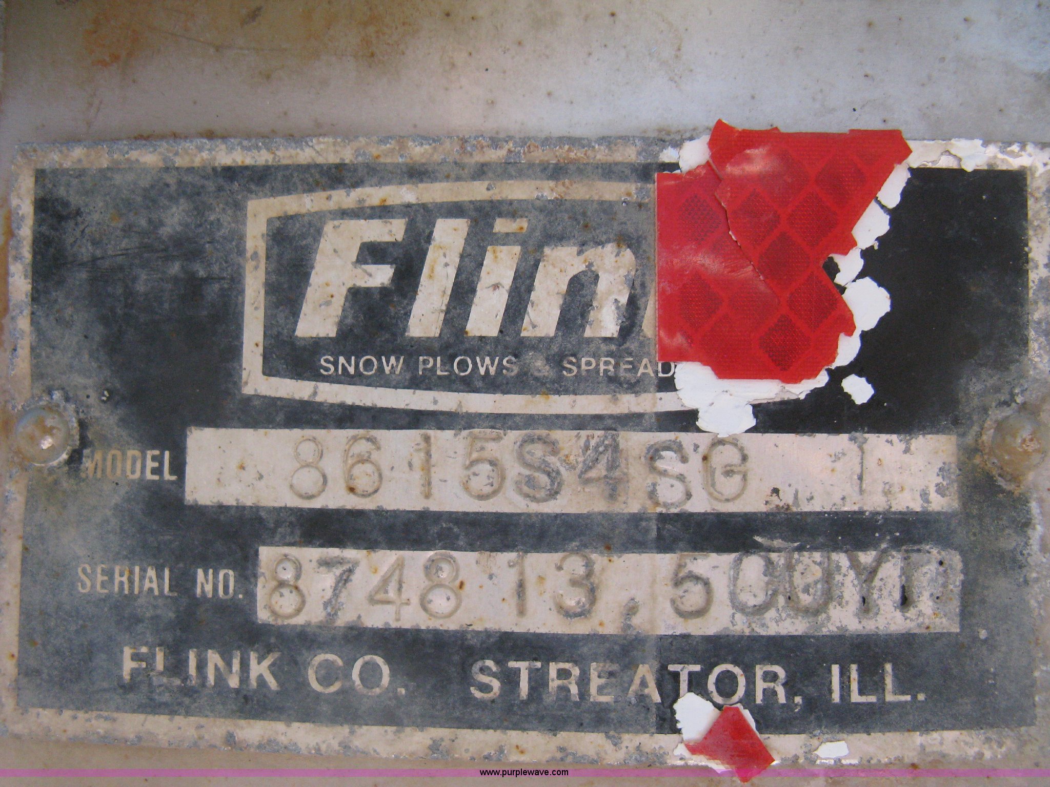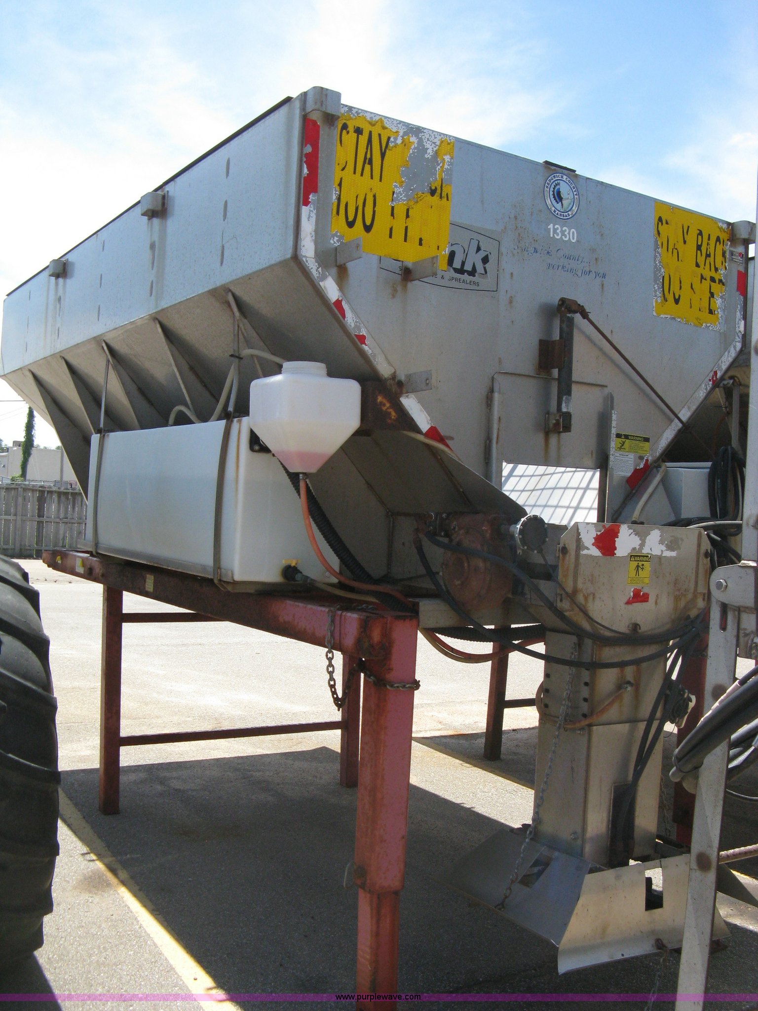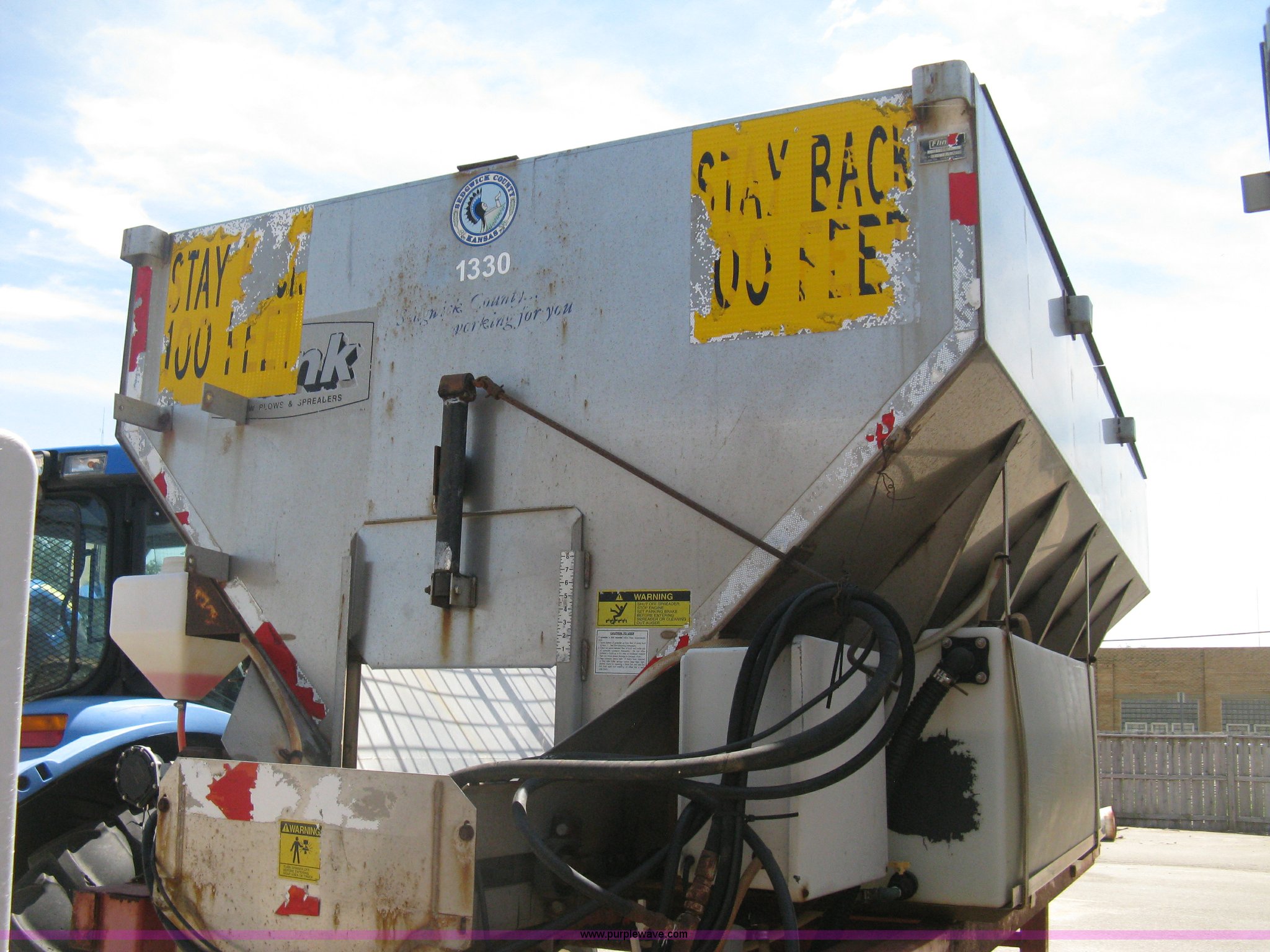 Purple Wave is selling a used Truck Part and Attach. in Kansas. This item is a Flink slide-in salt/sand spreader with the following: Model 8615S4SG, 13.5 cu. yd. capacity, Stainless steel, Hydraulic drive spinner, (2) poly side mount brine tanks, Stand alone frame stand, Front slide-in roller, Top grates, Serial 8748, Unit 1330
