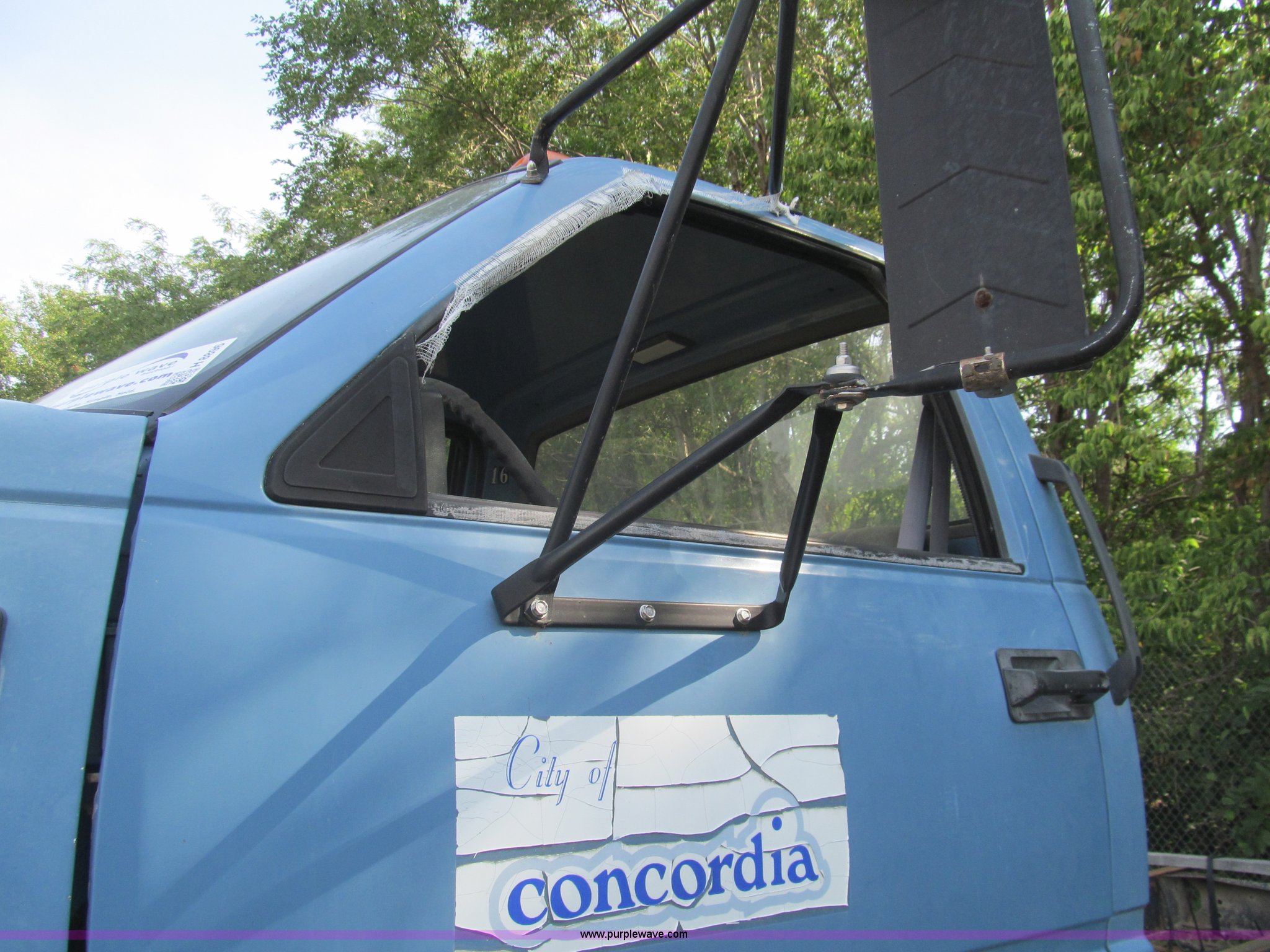 1997 Chevrolet C6500 truck cab and chassis. 41,271 miles on odometer, 7.4L V8 diesel engine, Automatic transmission, Manual windows and locks, Chelsea PTO No pump, 50 gallon fuel tank, Spring suspension, 11R22.5 tires, Driver's window broken, Interior seat damage. 1GBJ7H1M7VJ100098. City of Concordia. 701 Washington. Concordia, KS 66901