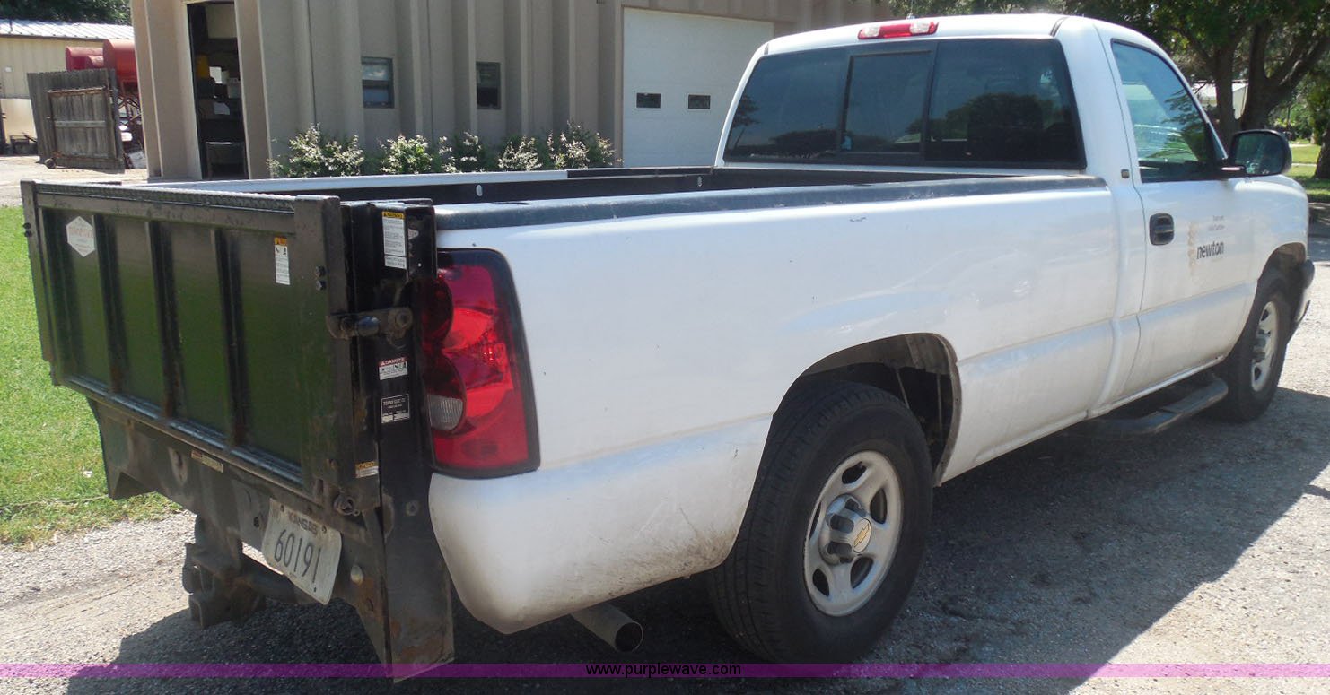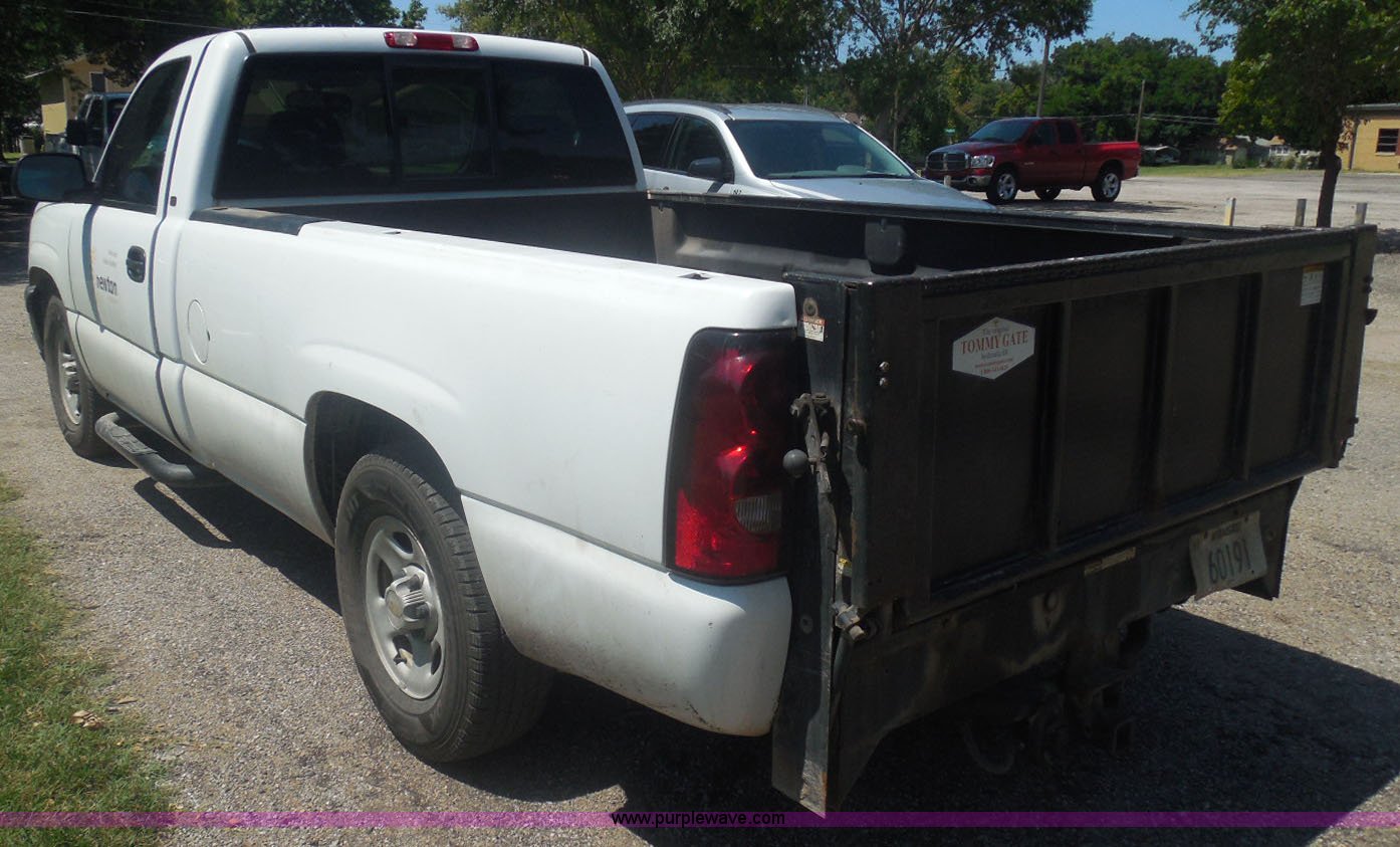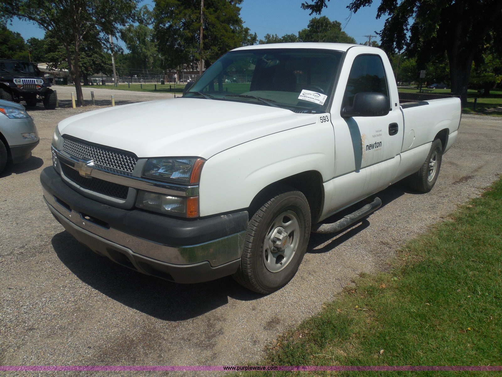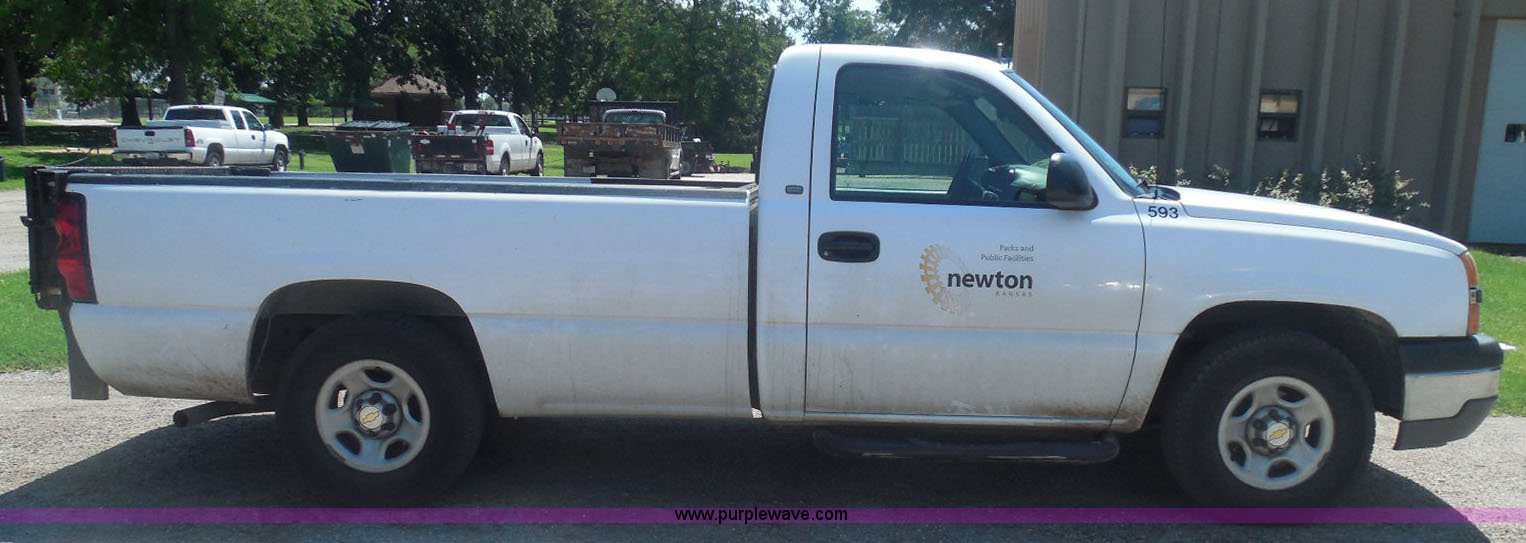 2004 Chevrolet Silverado 1500 pickup truck. 91,967 miles on odometer Miles may vary, still in use, 4.8L V8 OHV 16V gas engine, Automatic transmission, AC and heat, Tilt, Cruise, AM/FM, Manual windows and locks, Vinyl interior, Running boards, Long bed, Tommy hydraulic lift tailgate Model 60-1040, Serial M-330359, Spray-in bed liner, Receiver hitch, Trailer wiring, P245/75R16 tires, Interior/exterior cosmetic damage, Seats torn Repaired with tape, Headliner pulling away and sagging, Two-way radio not included, Decals will be removed prior to auction, Unit# 593. 1GCEC14VX4Z295778. City of Newton. Newton, KS 67114