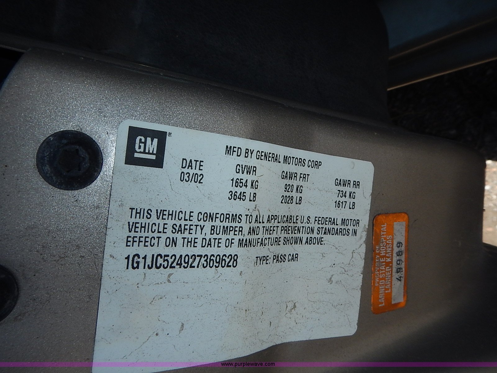 Purple Wave is selling a used Passenger Vehicle in Kansas. This item is a 2002 Chevrolet Cavalier with the following: 201,427 miles on odometer, 2.2L L4 OHV 8V gas engine, Automatic transmission, AC and heat, Tilt, Cruise, AM/FM/CD, Manual windows and locks, Cloth interior, 195/70R14 tires, Flat, Dents, Scratches, Paint peeling on hood, Rust, Structural safety issue at rear tire, Frame near axle damage, Crush/crumple zone affected, Unit# 1380