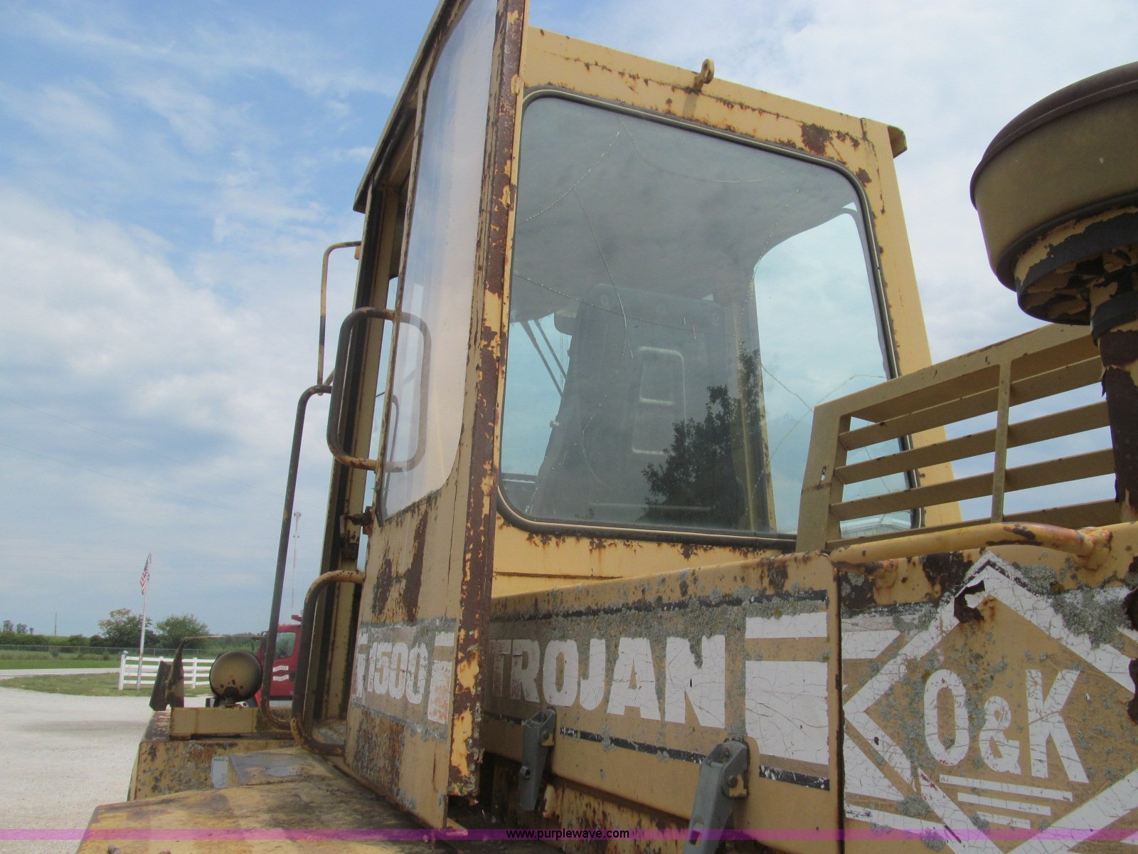 Purple Wave is selling a used Wheel Loader in Missouri. This item is a Trojan 1500Z wheel loader with the following: 6,379 hours on meter, Four cylinder diesel engine, Powershift transmission, 1F-1R gears, Canopy, Suspension seat, Front and rear work lights, Joystick control, 7.5'W bucket, 17.5-25 tires, Interior/exterior cosmetic damage, Lights broken, Window broken, Seat torn, Serial 3128010