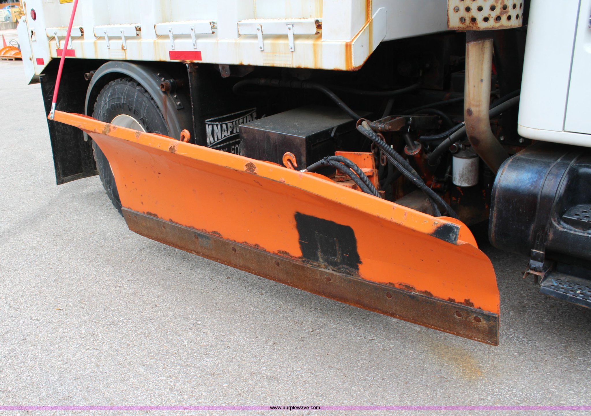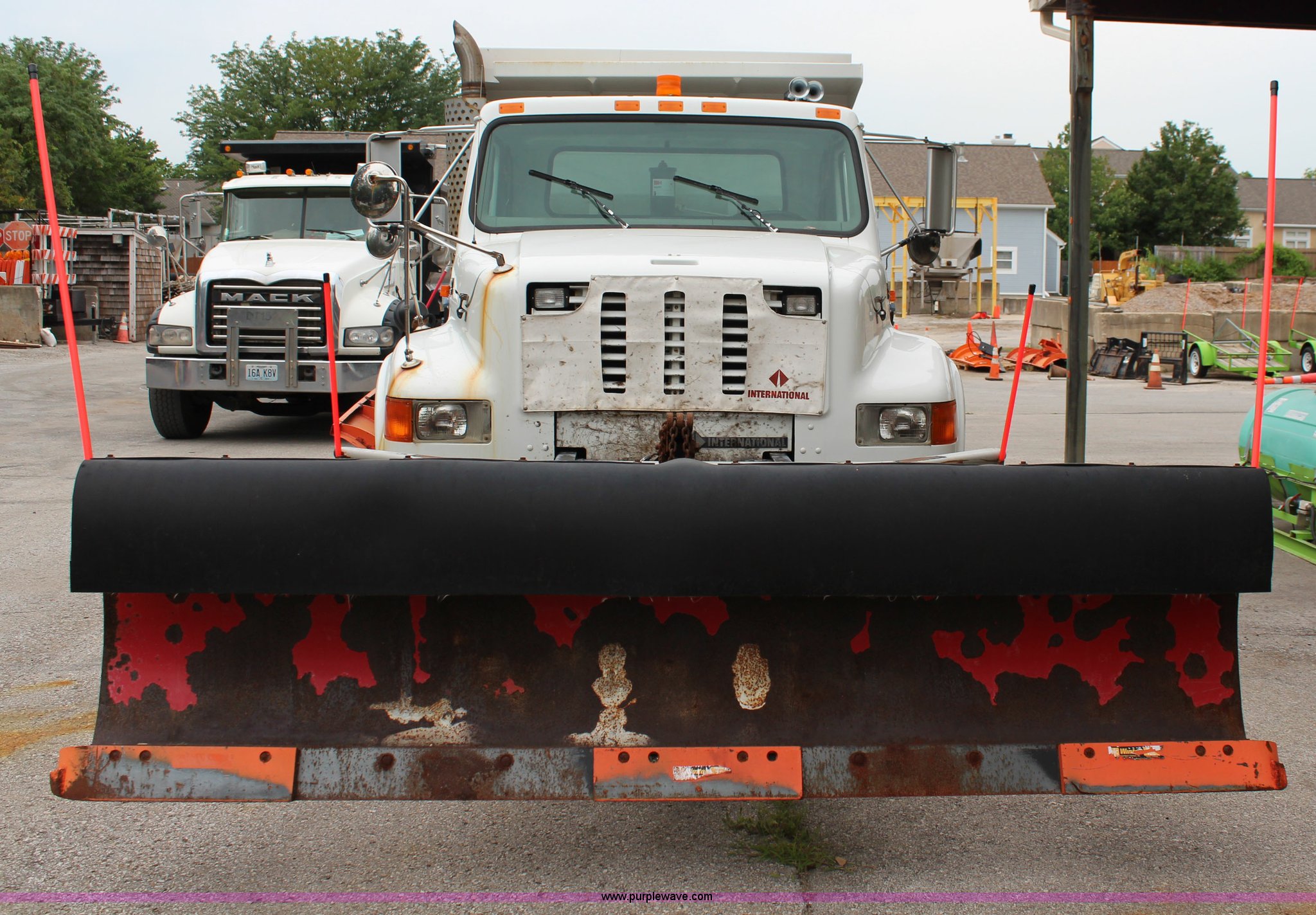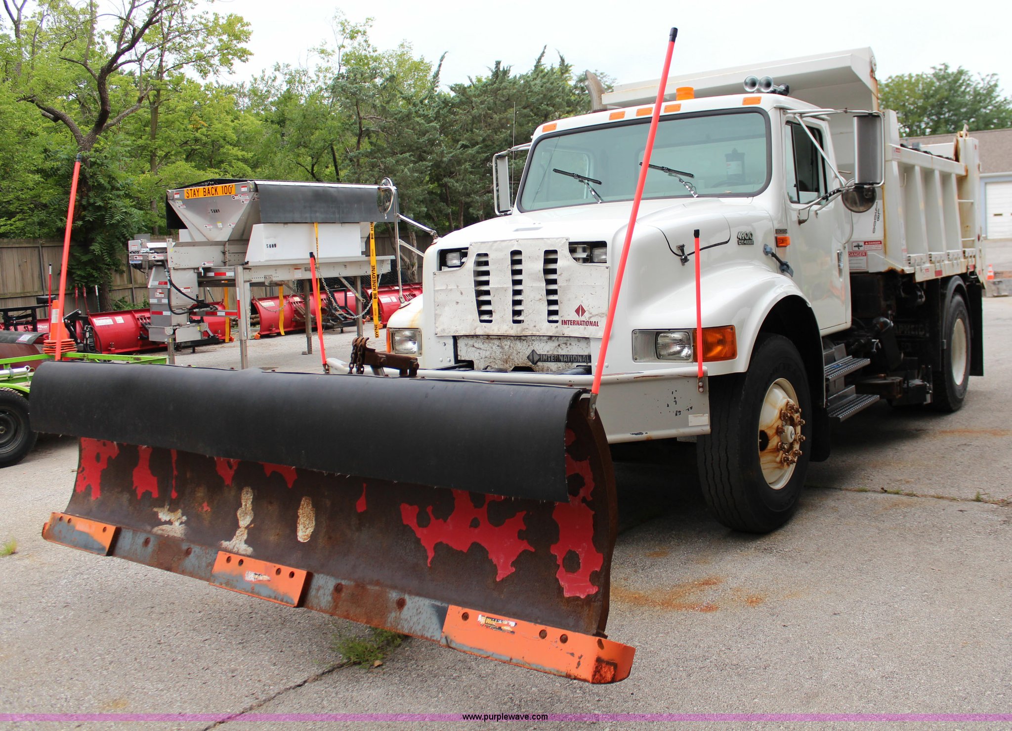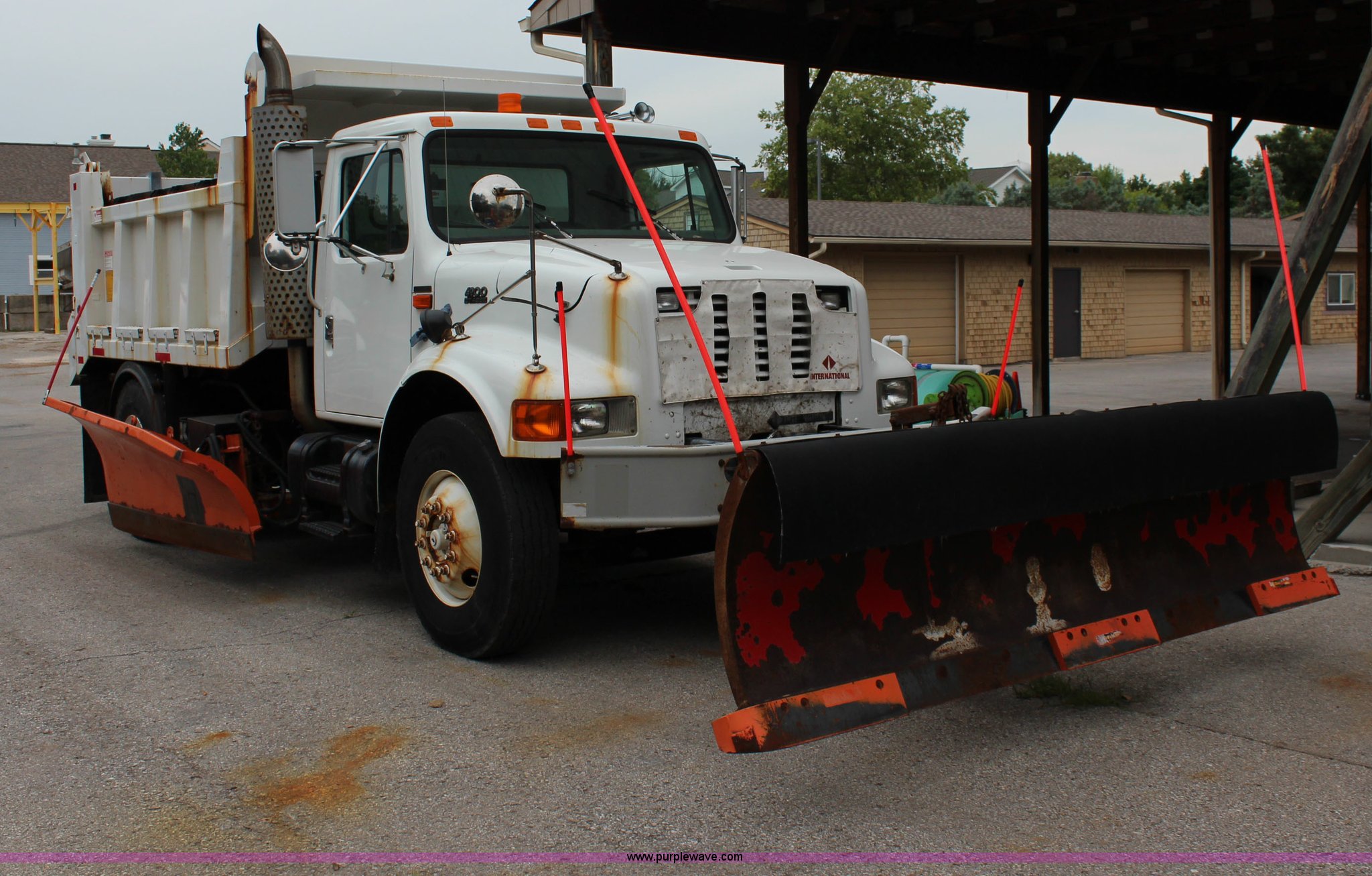 Purple Wave is selling a used Construction Dump Truck in Kansas. This item is a 2000 International 4900 dump truck with the following: 24,195 miles on odometer, 2,572 hours on meter, International DT466E 7.6L L6 diesel engine, 250 HP, Allison automatic transmission, AC and heat, Tilt, Cruise, AM/FM, Telescoping steering wheel, Air suspension seat, Heated mirrors, Backup alarm, 10'W box, Air end gate, Three stage single ram, Western 10' plow, 8'W side mount wing plow, Side discharge spreader, 70 gallon magnesium chloride tank, Bed plate included, Pintle hitch, 50 gallon fuel tank, Front mount PTO, Spring suspension, Air brakes, 12R22.5 tires, GVWR 35,000 lbs