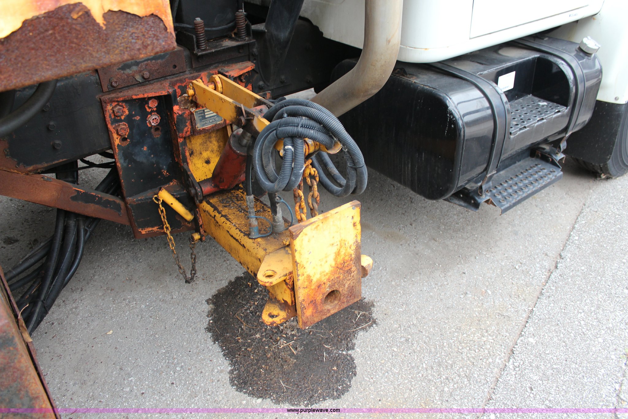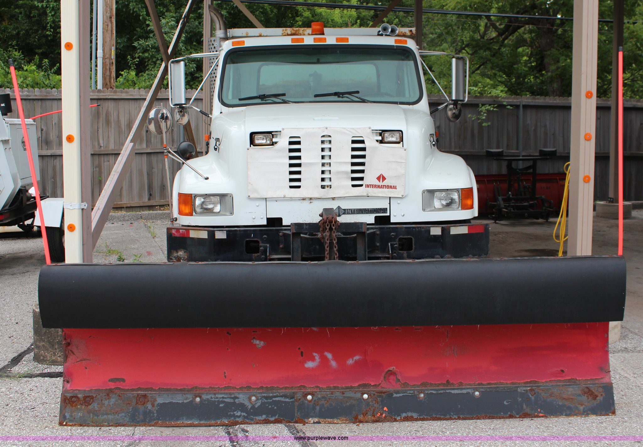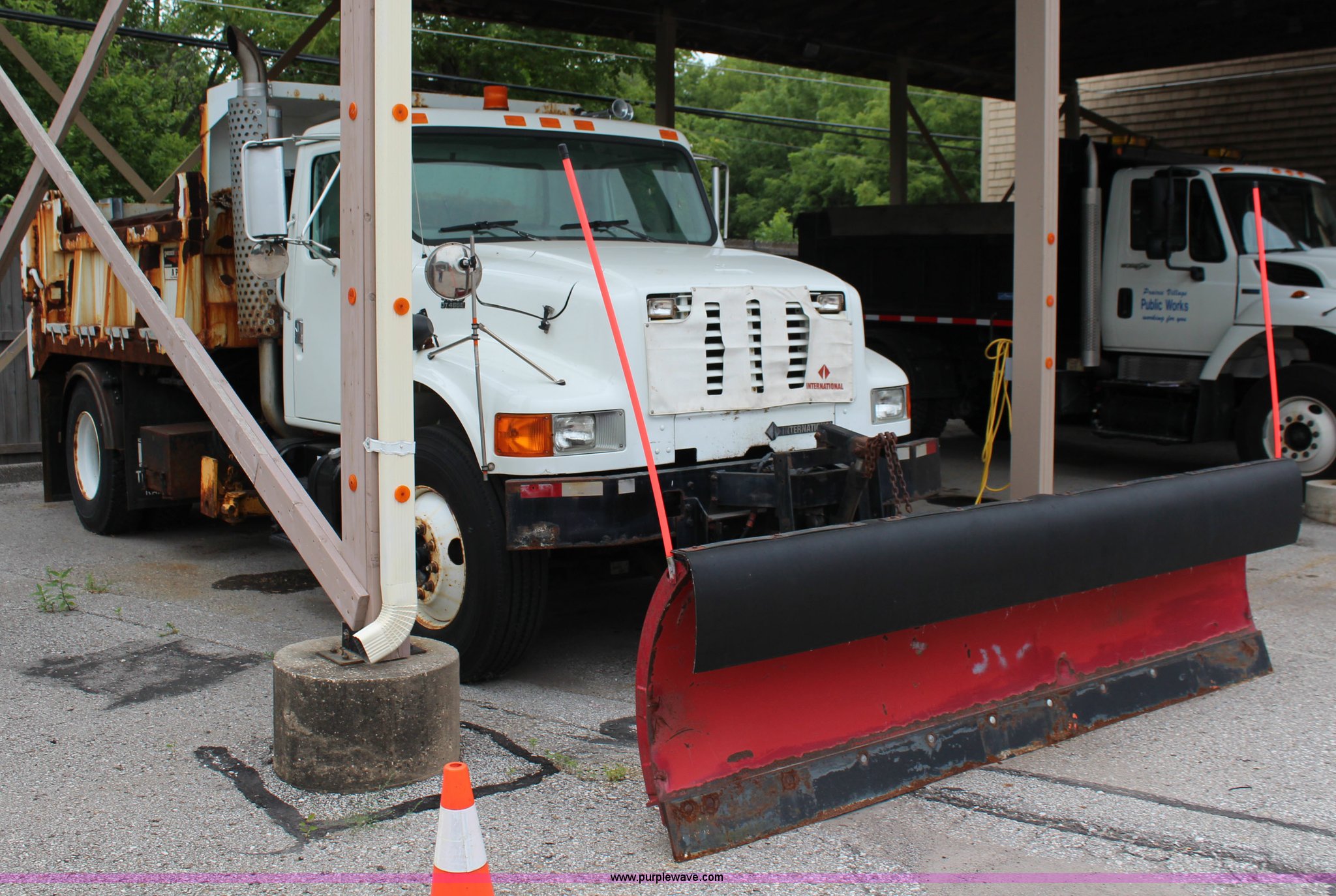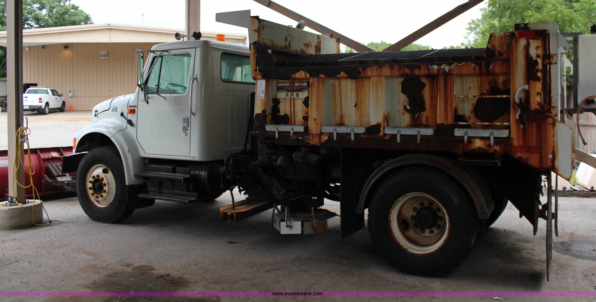 Purple Wave is selling a used Construction Dump Truck in Kansas. This item is a 2001 International 4900 dump truck with the following: 72,899 miles on odometer, 2,256 hours on meter, International DT466 7.6L L6 diesel engine, 250 HP, Allison automatic transmission, AC and heat, Tilt, Cruise, AM/FM, Telescoping steering wheel, Air suspension seat, Heated mirrors, 10' dump bed, Air end gate, Three stage single ram hoist, Western 10' plow, Command All plow control, 8'W wing plow, Side discharge spreader, 70 gallon magnesium chloride tank, Pintle hitch, 50 gallon fuel tank, Front mount PTO, Spring suspension, Air brakes, Brake controller, 12R22.5 tires, GVWR 35,000 lbs, Rust, Starter needs replaced, Hydraulic tank leaks, Has sat for two years