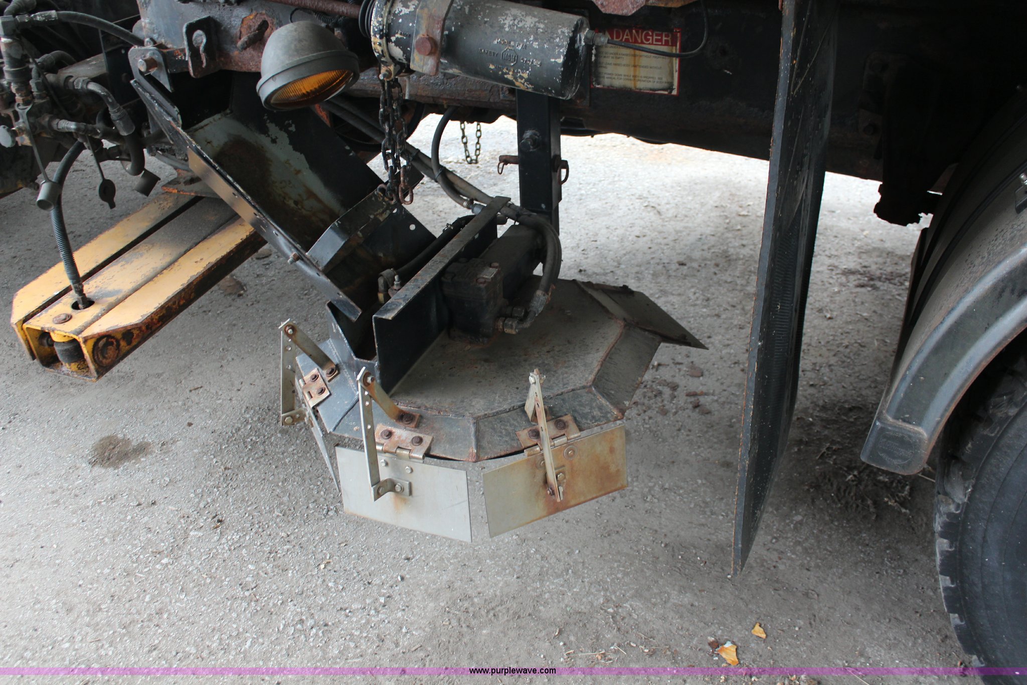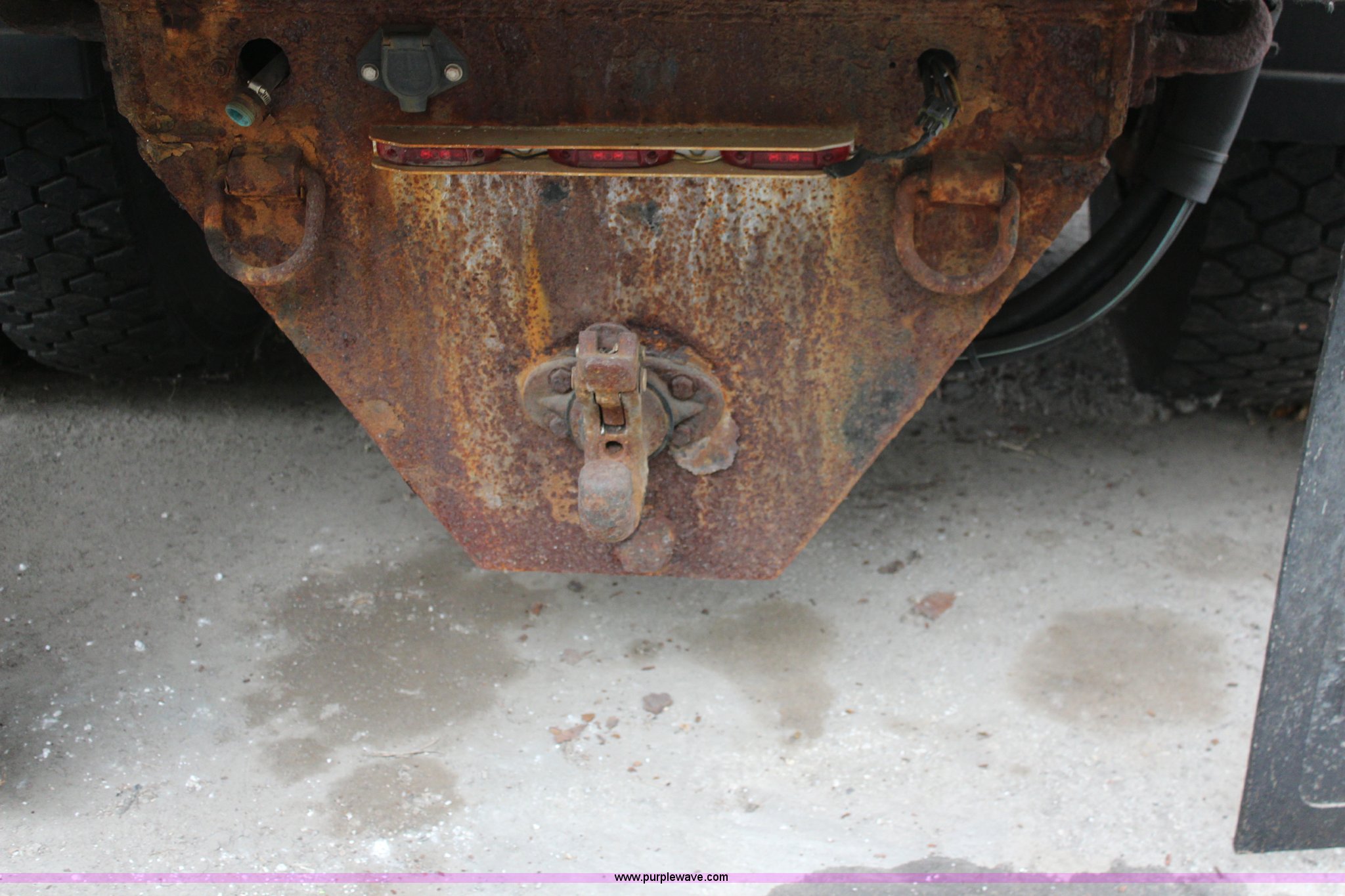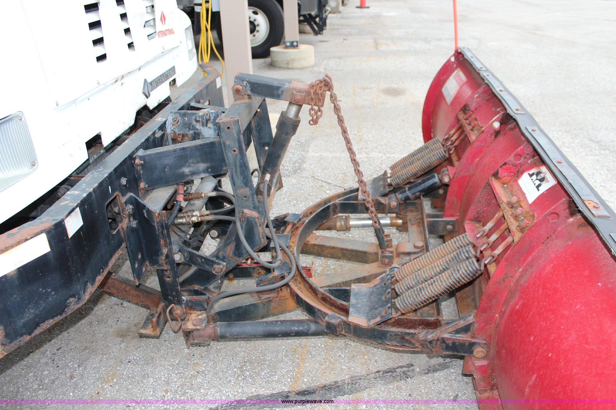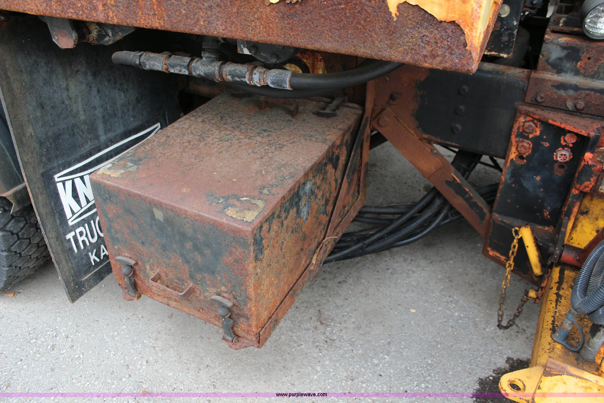 Purple Wave is selling a used Construction Dump Truck in Kansas. This item is a 2001 International 4900 dump truck with the following: 72,899 miles on odometer, 2,256 hours on meter, International DT466 7.6L L6 diesel engine, 250 HP, Allison automatic transmission, AC and heat, Tilt, Cruise, AM/FM, Telescoping steering wheel, Air suspension seat, Heated mirrors, 10' dump bed, Air end gate, Three stage single ram hoist, Western 10' plow, Command All plow control, 8'W wing plow, Side discharge spreader, 70 gallon magnesium chloride tank, Pintle hitch, 50 gallon fuel tank, Front mount PTO, Spring suspension, Air brakes, Brake controller, 12R22.5 tires, GVWR 35,000 lbs, Rust, Starter needs replaced, Hydraulic tank leaks, Has sat for two years