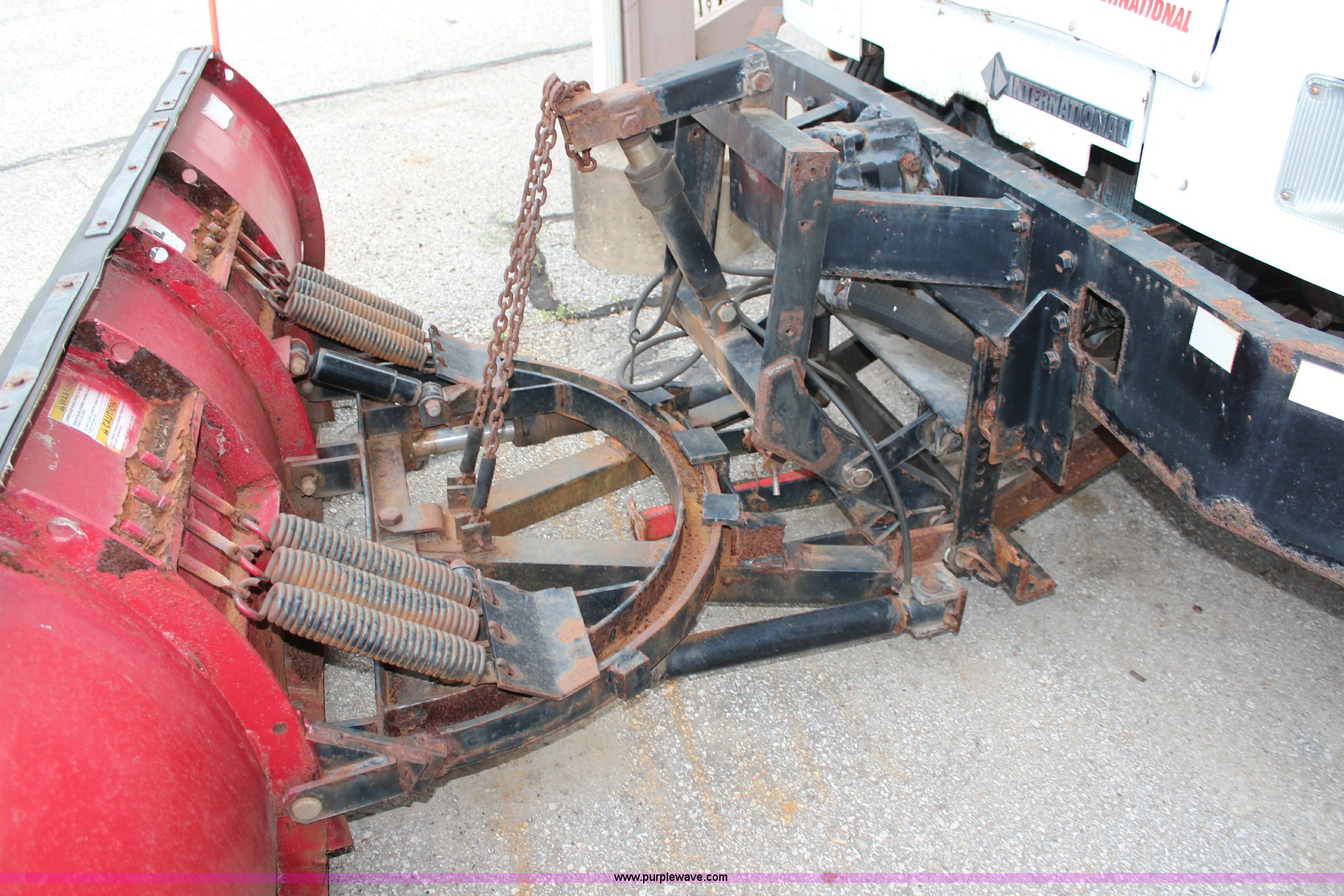 2001 International 4900 dump truck. 72,899 miles on odometer, 2,256 hours on meter, International DT466 7.6L L6 diesel engine 250 HP, Allison automatic transmission, AC and heat, Tilt, Cruise, AM/FM, Telescoping steering wheel, Air suspension seat, Heated mirrors, 10' dump bed Air end gate, Three stage single ram hoist, Western 10' plow, Command All plow control, 8'W wing plow, Side discharge spreader, 70 gallon magnesium chloride tank, Pintle hitch, 50 gallon fuel tank, Front mount PTO, Spring suspension, Air brakes, Brake controller, 12R22.5 tires, GVWR 35,000 lbs, Rust, Starter needs replaced, Hydraulic tank leaks, Has sat for two years. 1HTSDAAR51H362508. City of Prairie Village. 3533 Somerset Dr. Prairie Village, KS 66208