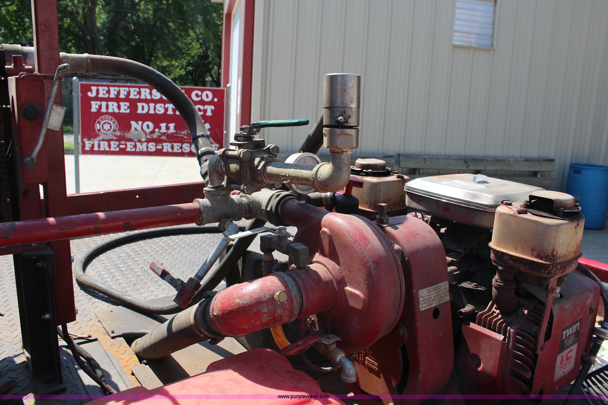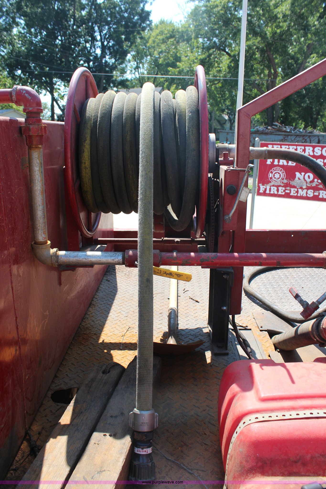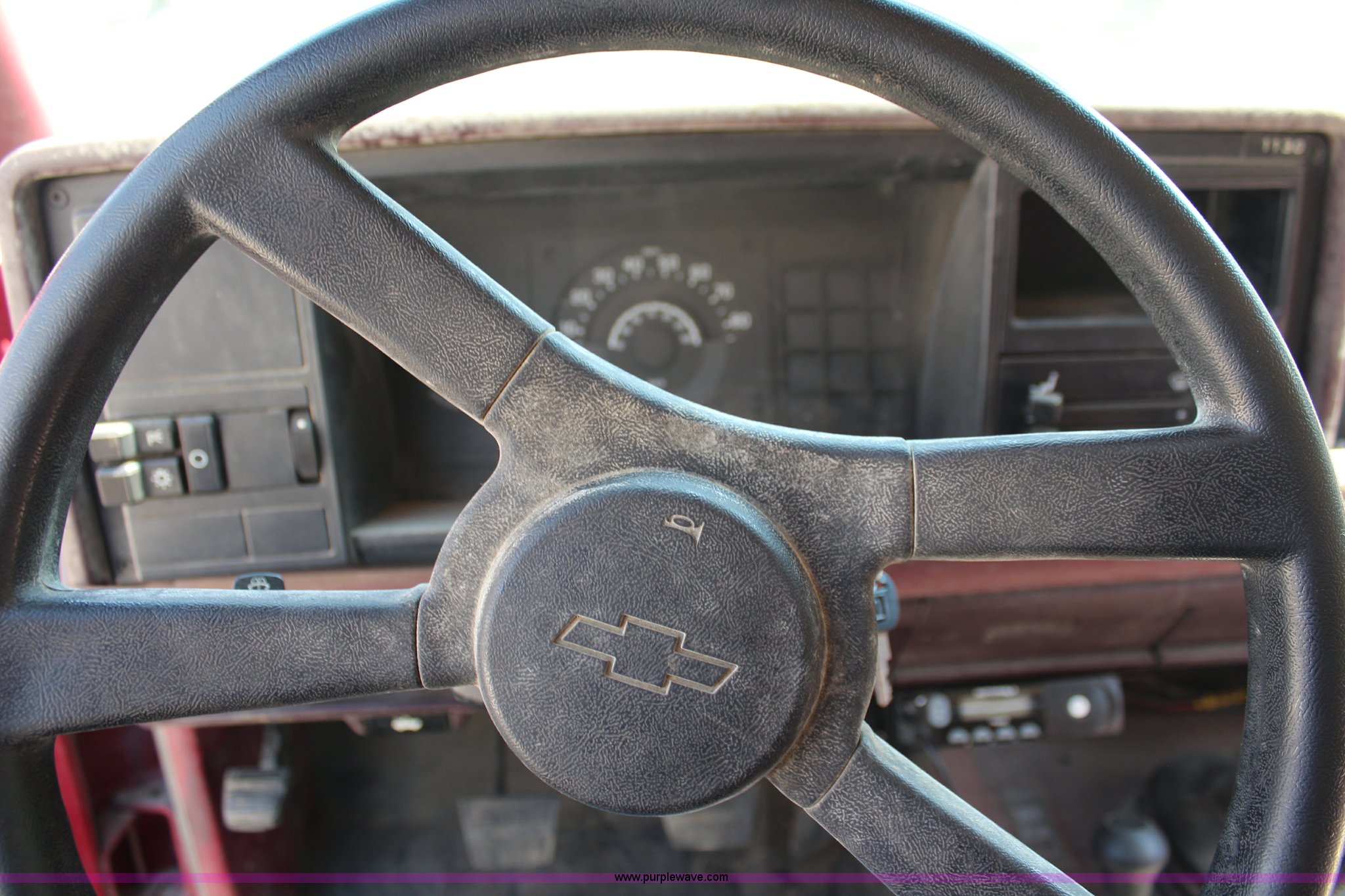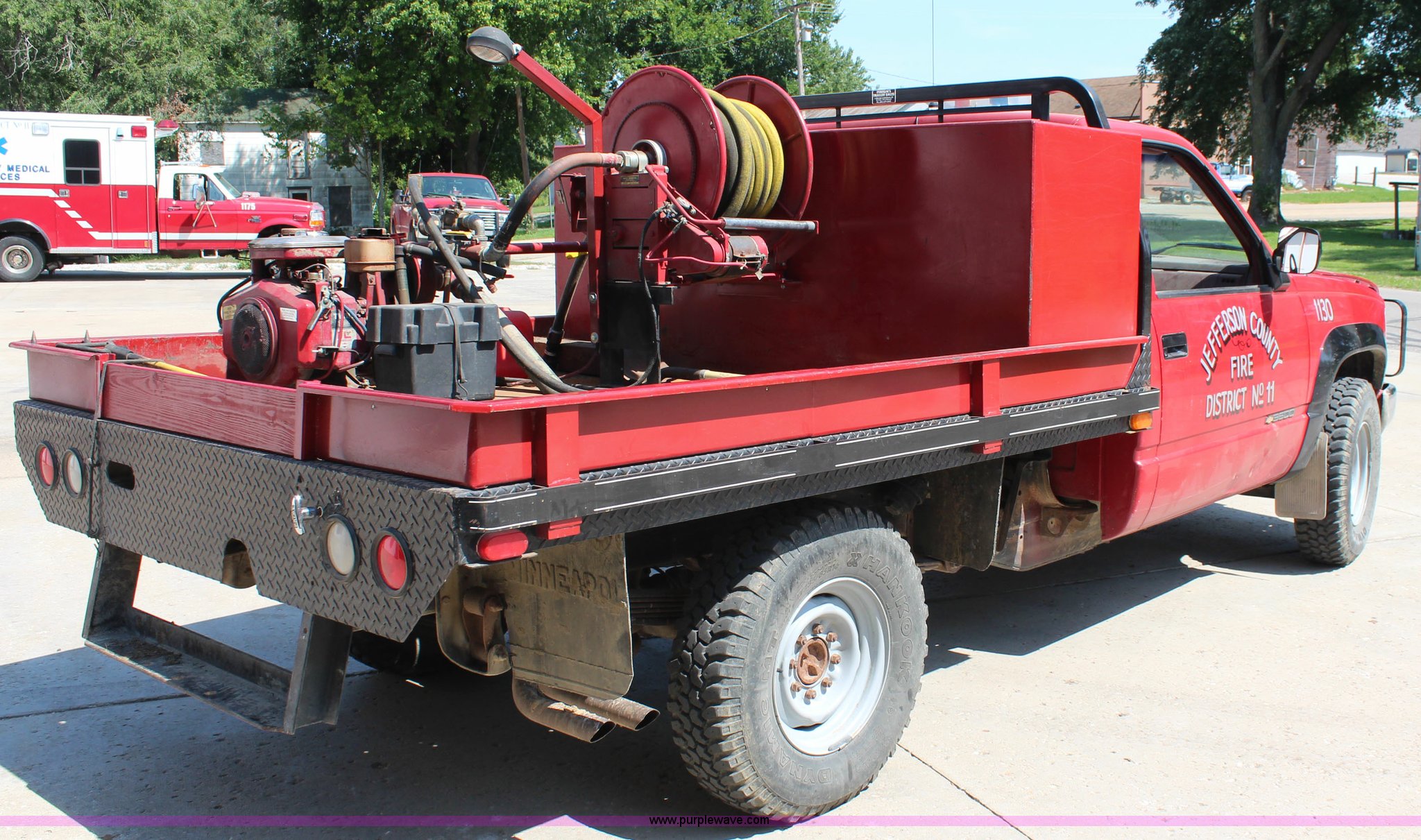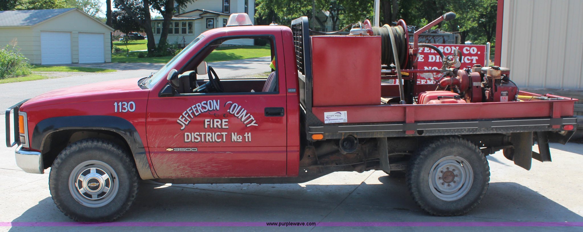 Purple Wave is selling a used Fire Truck or Emergency Vehicle in Kansas. This item is a 1988 Chevrolet Cheyenne 3500 flatbed truck with the following: 23,090 miles on odometer, 5.7L V8 OHV 16V gas engine, Four speed manual transmission, Heat, Manual windows and locks, Vinyl interior, 8.5'L x 84"W flatbed, 5"H side boards, Grill guard, Pump, Hose, Hose reel, Tank, Gas engine, Electric start,, 100 gallon steel water tank, 235/85R16 tires, Unit# 1130