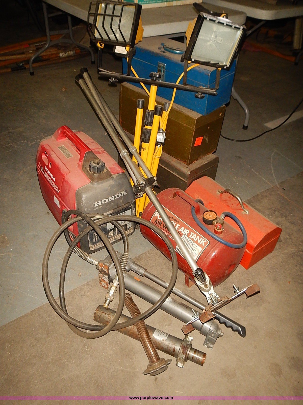 Purple Wave is selling a used Tools in Kansas. This item is a Assorted tools with the following: (4) toolboxes, Drills, Bits, Wrenches, Drill, Screwdrivers, Sockets and more, Work light, Portable air tank, Honda 2000 inverter and more