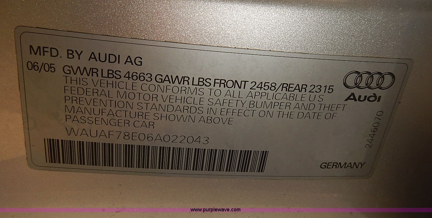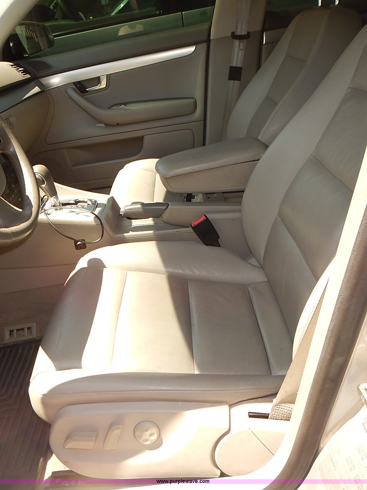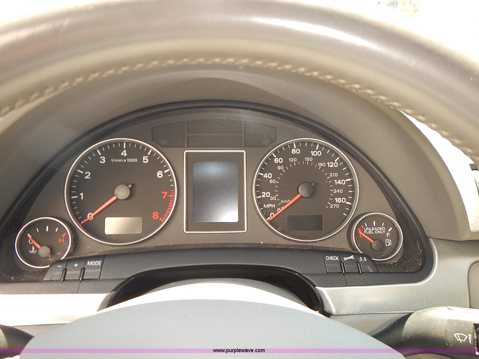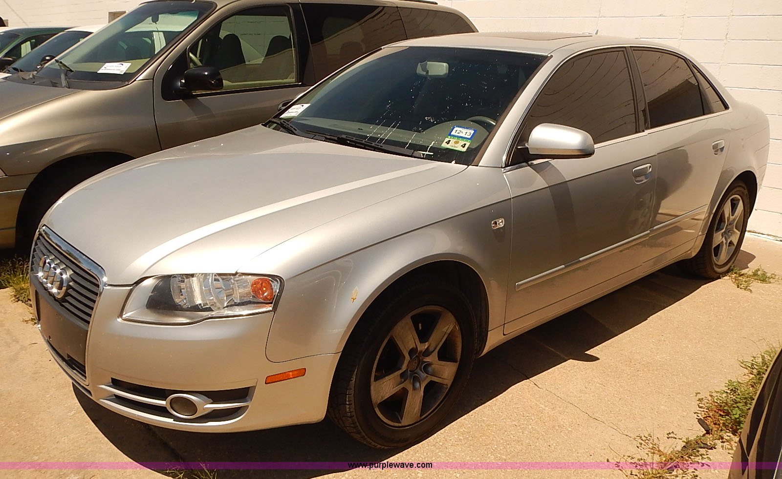 Purple Wave is selling a used Passenger Vehicle in Kansas. This item is a 2006 Audi A4 2.0T with the following: Last odometer reading 96,691 miles, 2.0L L4 DOHC 16V turbo gas engine, Automatic transmission, AC and heat, Cruise, Power windows, locks, mirrors, and seats, Vinyl interior, Moonroof, Fog lamps, 215/55R16 tires, Unknown running condition, Battery dead, Dents, Scratches