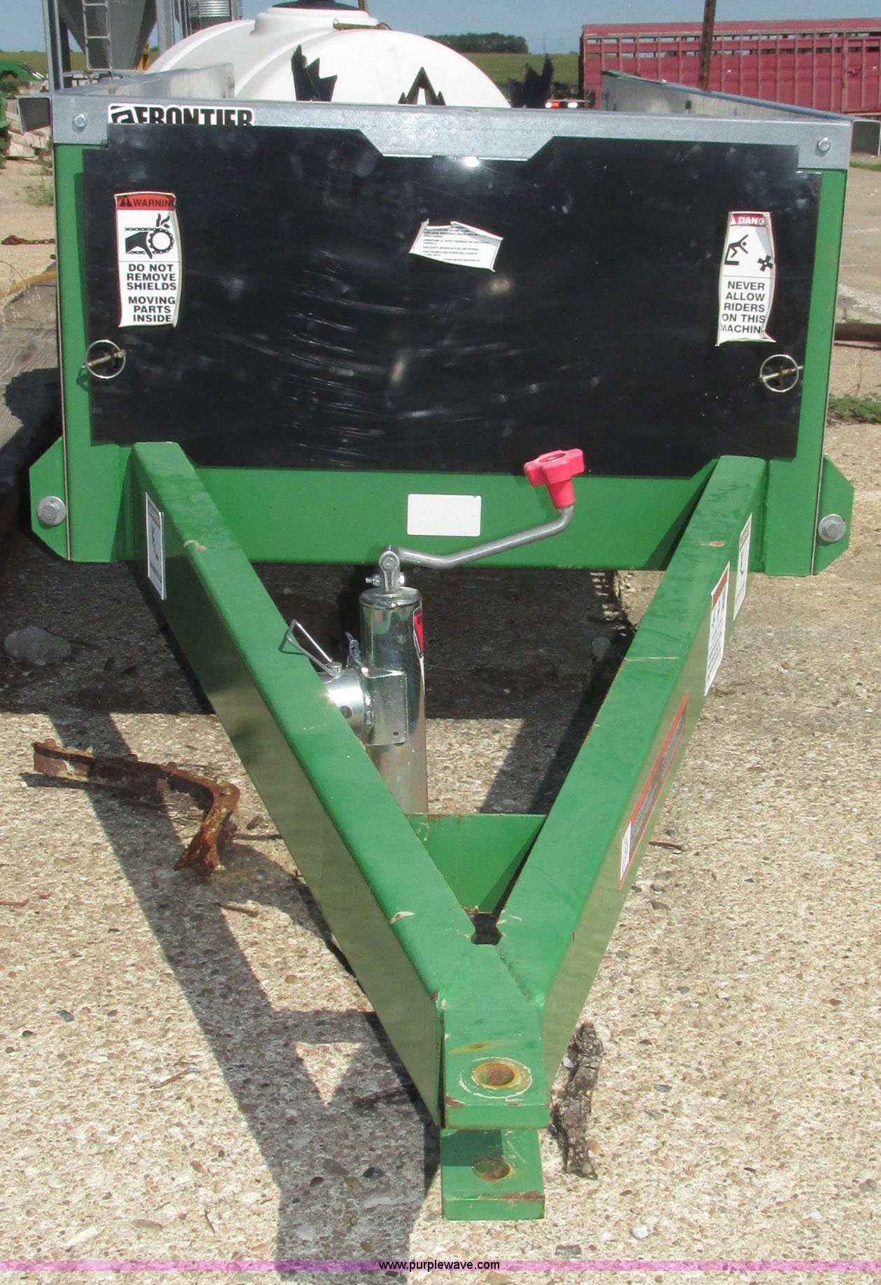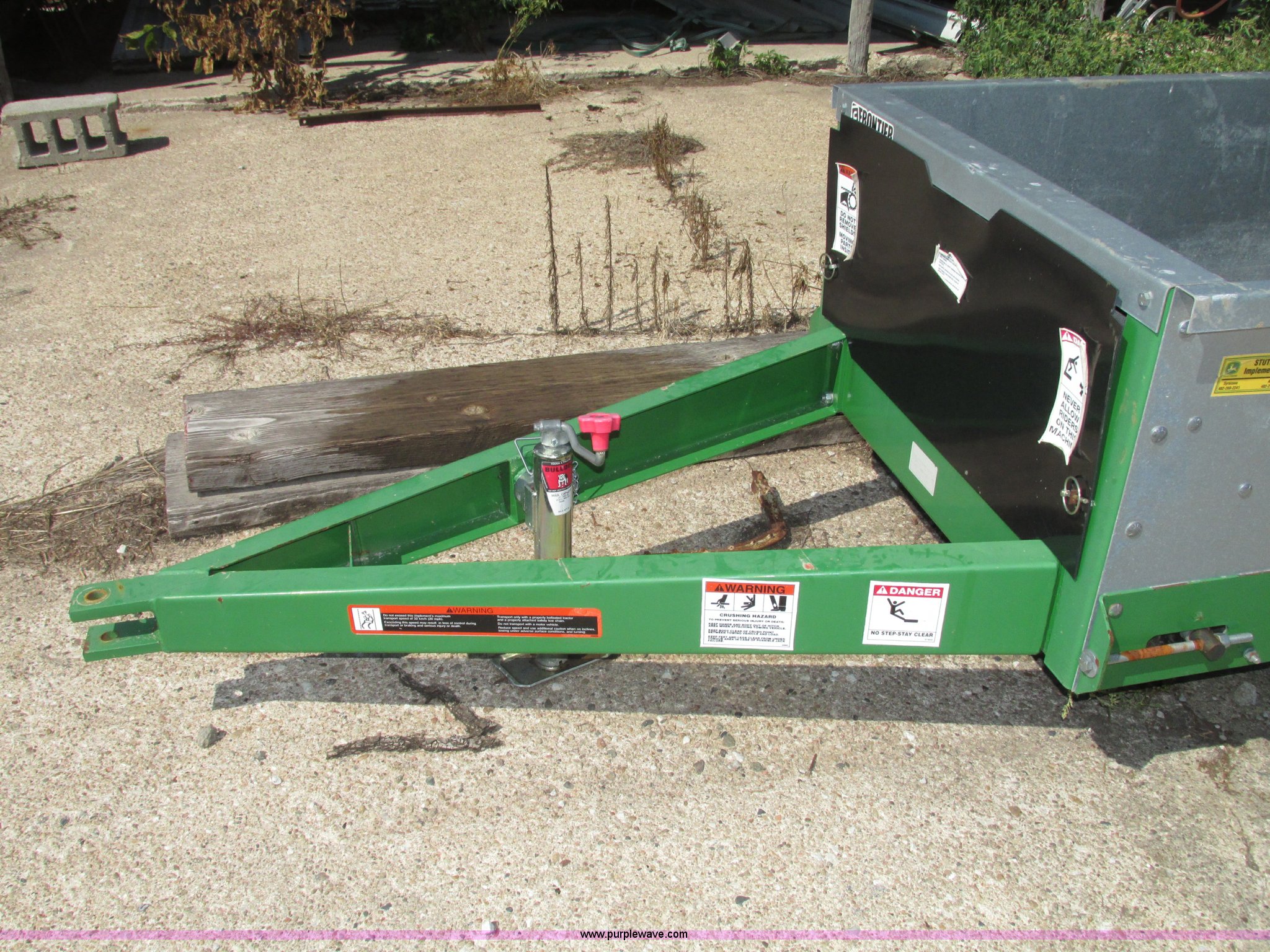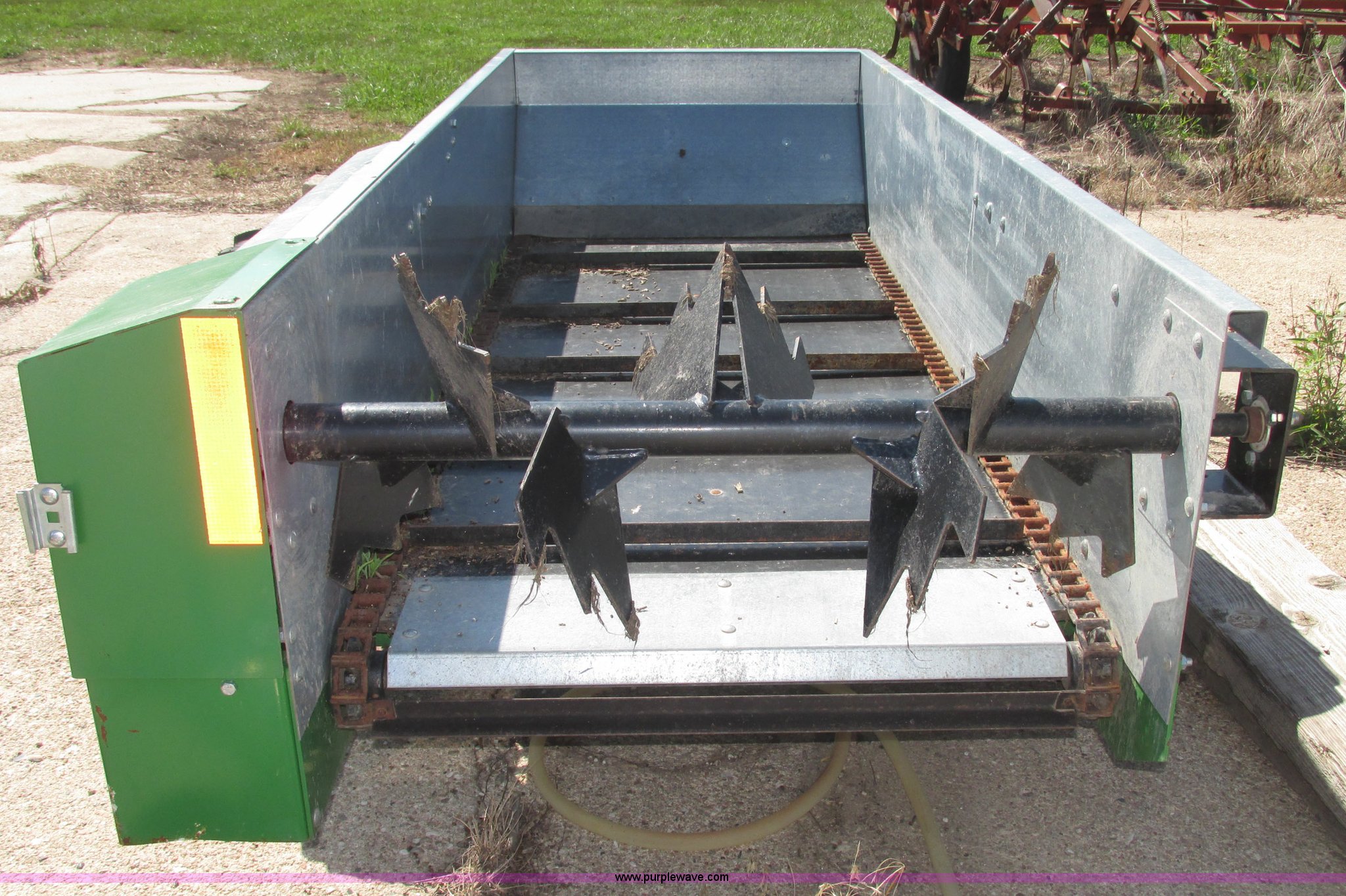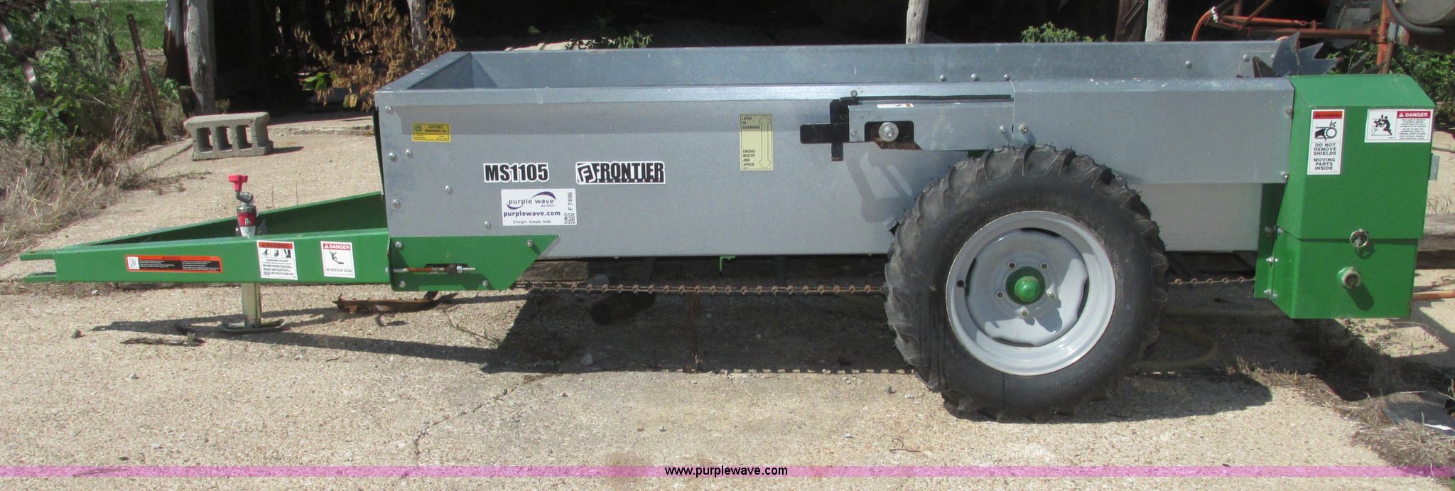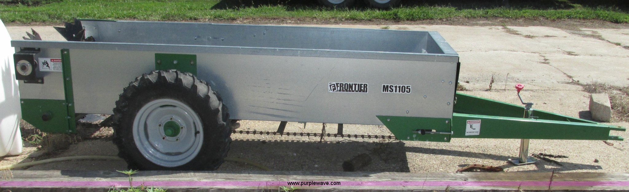 Purple Wave is selling a used Manure Spreader in Nebraska. This item is a 2013 Frontier MS1105 manure spreader with the following: 78"L x 36"W floor, 90"L front wall to front of beaters, 75 bushel capacity, Pin hitch, Eight section beater bar, Apron floor chain, Bulldog jack, 2,000 lbs capacity, Firestone 7.60-15 tires, Owner's manual, Serial HCM511056800845