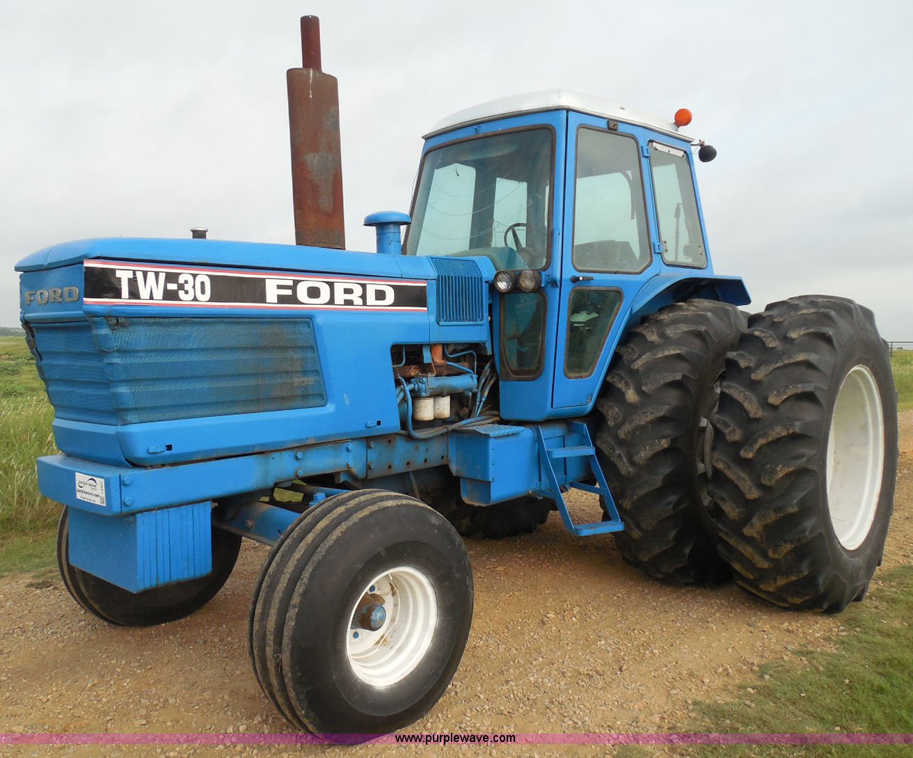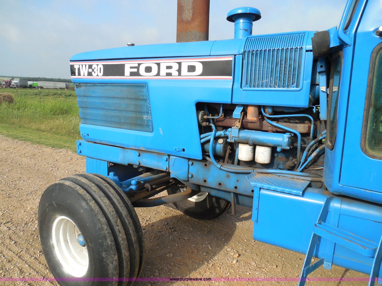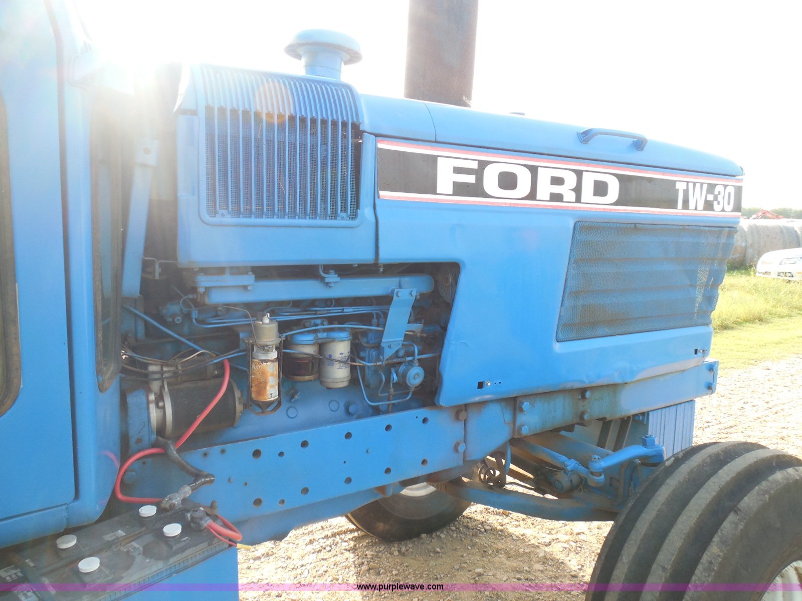 Purple Wave is selling a used Tractor in Texas. This item is a Ford TW30 tractor with the following: 4,258 hours on meter, Ford six cylinder diesel engine, Serial SH951669, Manual transmission, 8F-2R gears, Hi-Lo ranges, AC and heat, Tilt steering wheel, Three point, Draw bar, 1000 PTO, (3) rear hydraulic remote sets, (12) suitcase weights, Wheel weights, 14L-16.1 front tires, 20.8-38 rear tires, Interior cosmetic damage, Windshield scratched by wiper blades, No headliner