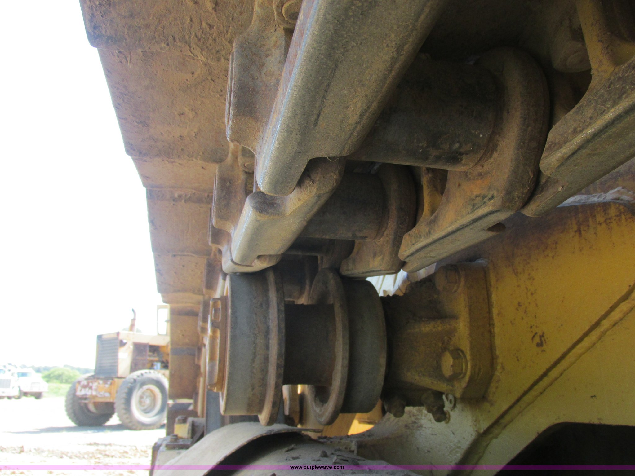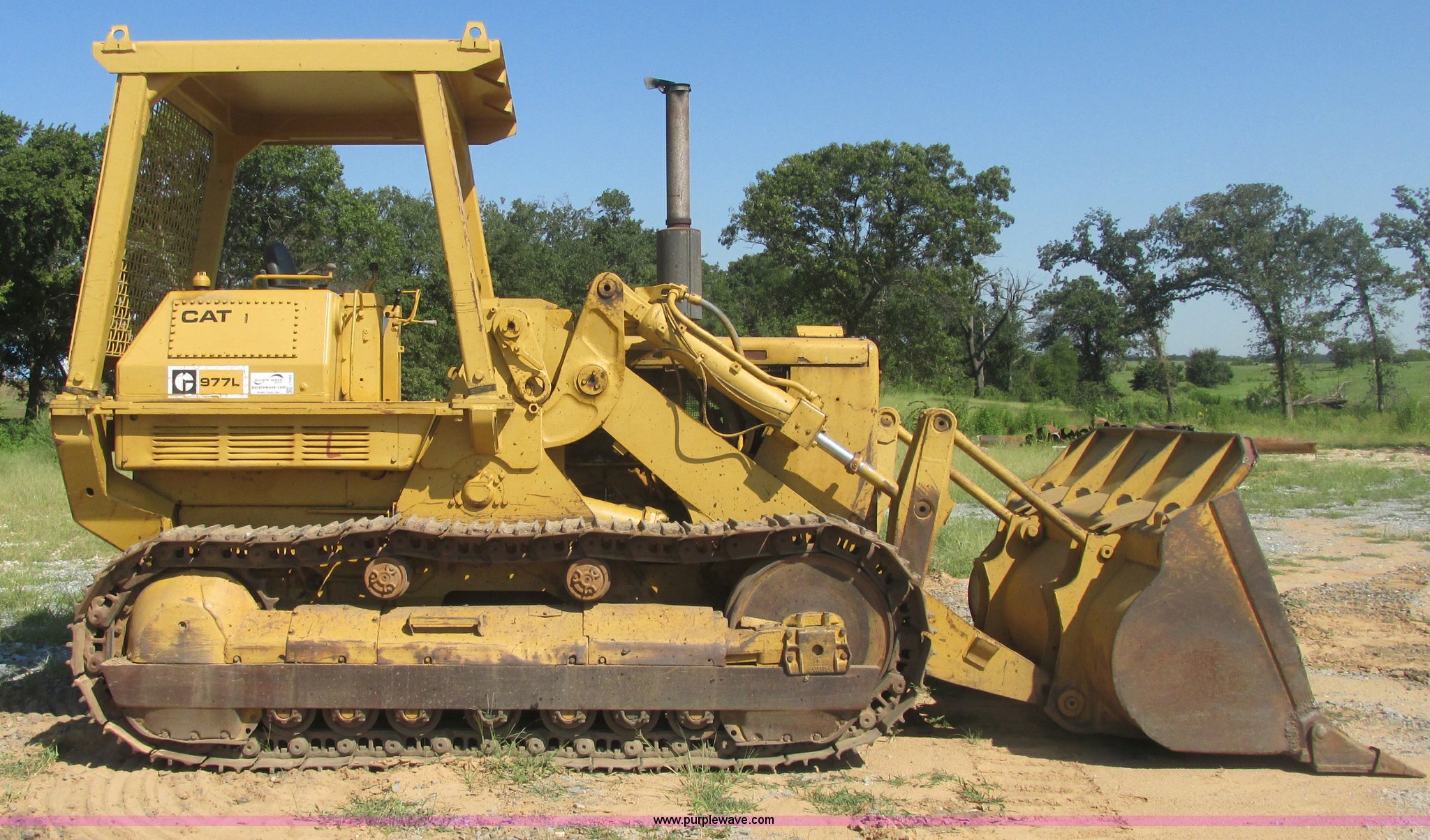 Purple Wave is selling a used Crawler Loader in Oklahoma. This item is a Caterpillar 977L track loader with the following: 3,215 hours on meter, Caterpillar 3306 six cylinder turbo diesel engine, Powershift transmission, 3F-3R gears, Clutch brake pedal steering, OROPS, Suspension seat, Front work lights, Rear screen guard, Engine enclosures, 8'W bucket, 3.5 cubic yard capacity, 9.5" x 3.5" bolt-on teeth, Rear ripper valve control, 18"W triple grouser track pads, Serial 11K8363
