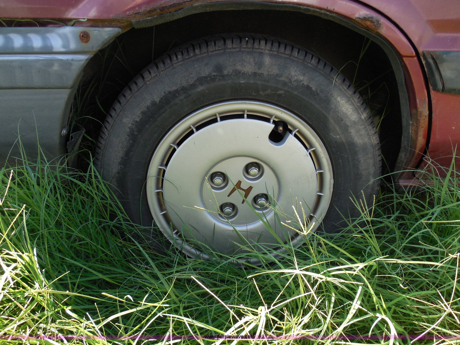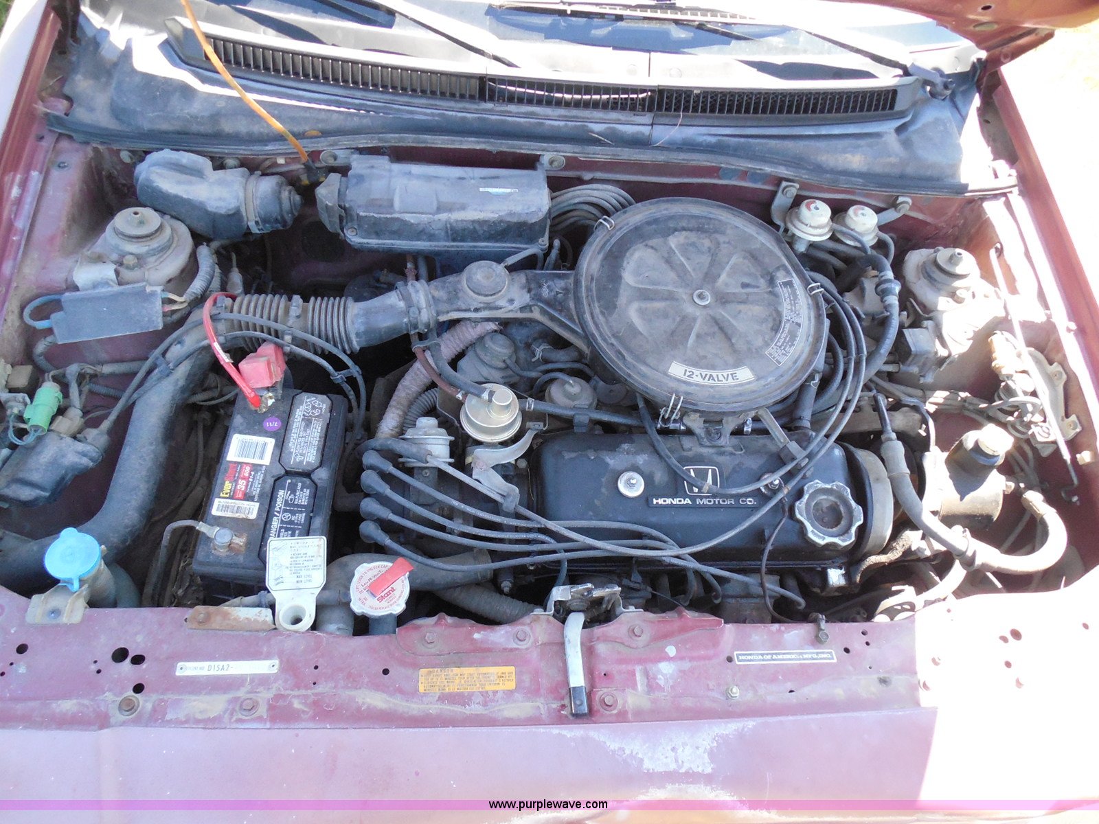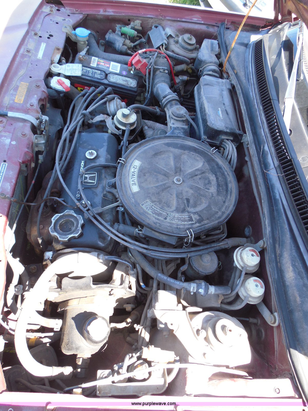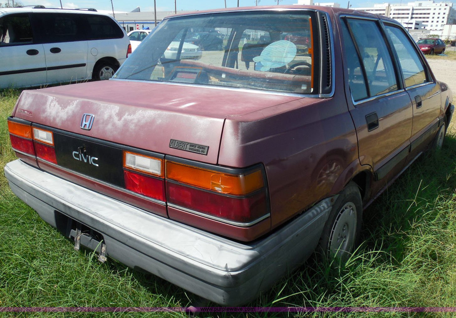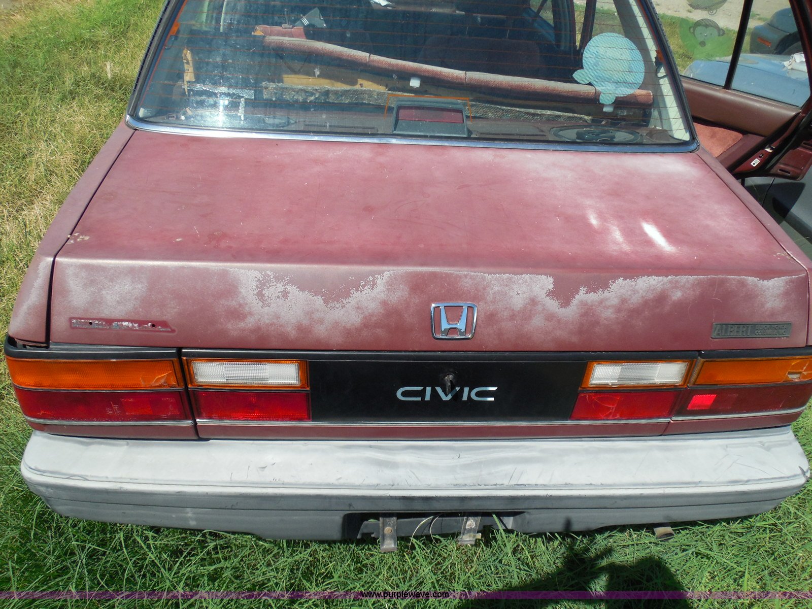 Purple Wave is selling a used Wrecked and Abandoned in Kansas. This item is a 1987 Honda Civic with the following: 68,076 miles on odometer, 1.5L L4 SOHC 16V gas engine, Automatic transmission, Manual windows and locks, Cloth interior, Keys, (3) P175/70R13 tires, Left rear tire has doughnut spare tire installed, Interior/exterior cosmetic damage, Cracked windshield, Paint damage, Missing headliner, Hail damage, Body panel damage, Rust, Left rear tire and wheel missing, Case# 14C43753