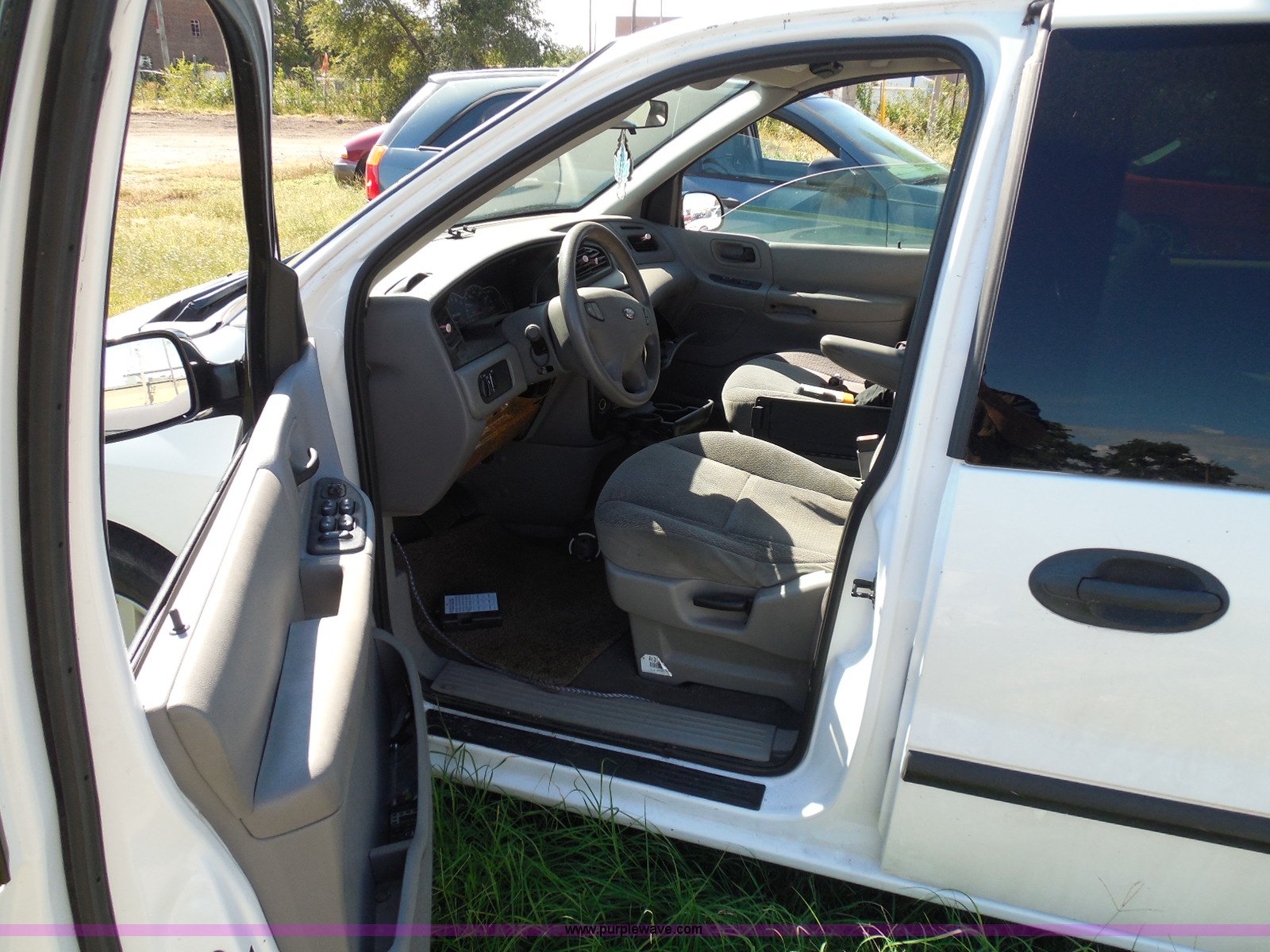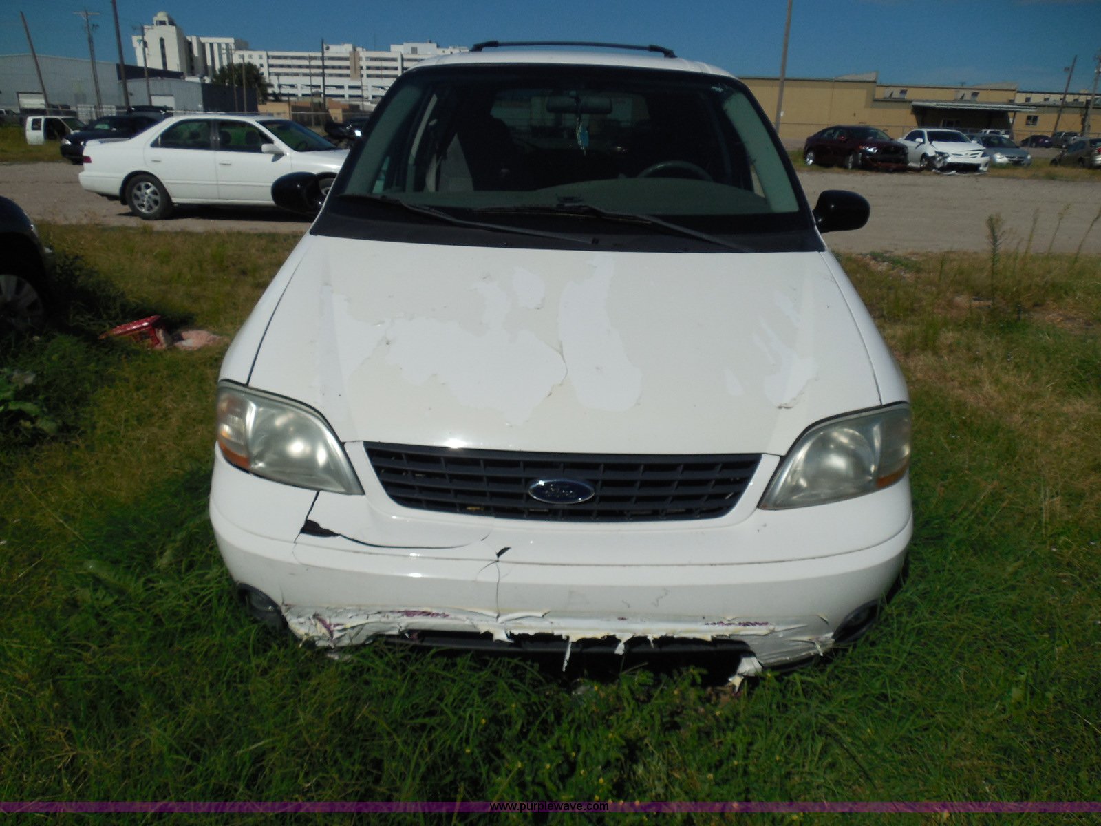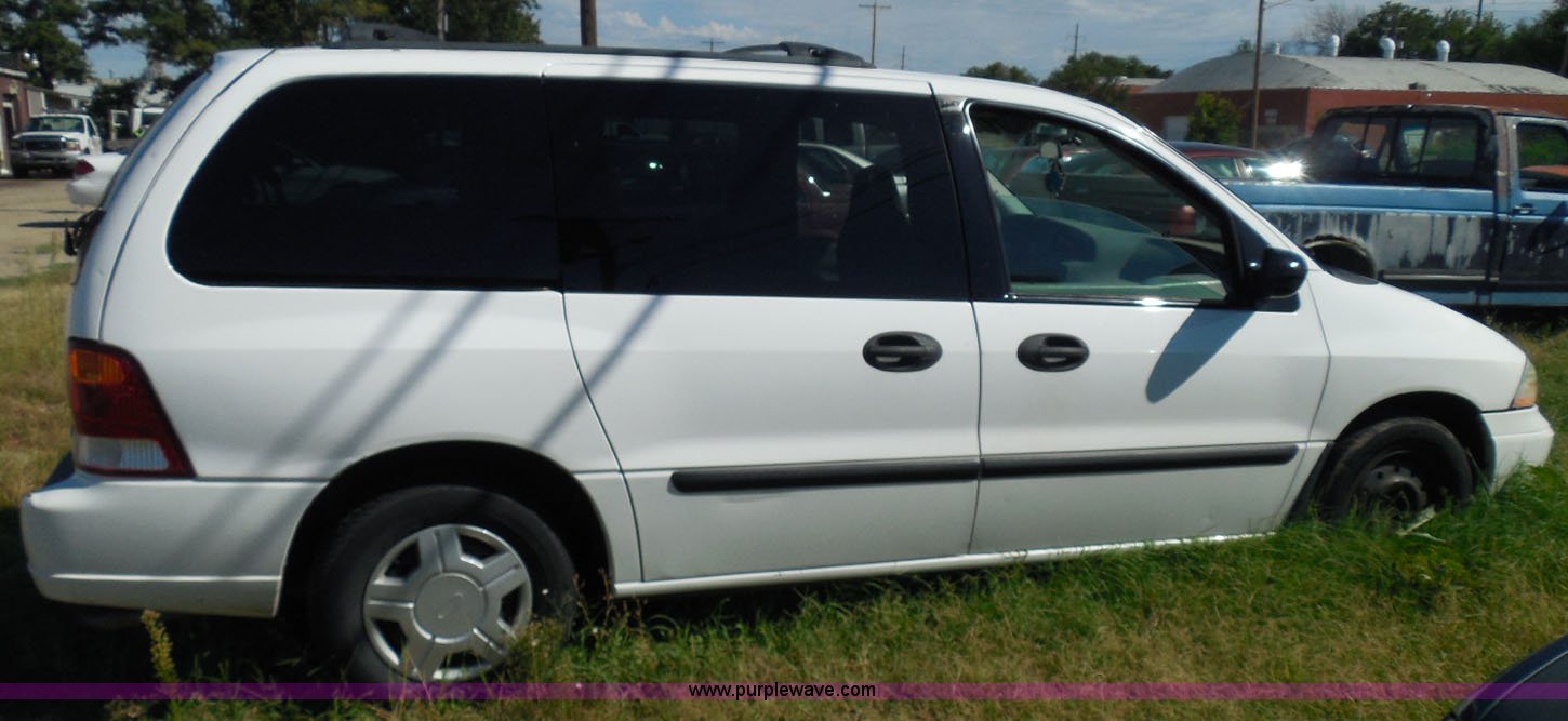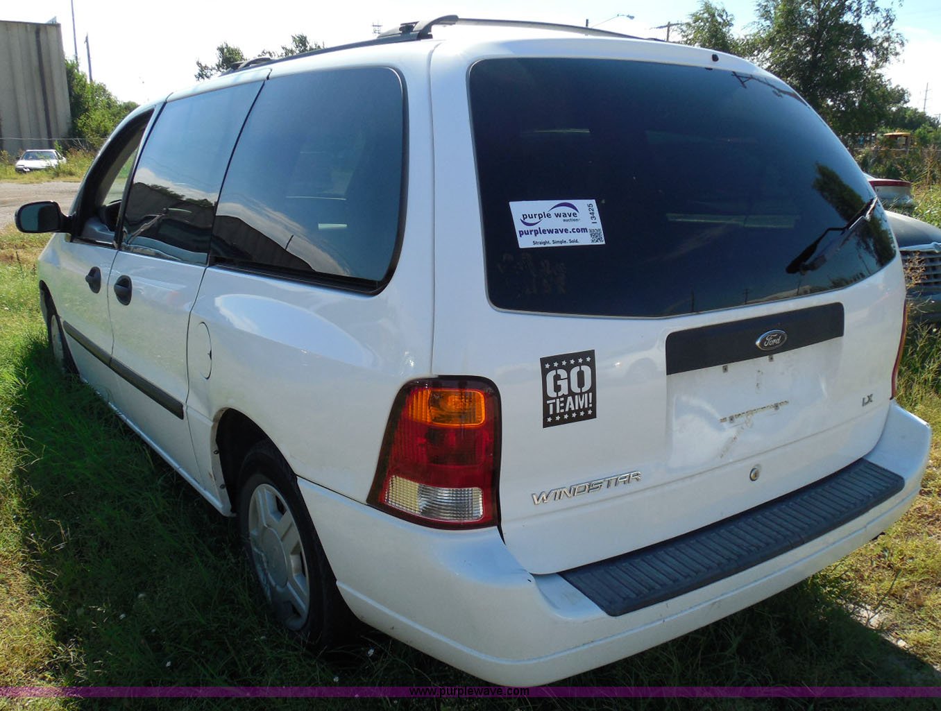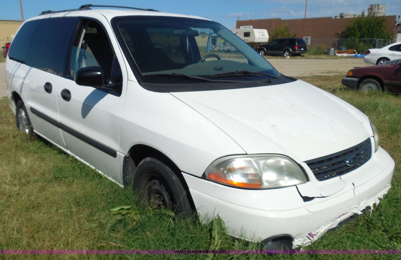 Purple Wave is selling a used Wrecked and Abandoned in Kansas. This item is a 2003 Ford Windstar LX van with the following: Unknown miles on odometer, 3.8L V6 OHV 12V gas engine, Automatic transmission, Phase Linear AM/FM/CD, Power windows, locks, and mirrors, Cloth interior, Keys, Rear climate control, Dual sliding side doors, Luggage rack, 215/70R15 tires, Interior/exterior cosmetic damage, Front windows rolled down, Interior exposed to weather, Rear seat missing, Interior panel under steering wheel missing, Hail damage, Clear coat peeling, Front bumper damage, Rust, Case# 14C45103