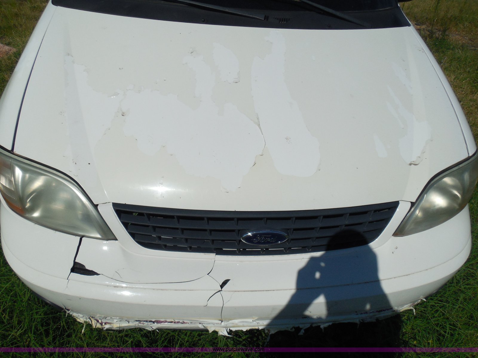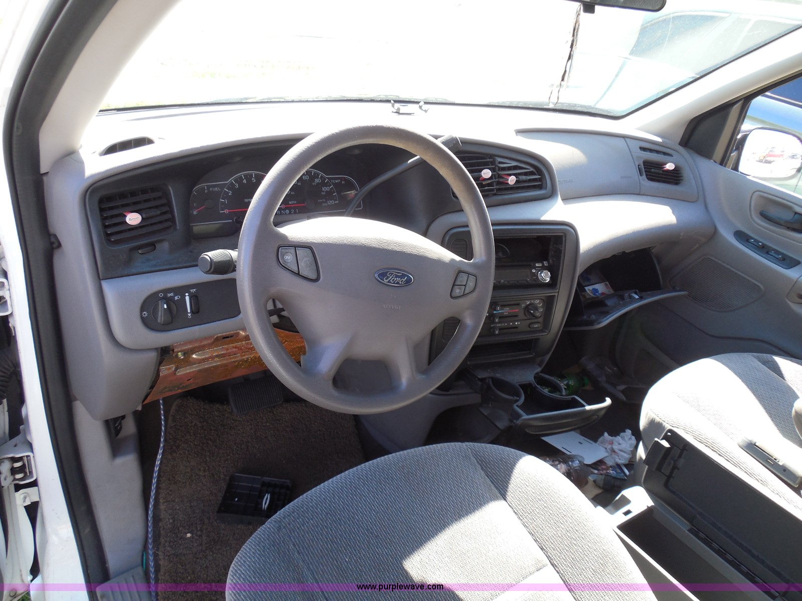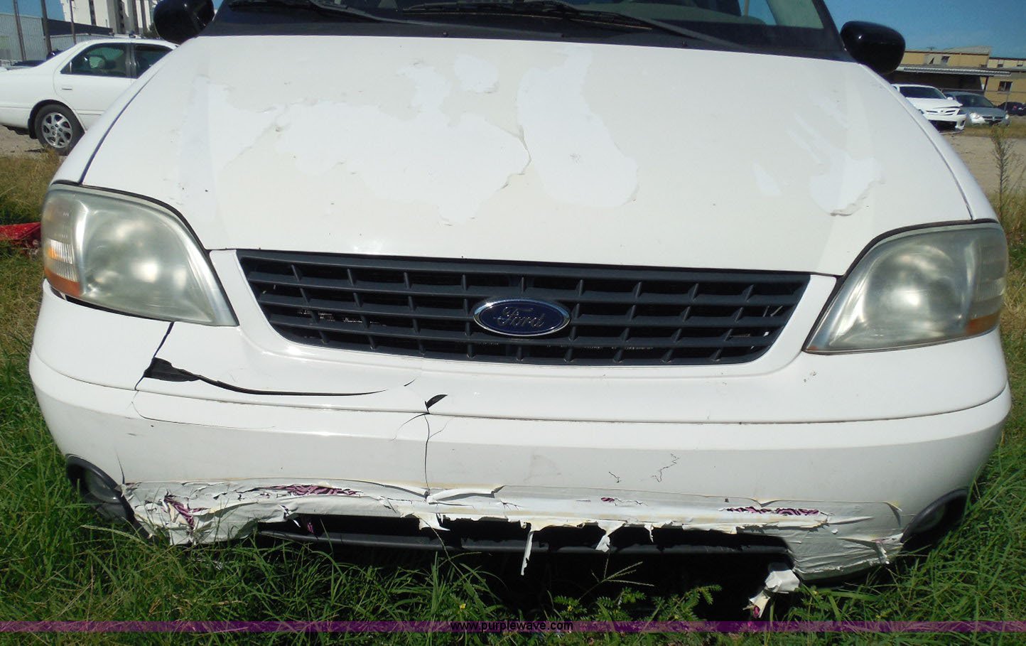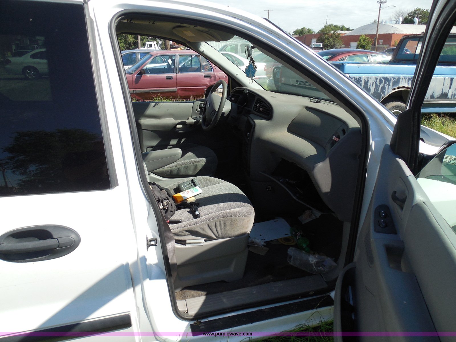 Purple Wave is selling a used Wrecked and Abandoned in Kansas. This item is a 2003 Ford Windstar LX van with the following: Unknown miles on odometer, 3.8L V6 OHV 12V gas engine, Automatic transmission, Phase Linear AM/FM/CD, Power windows, locks, and mirrors, Cloth interior, Keys, Rear climate control, Dual sliding side doors, Luggage rack, 215/70R15 tires, Interior/exterior cosmetic damage, Front windows rolled down, Interior exposed to weather, Rear seat missing, Interior panel under steering wheel missing, Hail damage, Clear coat peeling, Front bumper damage, Rust, Case# 14C45103
