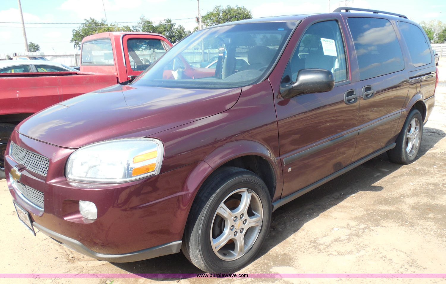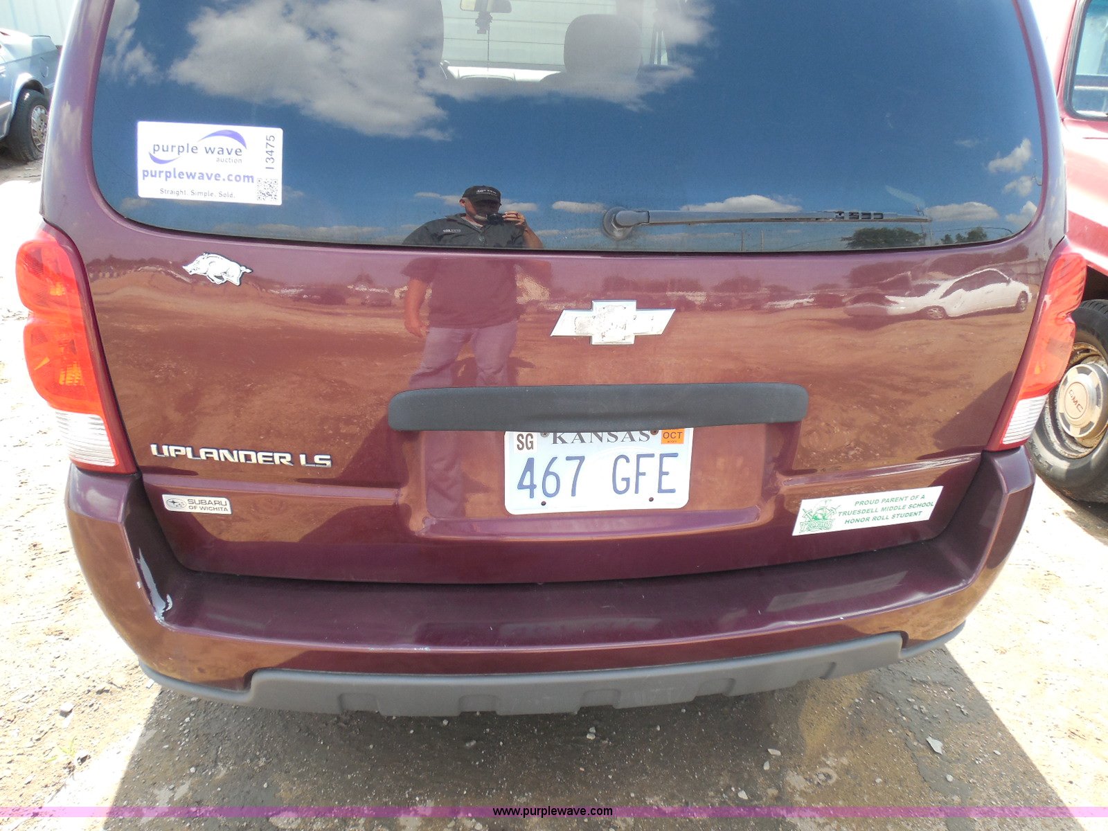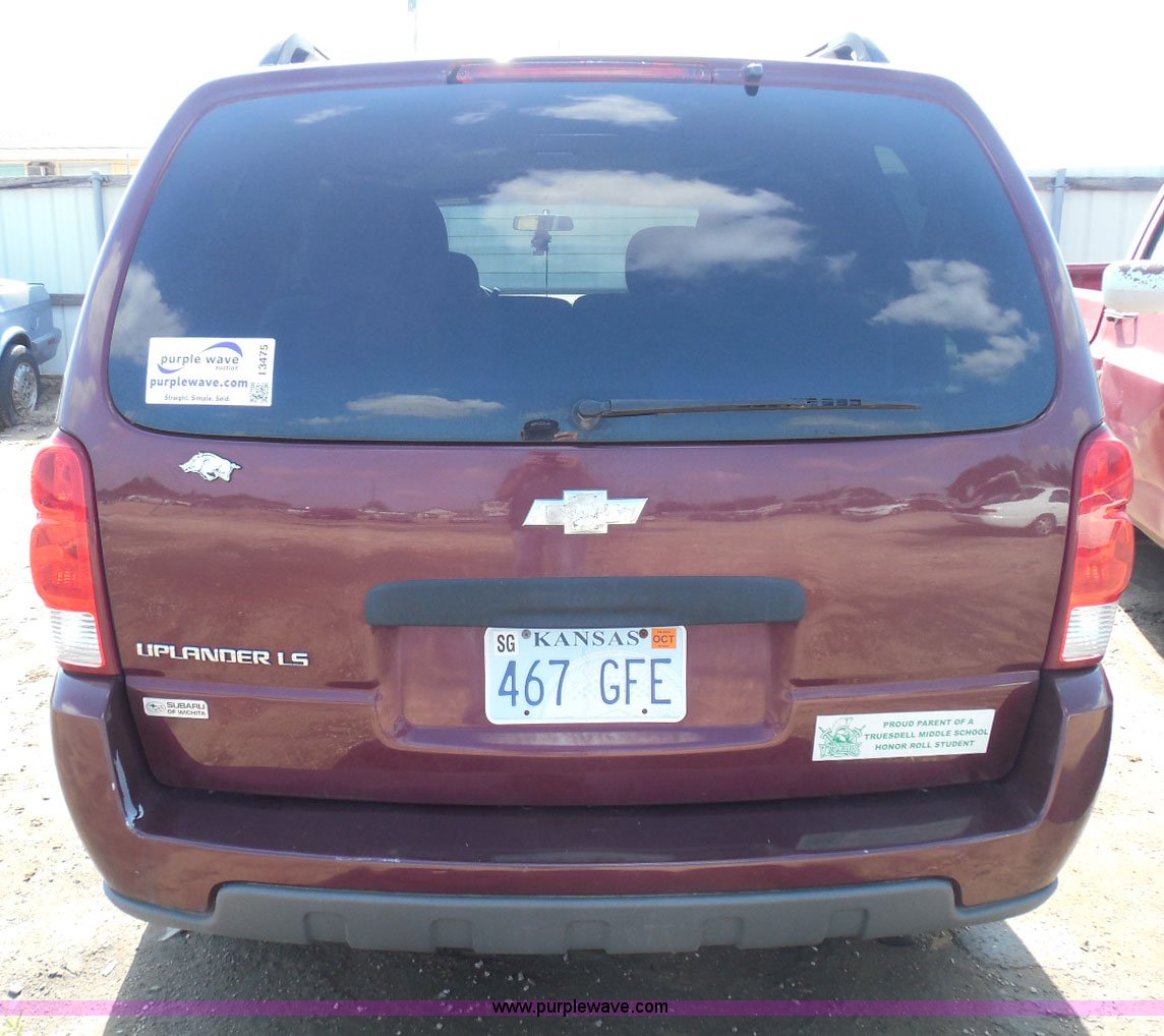 Purple Wave is selling a used Wrecked and Abandoned in Kansas. This item is a 2007 Chevrolet Uplander LS van with the following: Unknown miles on odometer, 3.9L V6 DOHC 24V gas engine, Automatic transmission, AM/FM/CD, Power windows, locks, mirrors, and seats, Cloth interior, Alloy wheels, P225/60R17 tires, Interior/exterior cosmetic damage, Glove box door missing, Tailgate damage, Paint peeling on rear bumper, Scratches, Right rear tire flat, Case# 14C039374