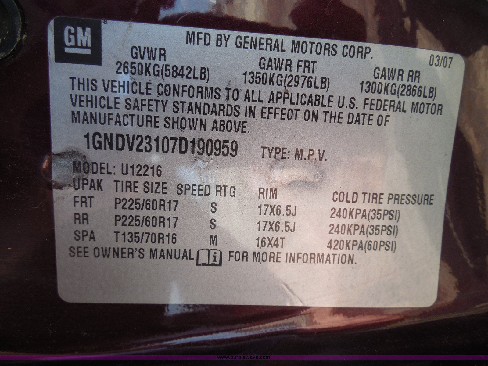 2007 Chevrolet Uplander LS van. Unknown miles on odometer, 3.9L V6 DOHC 24V gas engine, Automatic transmission, AM/FM/CD, Power windows, locks, mirrors, and seats, Cloth interior, Alloy wheels, P225/60R17 tires, Interior/exterior cosmetic damage, Glove box door missing, Tailgate damage, Paint peeling on rear bumper, Scratches, Right rear tire flat, Case# 14C039374. Vehicle is abandoned. Condition and history are unknown. No additional information is available. Vehicle does not have keys unless notated otherwise in the item listing.. View City Of Wichita Terms for title acquisition and item removal requirements.. 1GNDV23107D190959. Arrow Wrecker Service. 531 E MacArthur. Wichita, KS 67216
