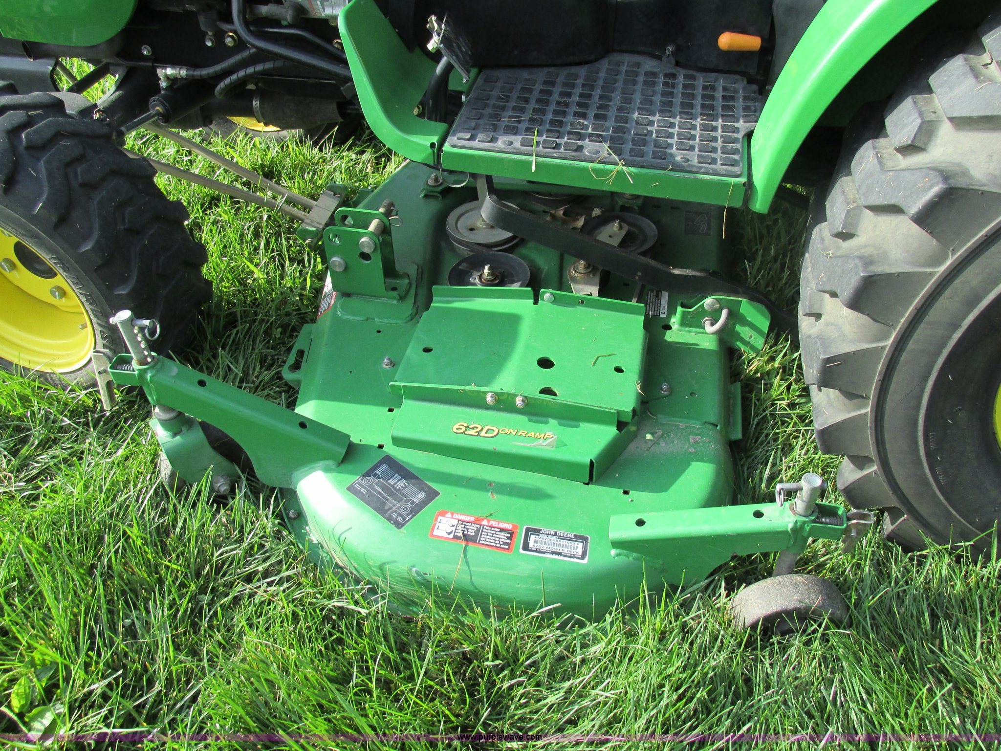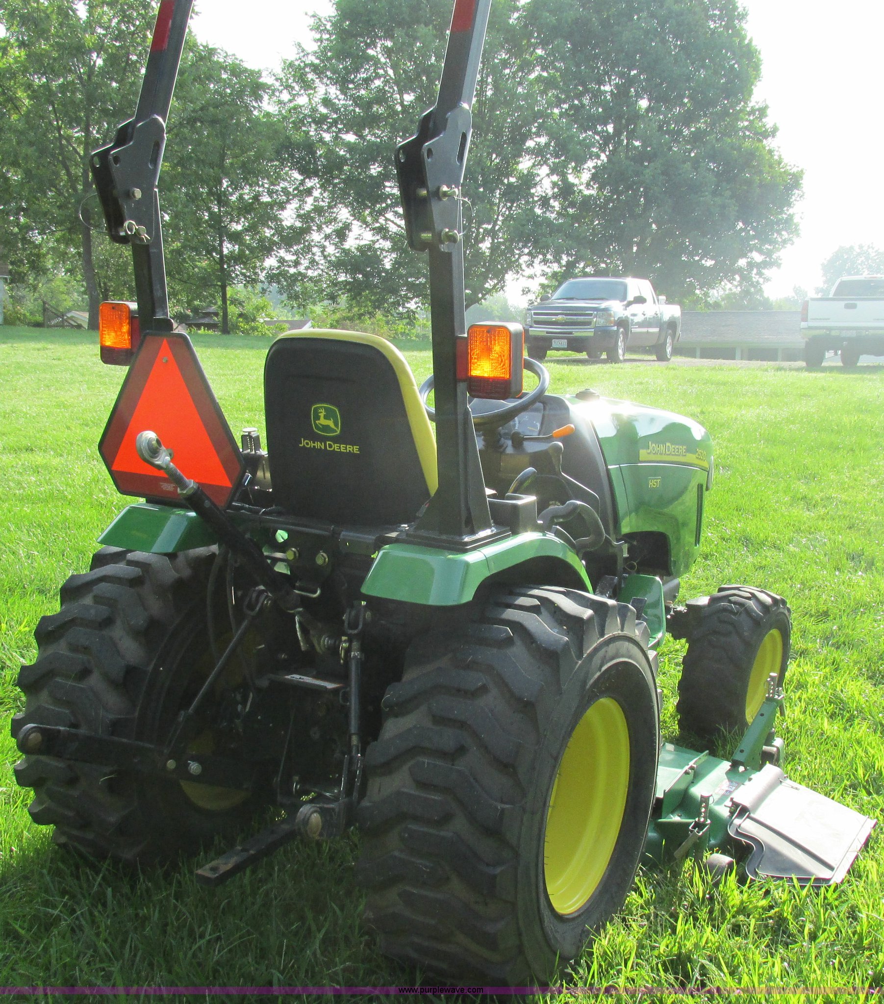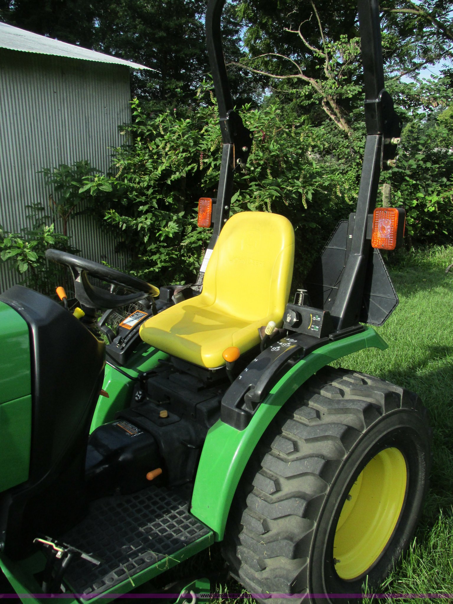 Purple Wave is selling a used Tractor in Missouri. This item is a 2008 John Deere 2520 HST MFWD tractor with the following: 552 hours on meter, Yanmar 3TNV82A-M 1.331L three cylinder diesel engine, Hydrostatic transmission, Fold down ROPS, Spring suspension seat, Blinkers, Headlights, Power steering, Three point, Draw bar, Quick attach belly mower, Model 62D, Plumbed for front loader, 23x8.50-12 front tires, 14-17.5 NHS rear tires, Serial LV2520H307182