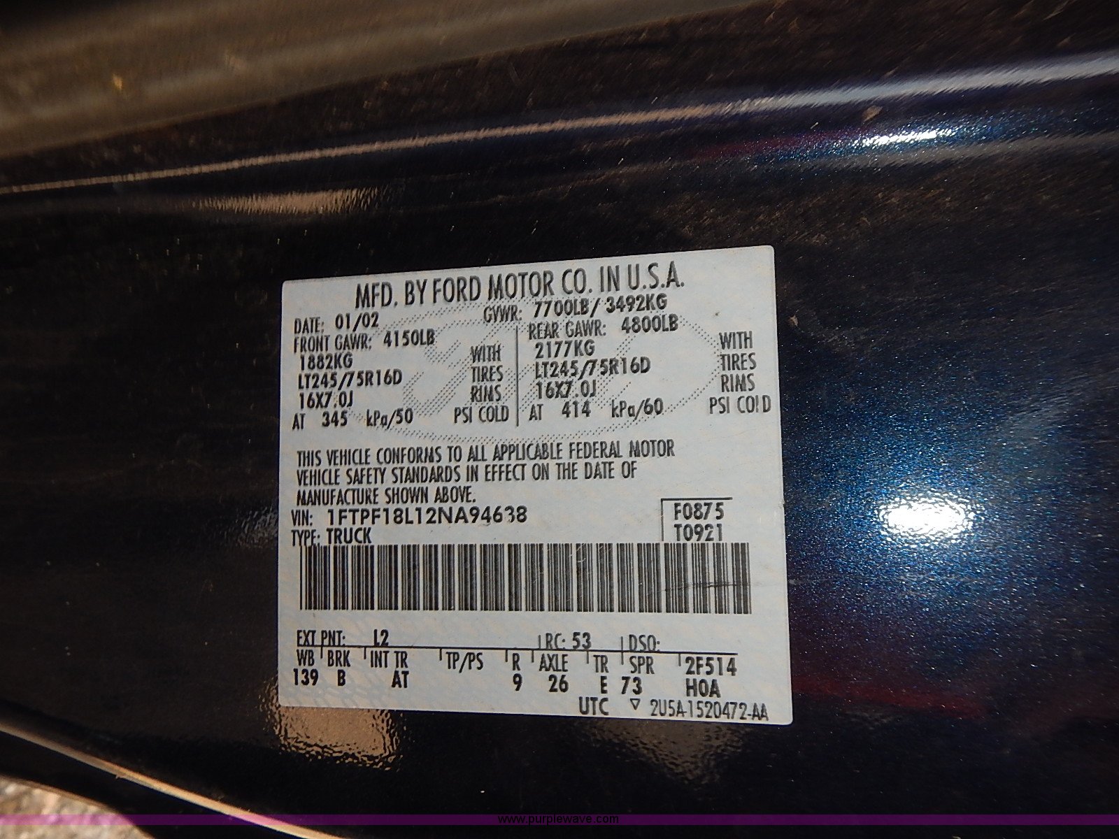 Purple Wave is selling a used 1/2 Ton Pickup or Van in Kansas. This item is a 2002 Ford F150 XL pickup truck with the following: 92,750 actual miles, 5.4L V8 SOHC 16V gas engine, Automatic transmission, Four wheel drive, AC and heat, AM/FM/cassette, Manual windows and locks, Vinyl interior, Long bed, R&K headache rack, Spray-in bed liner, Running boards, Receiver hitch, Trailer wiring, LT245/75R16 tires, Interior/exterior cosmetic damage, Scratches, Dents, Tailgate damgae, Unit# 70355