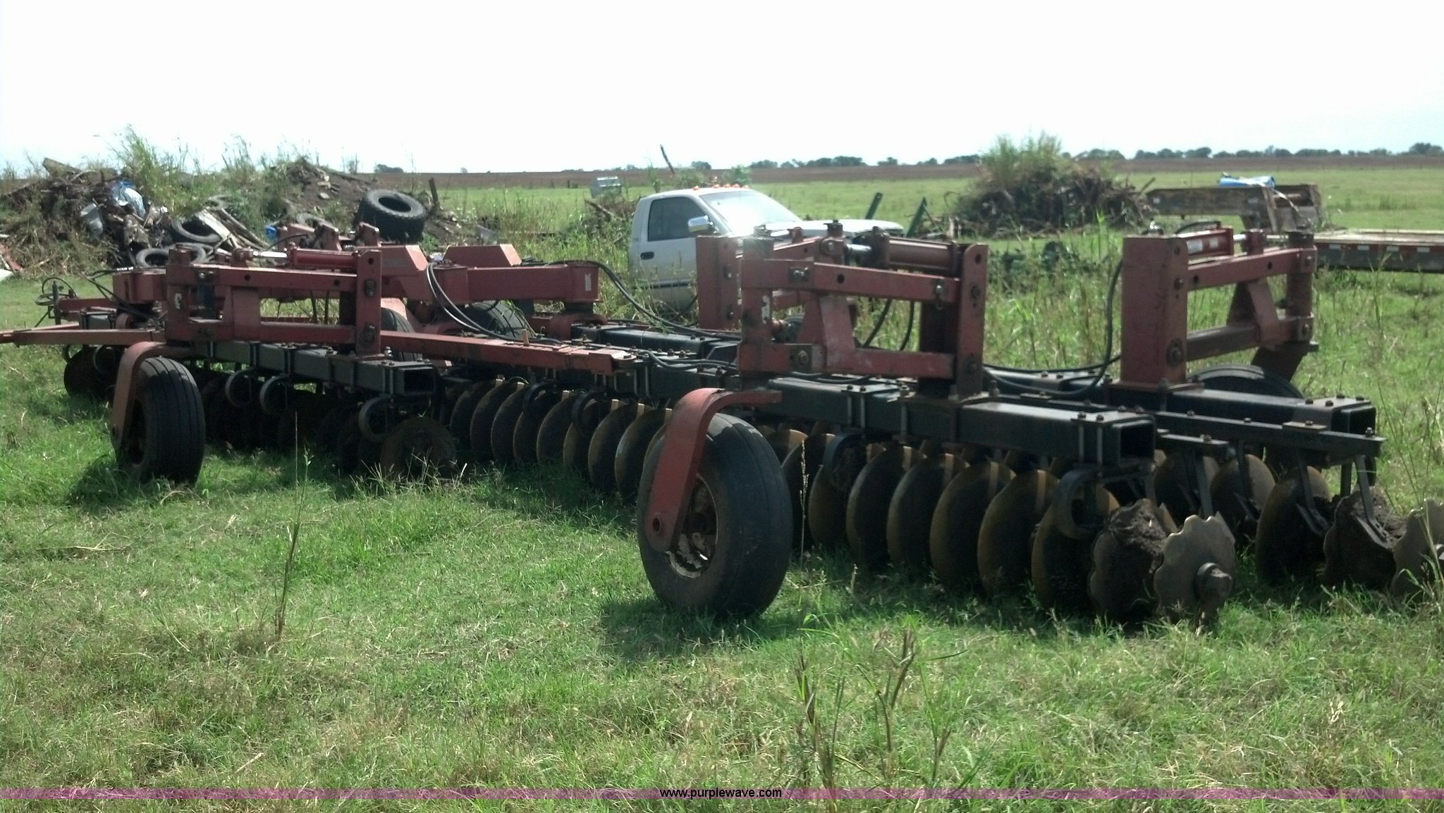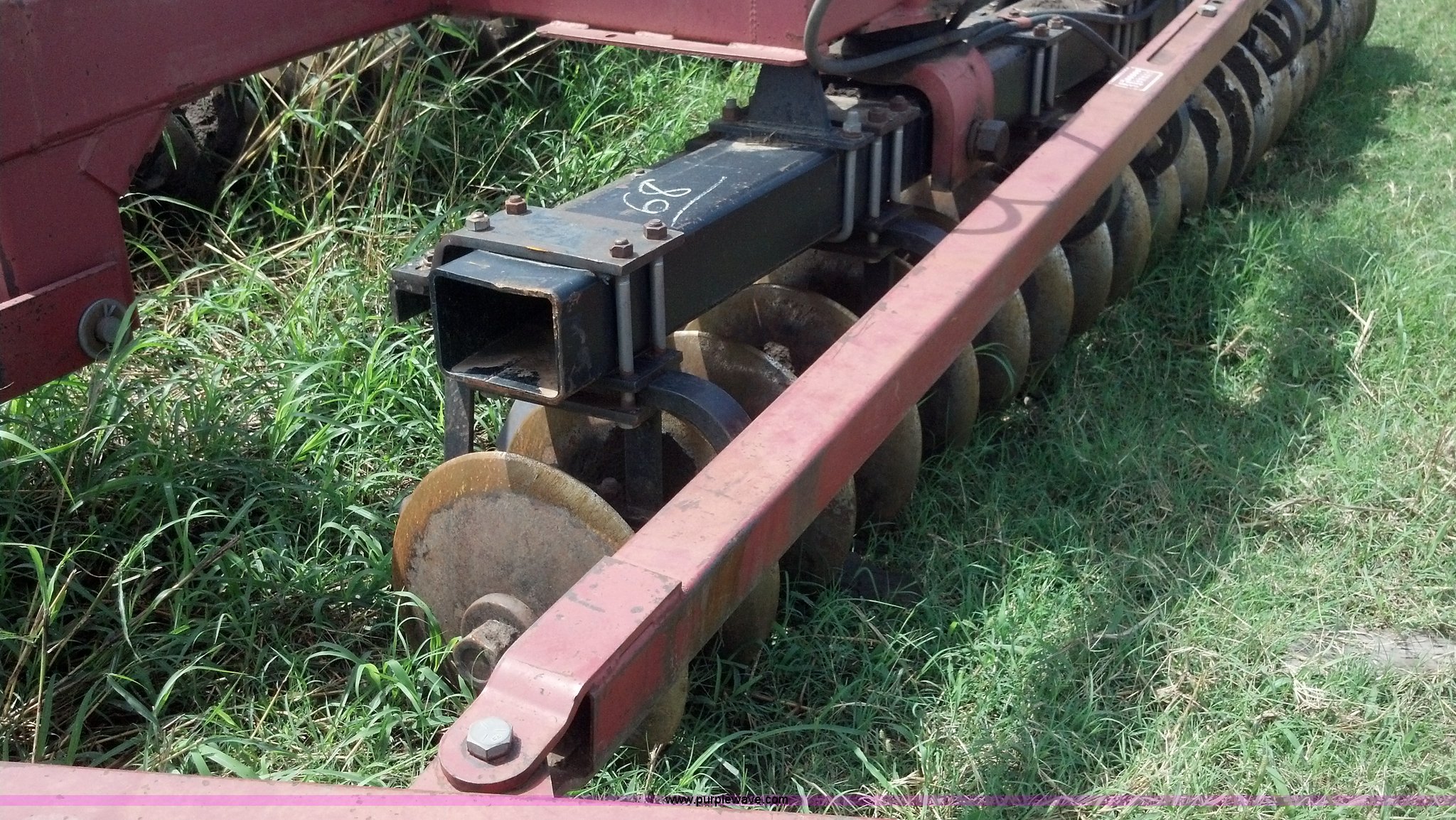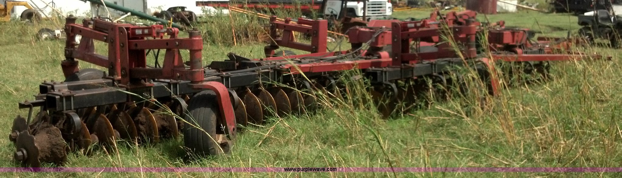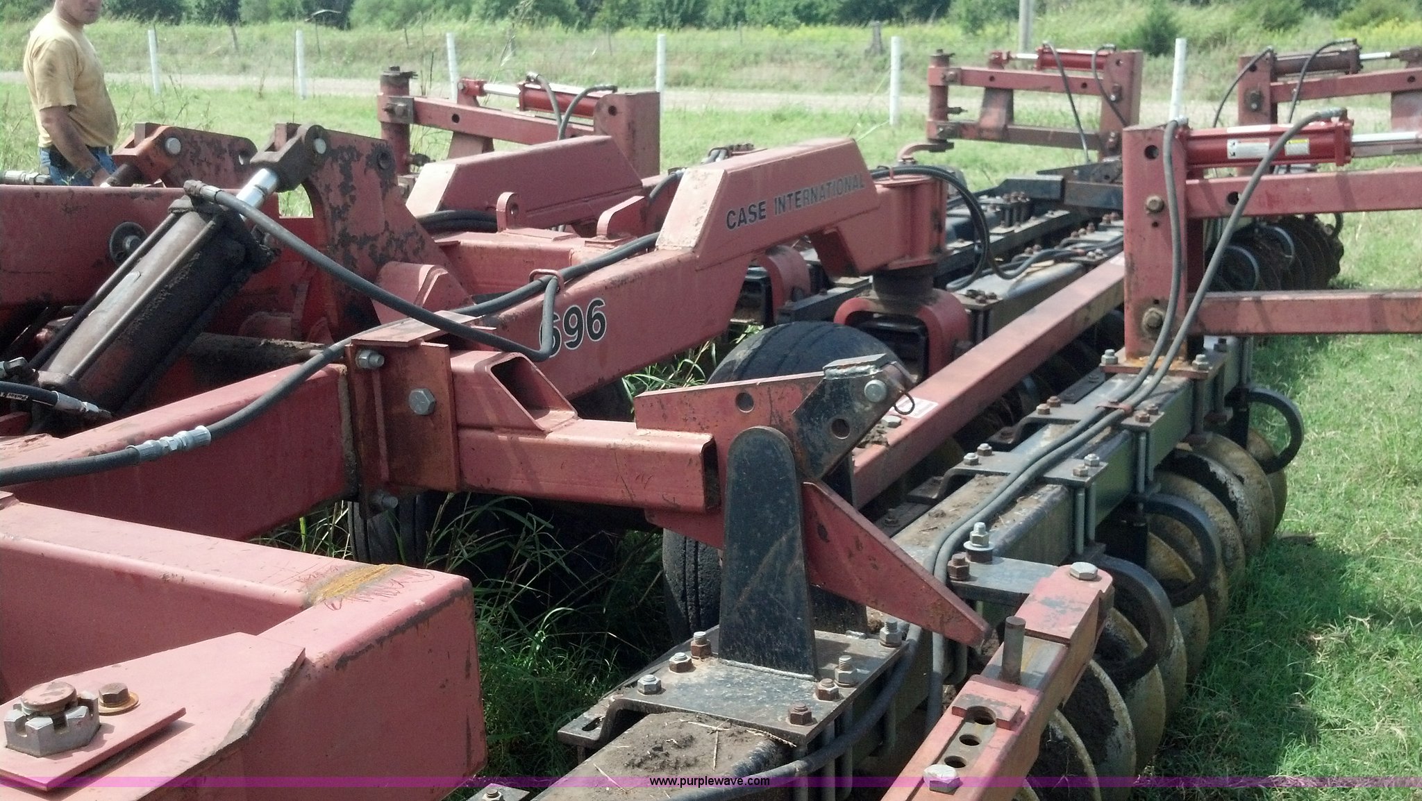 Purple Wave is selling a used Disk in Oklahoma. This item is a Case IH 696 folding double off-set disk with the following: 35'W, Hydraulic fold, Hydraulic raise and lower, Adjustable pitch on gangs, Blade cleaners, 20" front blades, 23" rear blades, 12.5L-15 tires, Serial CKB0001535