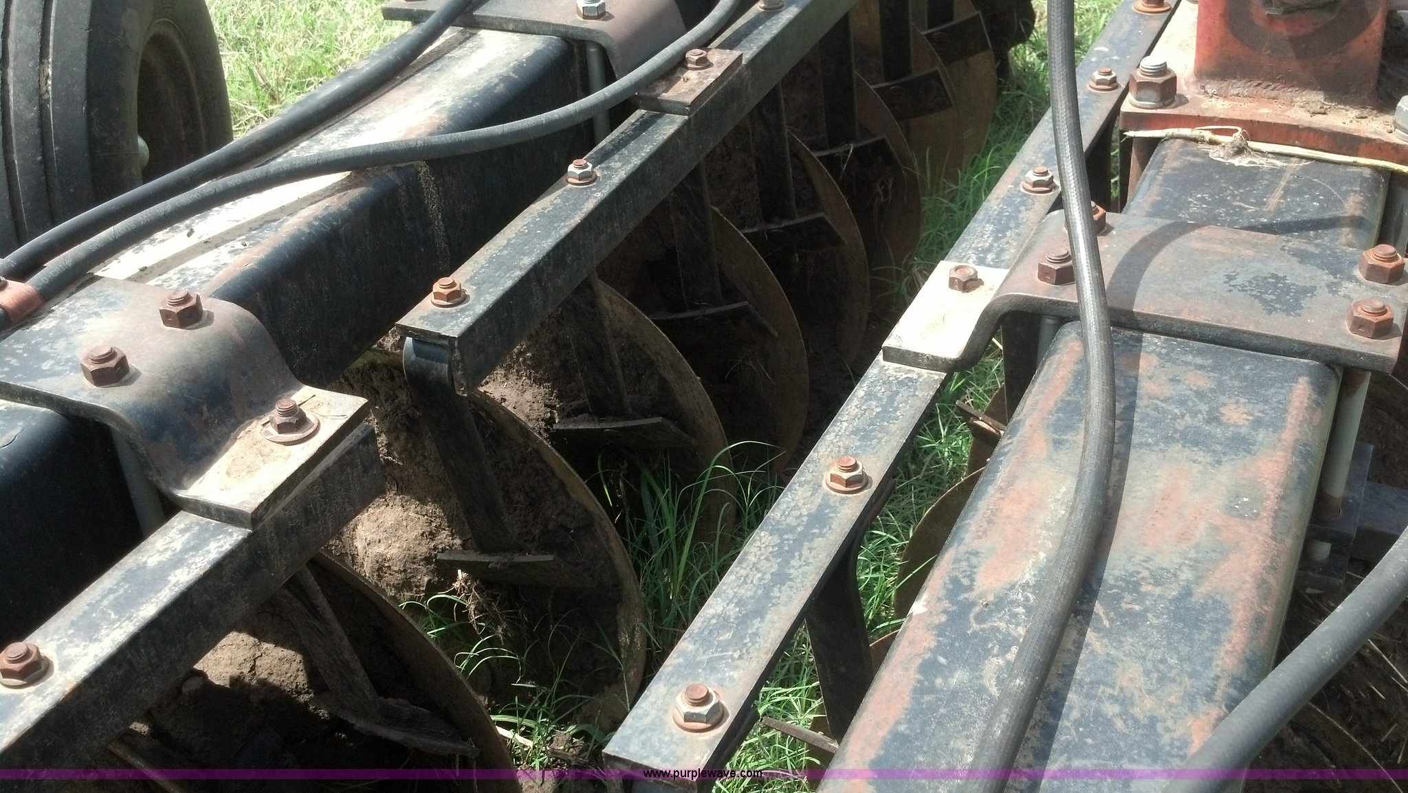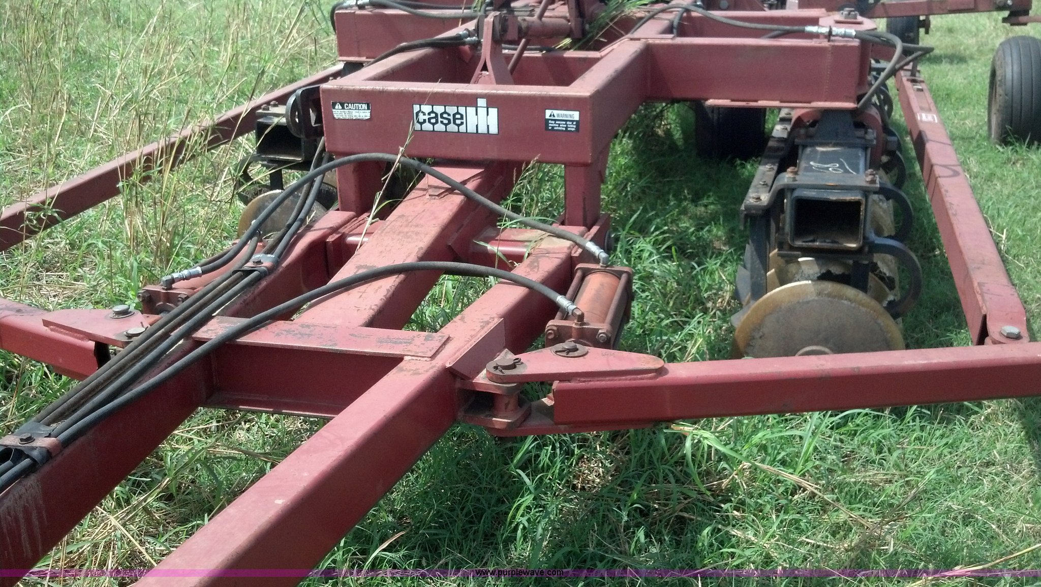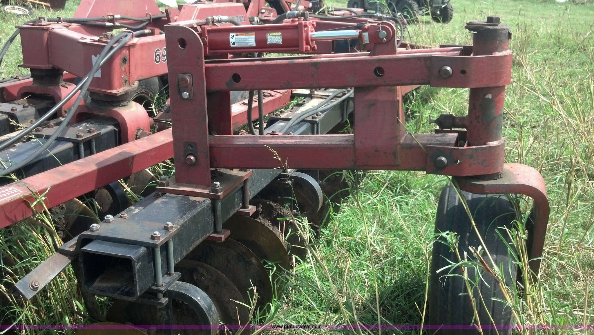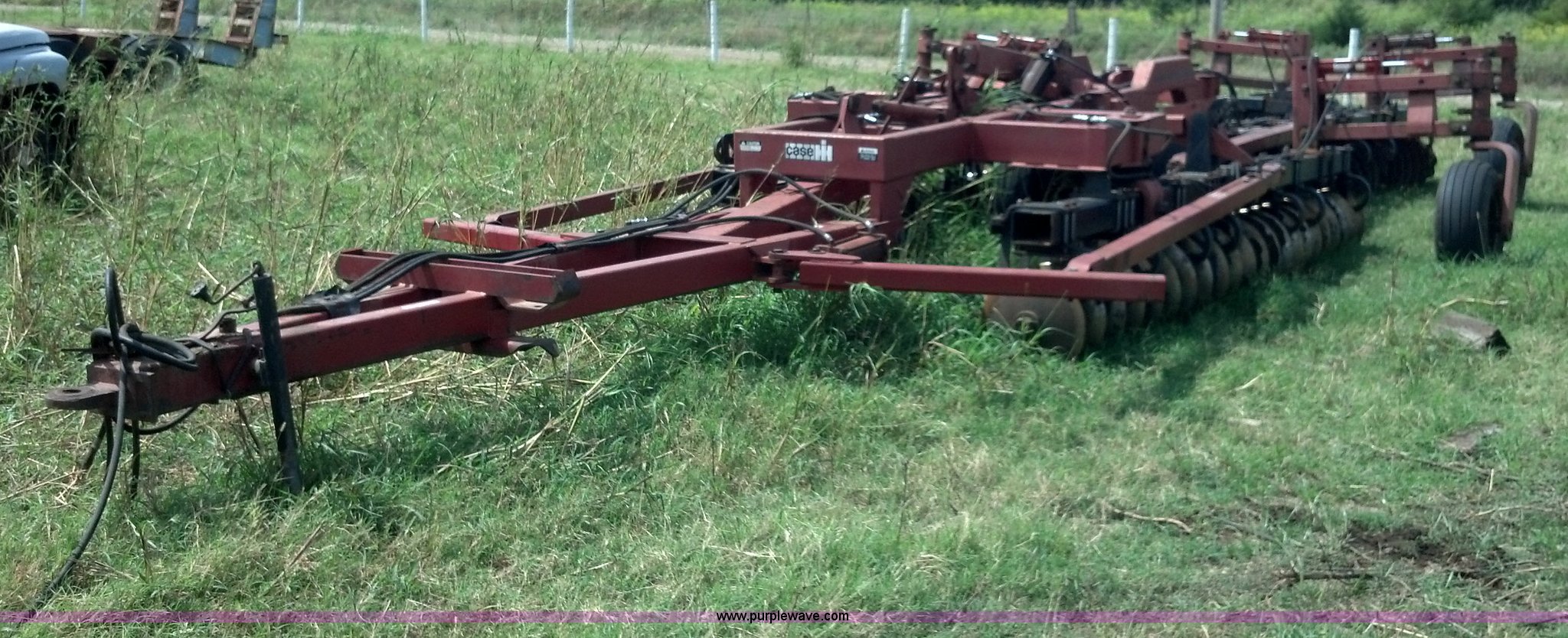 Purple Wave is selling a used Disk in Oklahoma. This item is a Case IH 696 folding double off-set disk with the following: 35'W, Hydraulic fold, Hydraulic raise and lower, Adjustable pitch on gangs, Blade cleaners, 20" front blades, 23" rear blades, 12.5L-15 tires, Serial CKB0001535