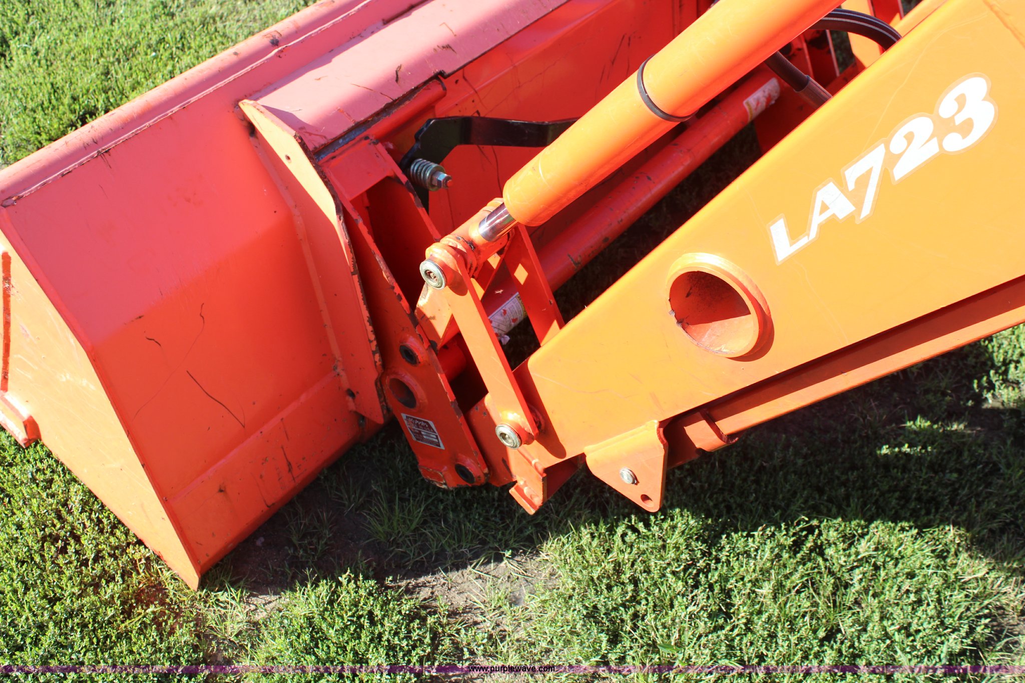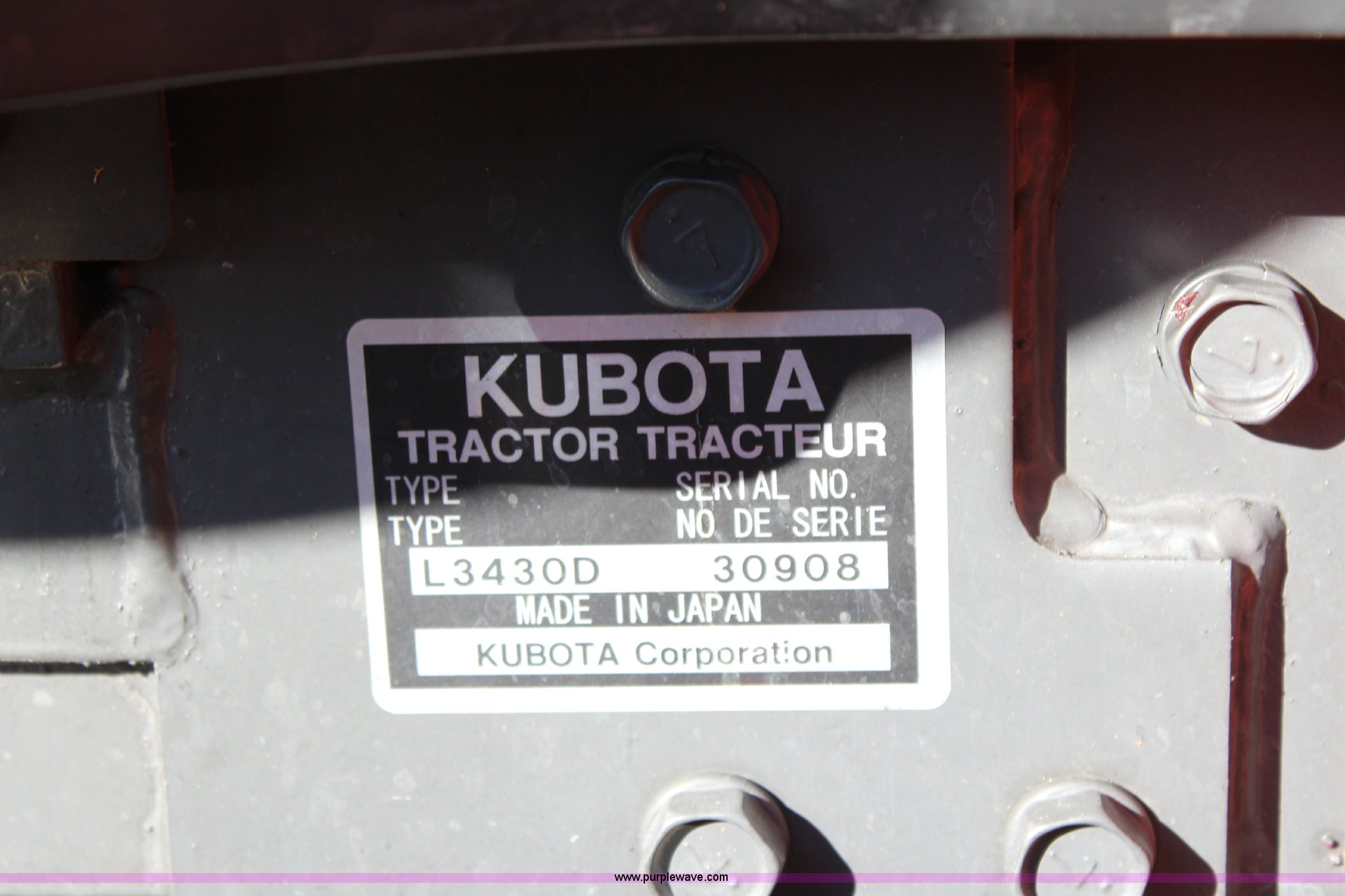 Purple Wave is selling a used Tractor in Kansas. This item is a 2003 Kubota L3430 MFWD tractor with the following: 836 hours on meter, Kubota D1703 three cylinder diesel engine, 35 HP, Hydrostatic transmission, 3F-3R gears, Differential lock, AC and heat, AM/FM/cassette, Spring suspension seat, Tilt steering wheel, Kubota LA723 loader, 72"W bucket, Manual quick attach, Joystick control, Three point, Draw bar, 540 PTO, One rear hydraulic remote, 10.6 gallon fuel tank, 10-16.5 front tires, 420/70-24 rear tires, Serial 30908