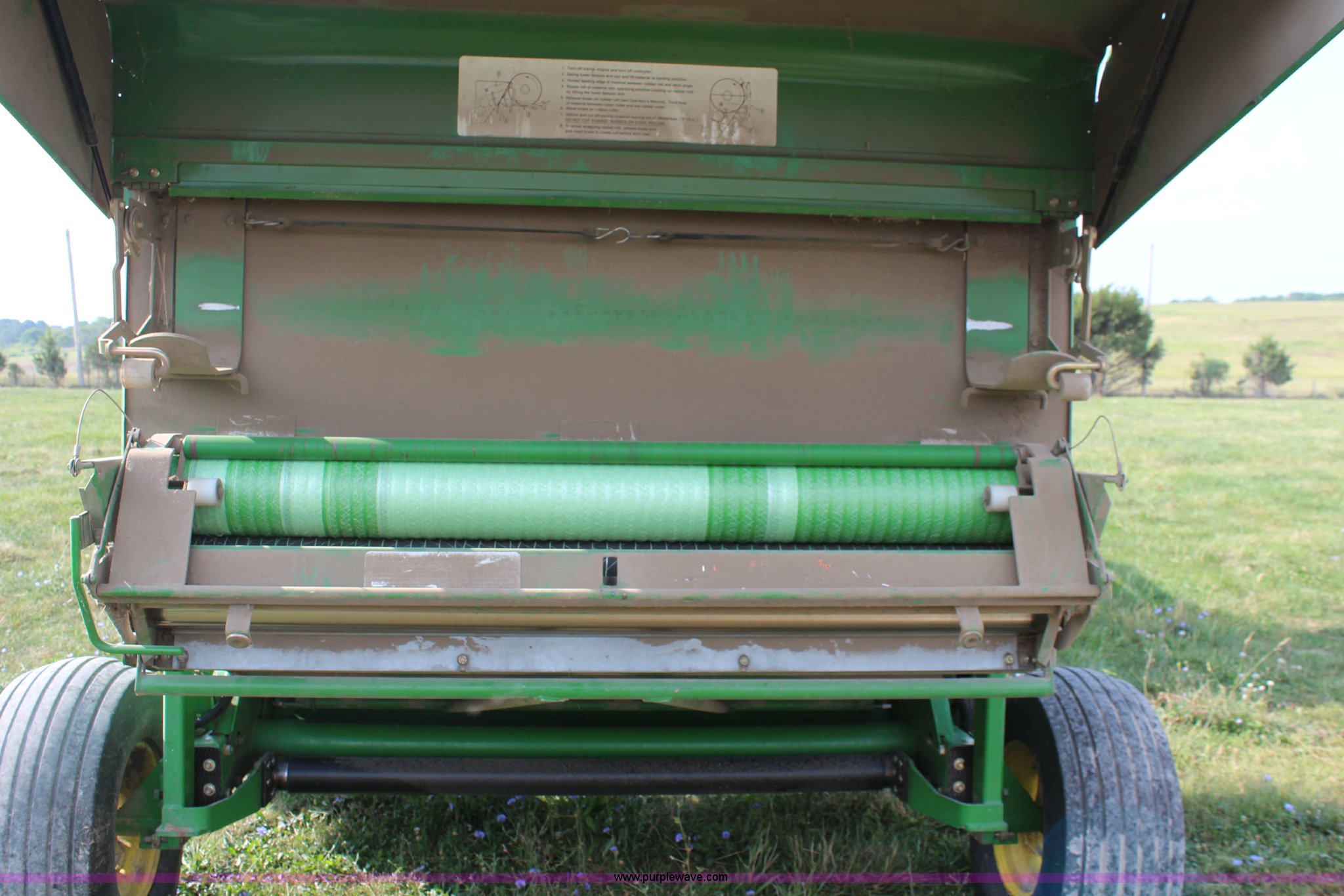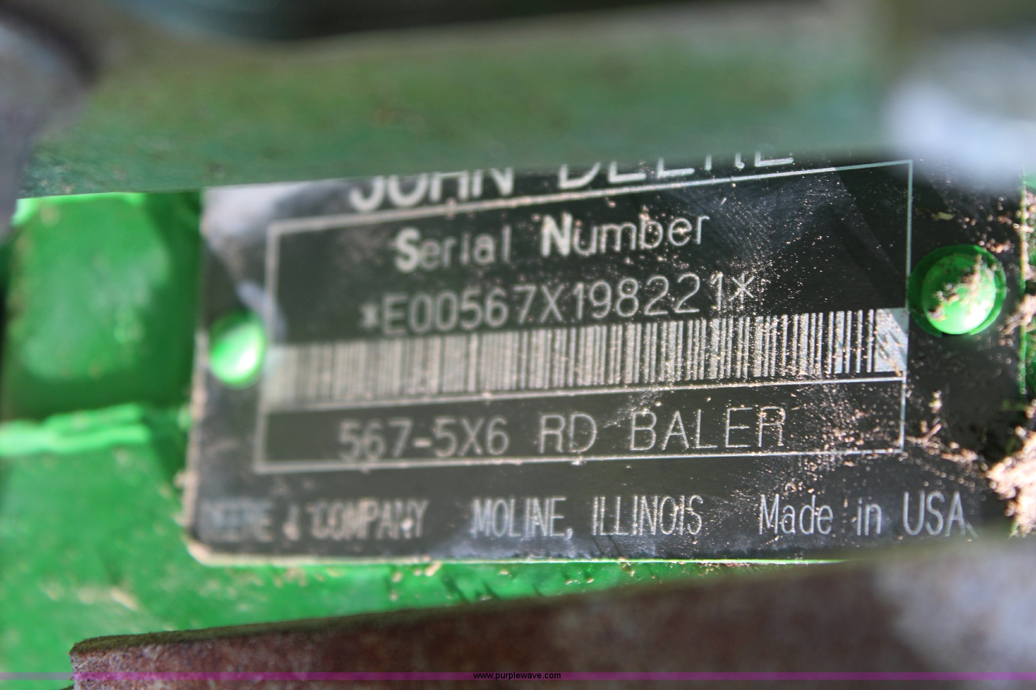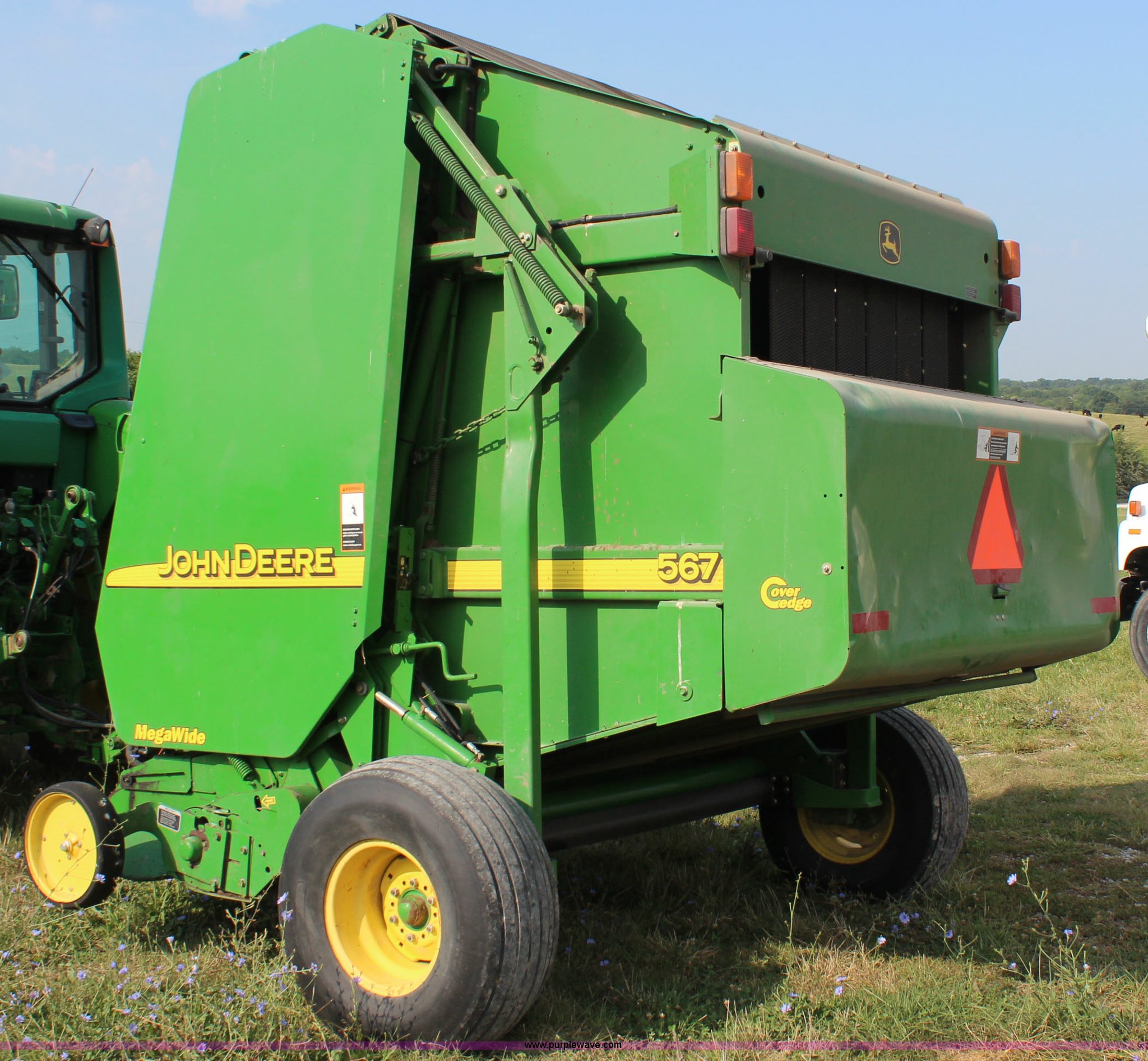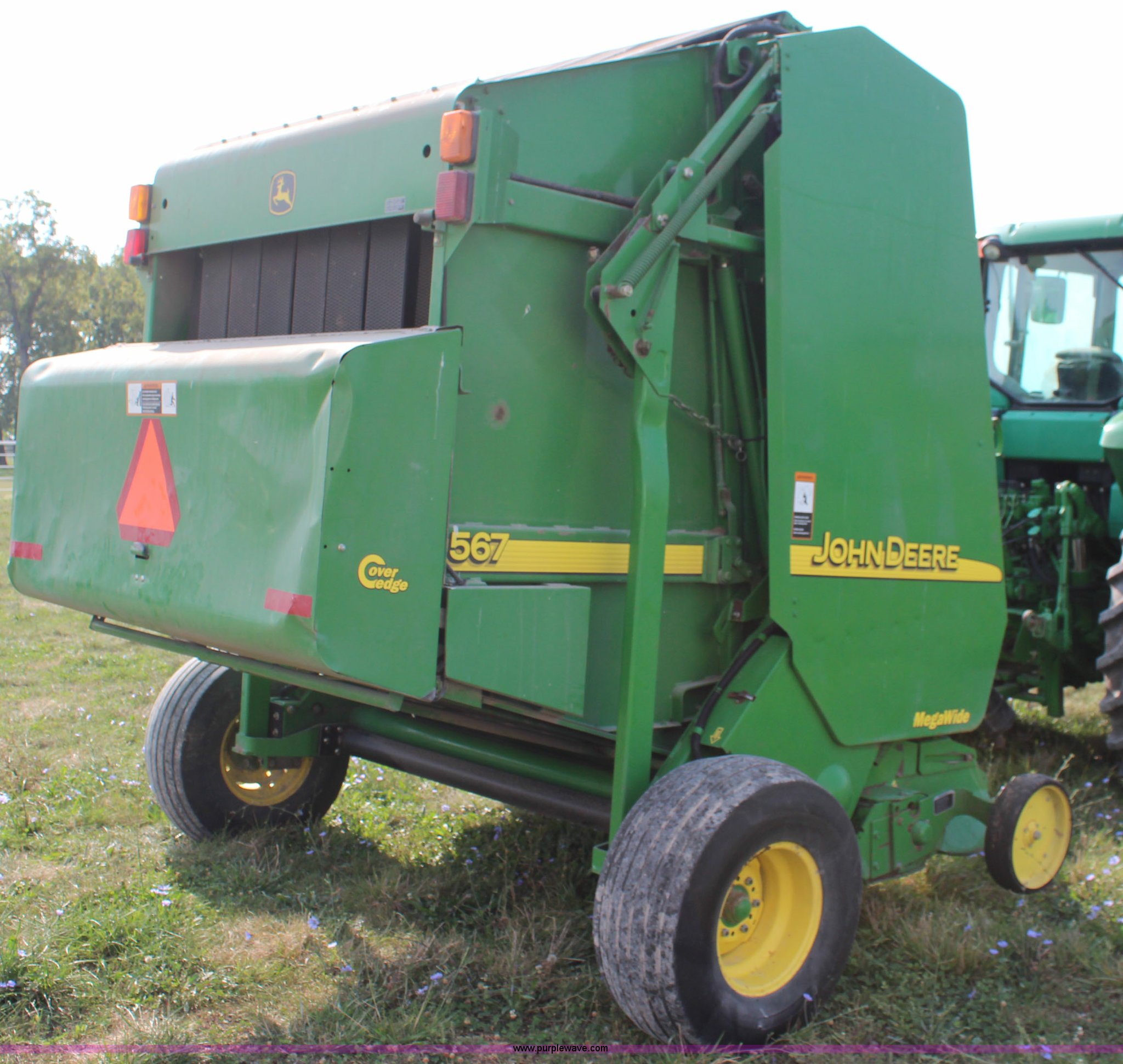 Purple Wave is selling a used Round Baler in Kansas. This item is a 2003 John Deere 567 round baler with the following: 10,600 bales, 5' x 6' bale capacity, Mega wide pickup, Net wrap and twine tie, 540 PTO, Bale kicker, Monitor, Gauge wheels, 31x13.50-15 tires, Chains, sprockets, and gear box seals replaced in December 2013, Serial E00567X198221