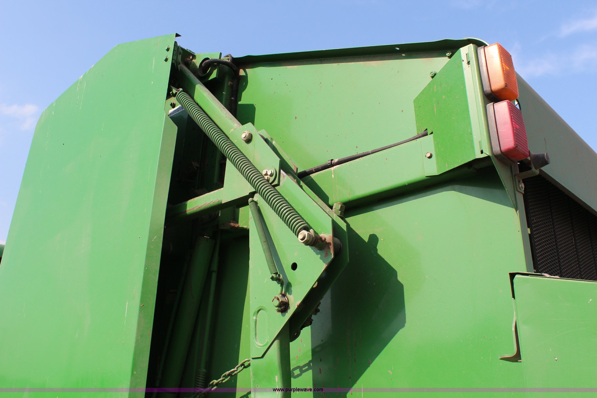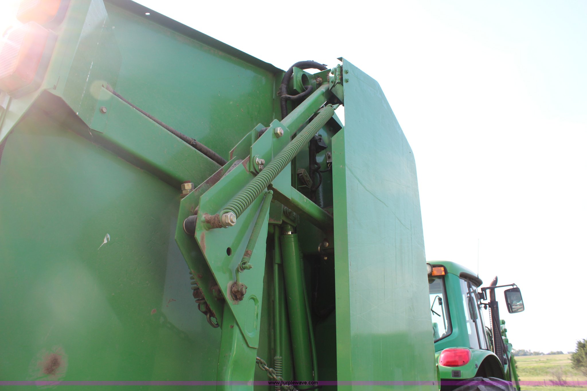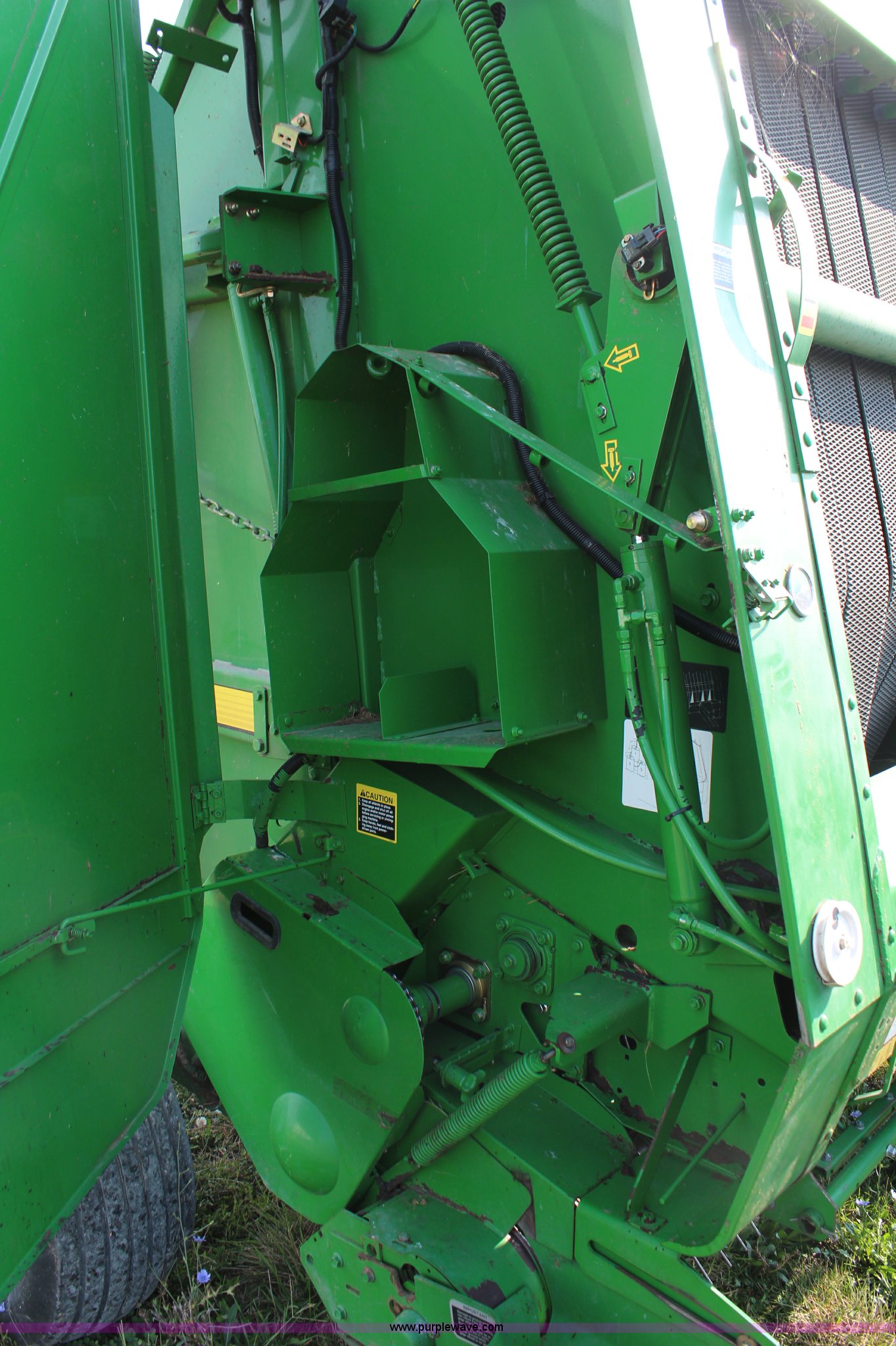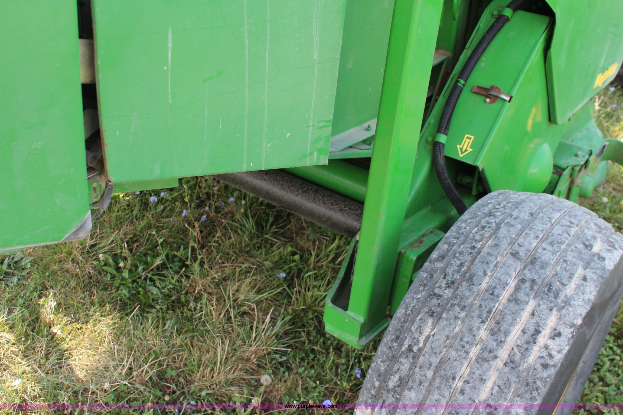 Purple Wave is selling a used Round Baler in Kansas. This item is a 2003 John Deere 567 round baler with the following: 10,600 bales, 5' x 6' bale capacity, Mega wide pickup, Net wrap and twine tie, 540 PTO, Bale kicker, Monitor, Gauge wheels, 31x13.50-15 tires, Chains, sprockets, and gear box seals replaced in December 2013, Serial E00567X198221
