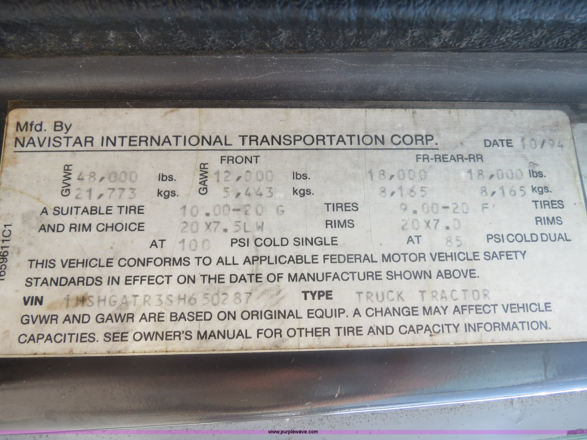 1995 International 8200 semi truck. 267,971 miles on odometer, Caterpillar 3176 10.3L L6 diesel engine 325 HP, Spicer seven speed manual transmission Transmission issues, will not move, AC and heat, Cruise, AM/FM/cassette, Air suspension seat, Dual 50 gallon fuel tanks, Single rear exhaust stack, Spring suspension, Air brakes, 160" wheelbase, 11R22.5 tires, GVWR 48,000 lbs, FAWR 12,000 lbs, IAWR 18,000 lbs, RAWR 18,000 lbs, Tank not included, will be removed prior to auction, Unit# 45466. Title distribution may be delayed up to 30 days from verification of funds. 1HSHGATR3SH650287. View equipment video. Crop Production Services - Williamsburg. 9417 US Hwy 35. Williamsburg, IN 47393