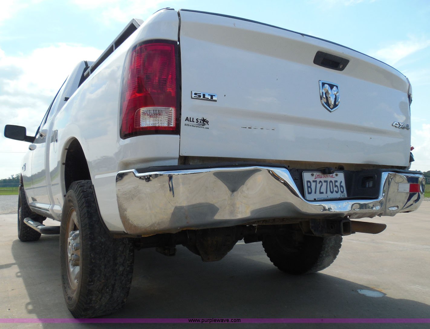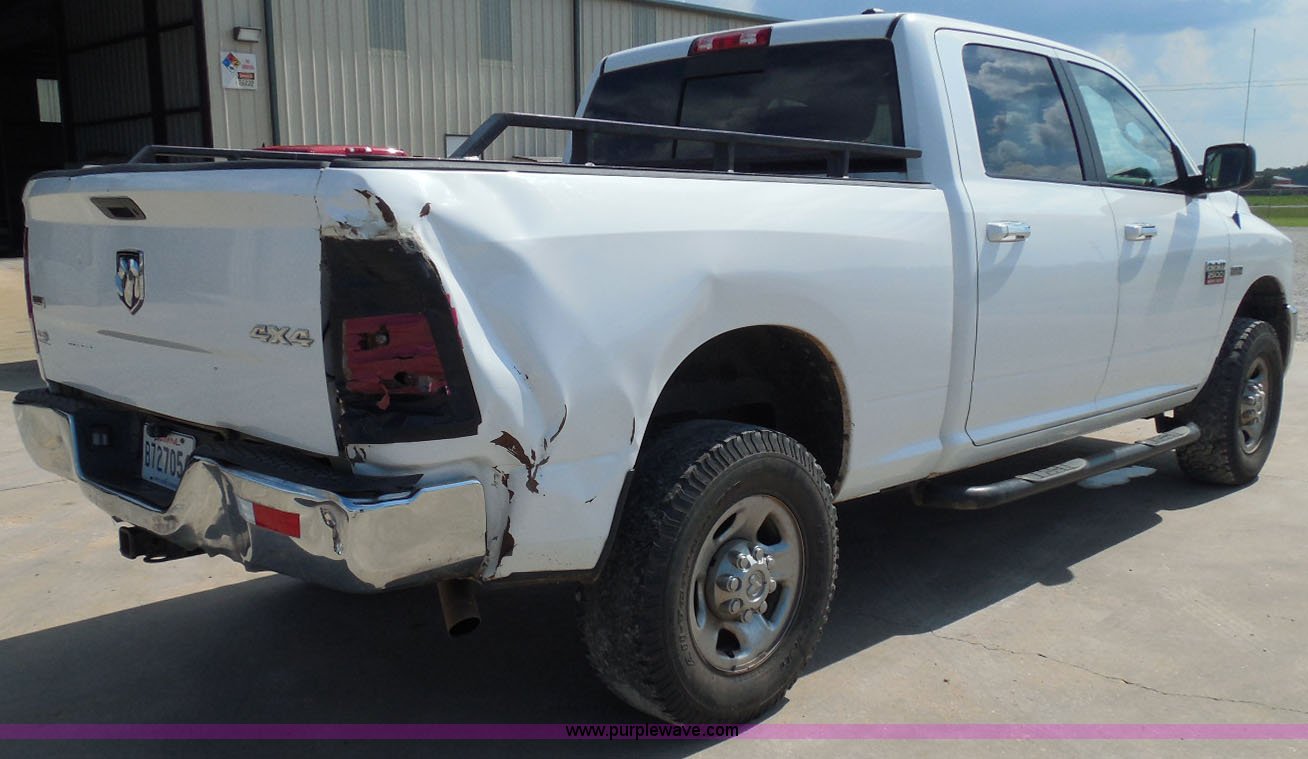 Purple Wave is selling a used 3/4 or 1 Ton Pickup or Van in Louisiana. This item is a 2011 Dodge Ram 2500 HD Crew Cab pickup truck with the following: 139,104 miles on odometer, 5.7L V8 OHV 16V gas engine, Automatic transmission, Four wheel drive, AC and heat, Tilt, Cruise, AM/FM/CD, Bluetooth ready, Power windows, locks, and mirrors, Cloth interior, Running boards, Power slide rear window, Plastic bed liner, Home Bilt bed rail, Electronic trailer brake controller, Chrome bumpers, Receiver hitch, Alloy wheels, 285/70R17 tires, Rear bumper damage, Right side bed damage, Rear tires need replaced, No backup camera, Windshield damage, Right taillight damage, Tailgate damage, Chipped windshield, Unit# 22112