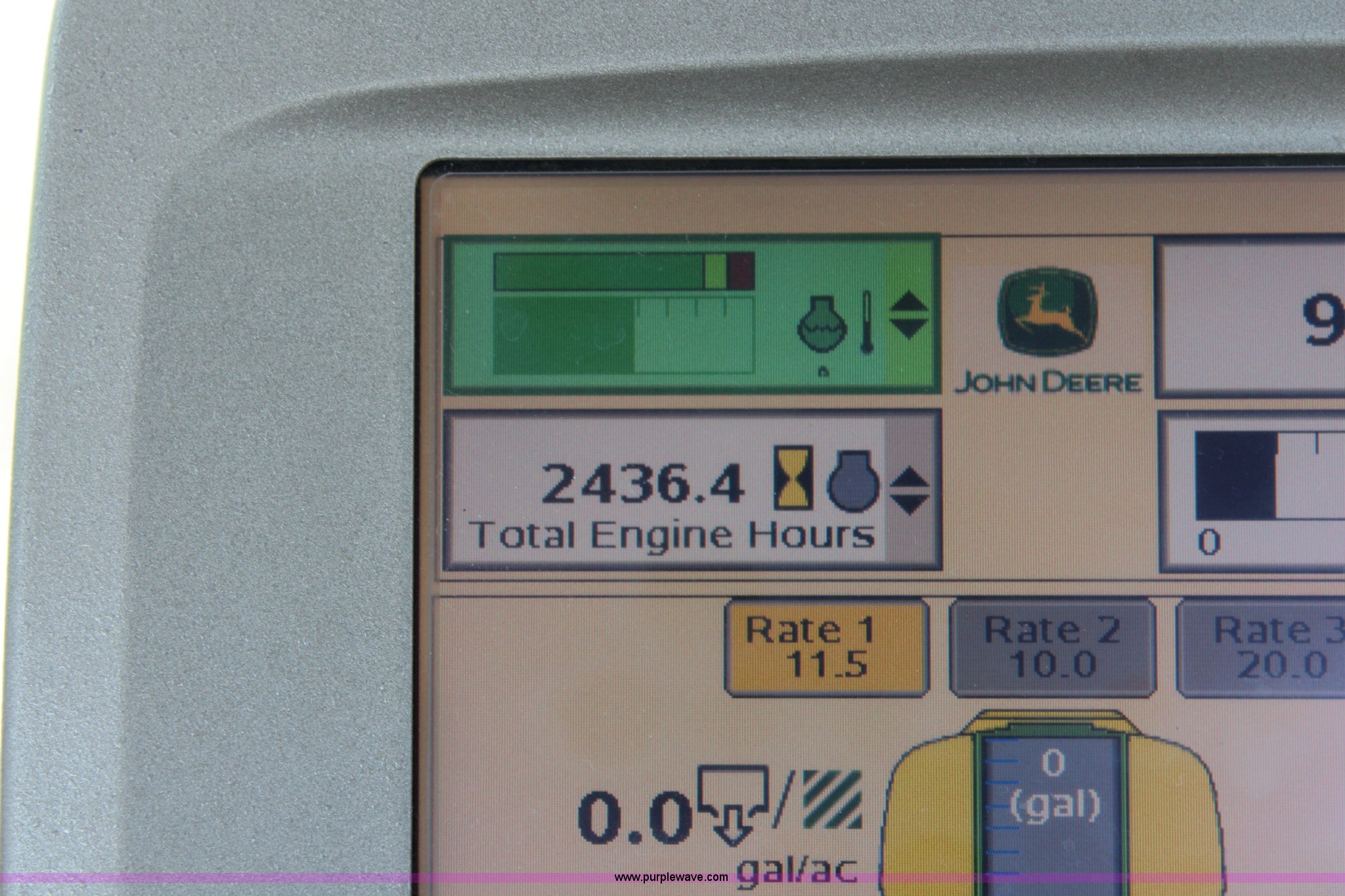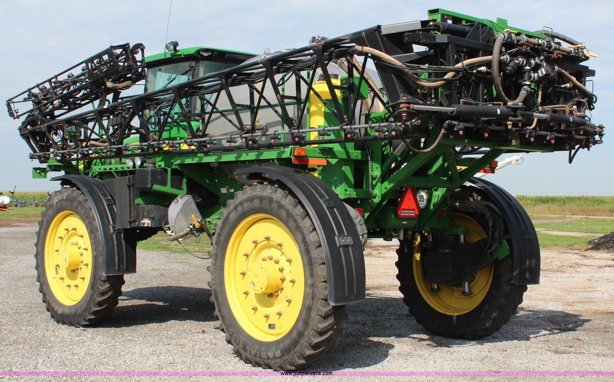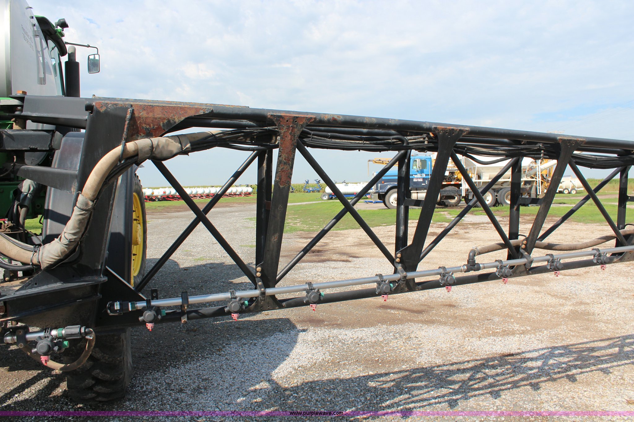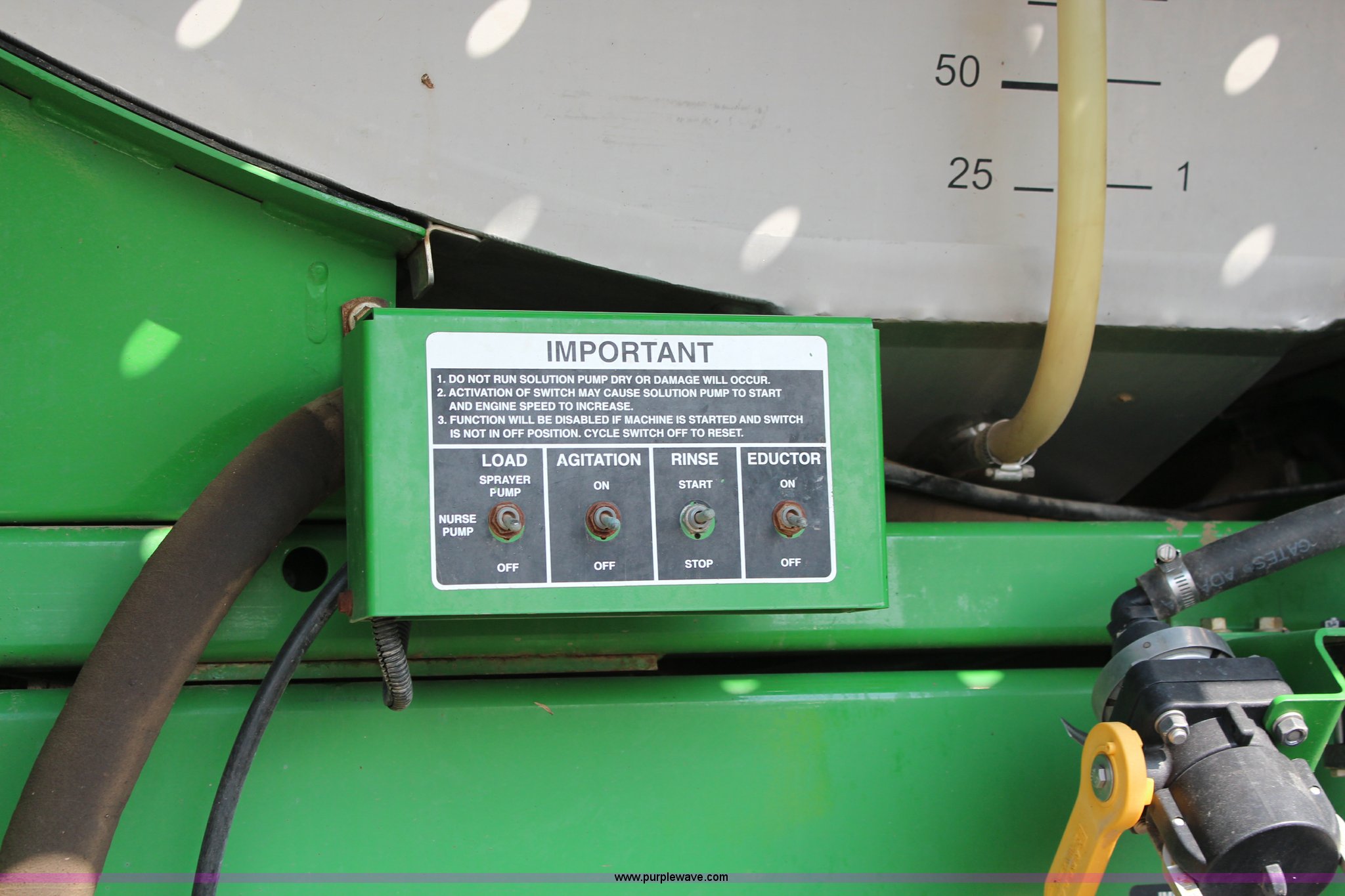 Purple Wave is selling a used Applicator Self Propelled in Kansas. This item is a 2010 John Deere 4930 self-propelled sprayer with the following: 2,436 hours on meter, John Deere 6090HN001 9.0L six cylinder diesel engine, 325 HP, Hydrostatic transmission, 4F gears, Four wheel drive, 1,200 gallon stainless steel tank, Rinse tank, Stainless steel induction tank, John Deere spray control system, 100'W boom, (7) boom sections, 15" nozzle spacing, Five-way nozzle bodies, Hydraulic height adjust, Hydraulic boom fold, Foam marker, Rear camera, Fence row nozzles, AC and heat, Delphi AM/FM/CD, Air suspension seat, John Deere Greenstar GPS, Work lights, Manuals, Fenders, Lincoln autolube system, Air suspension, Hydraulic axle width adjust, 380/405R5 tires, Serial N04930X008582