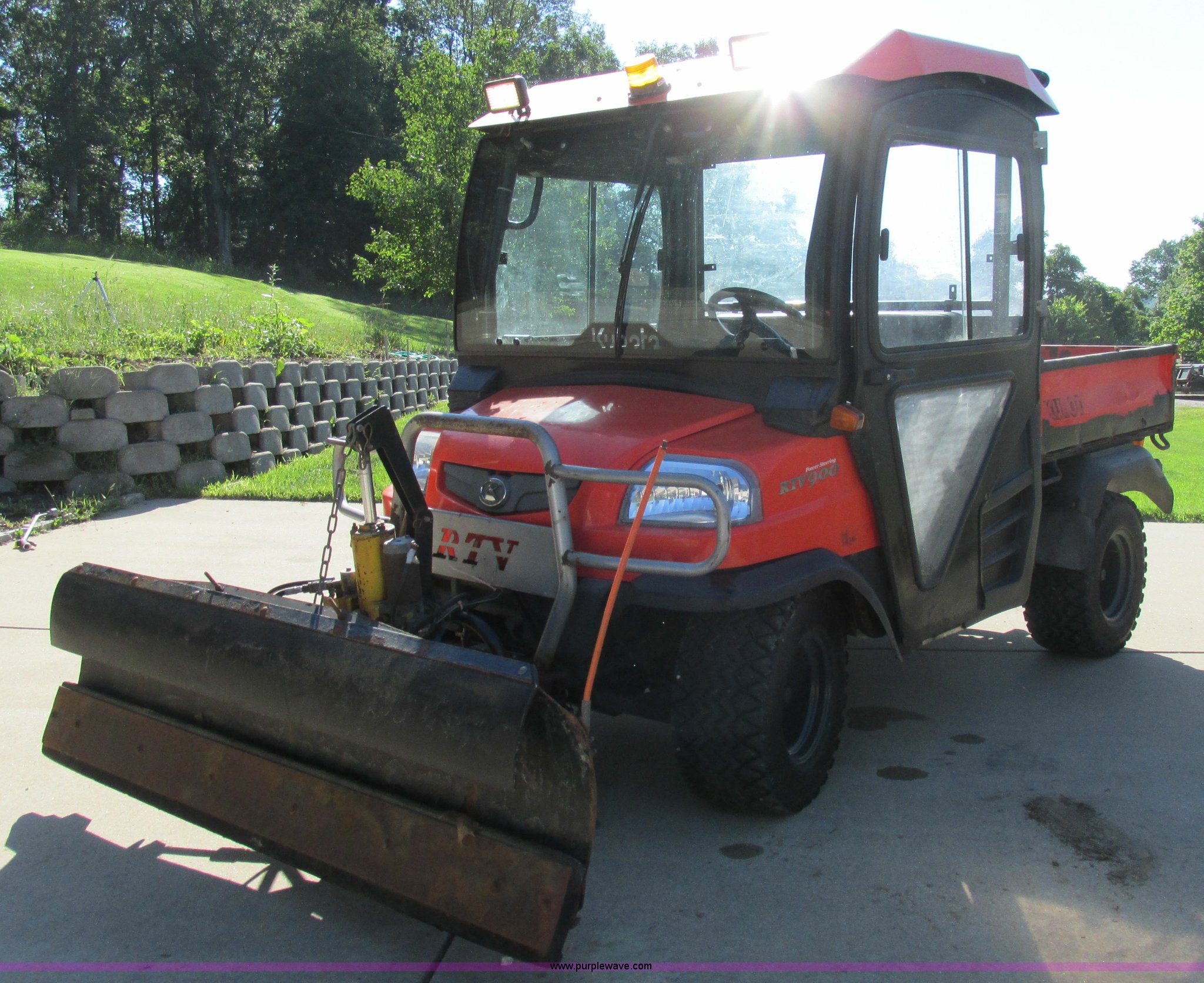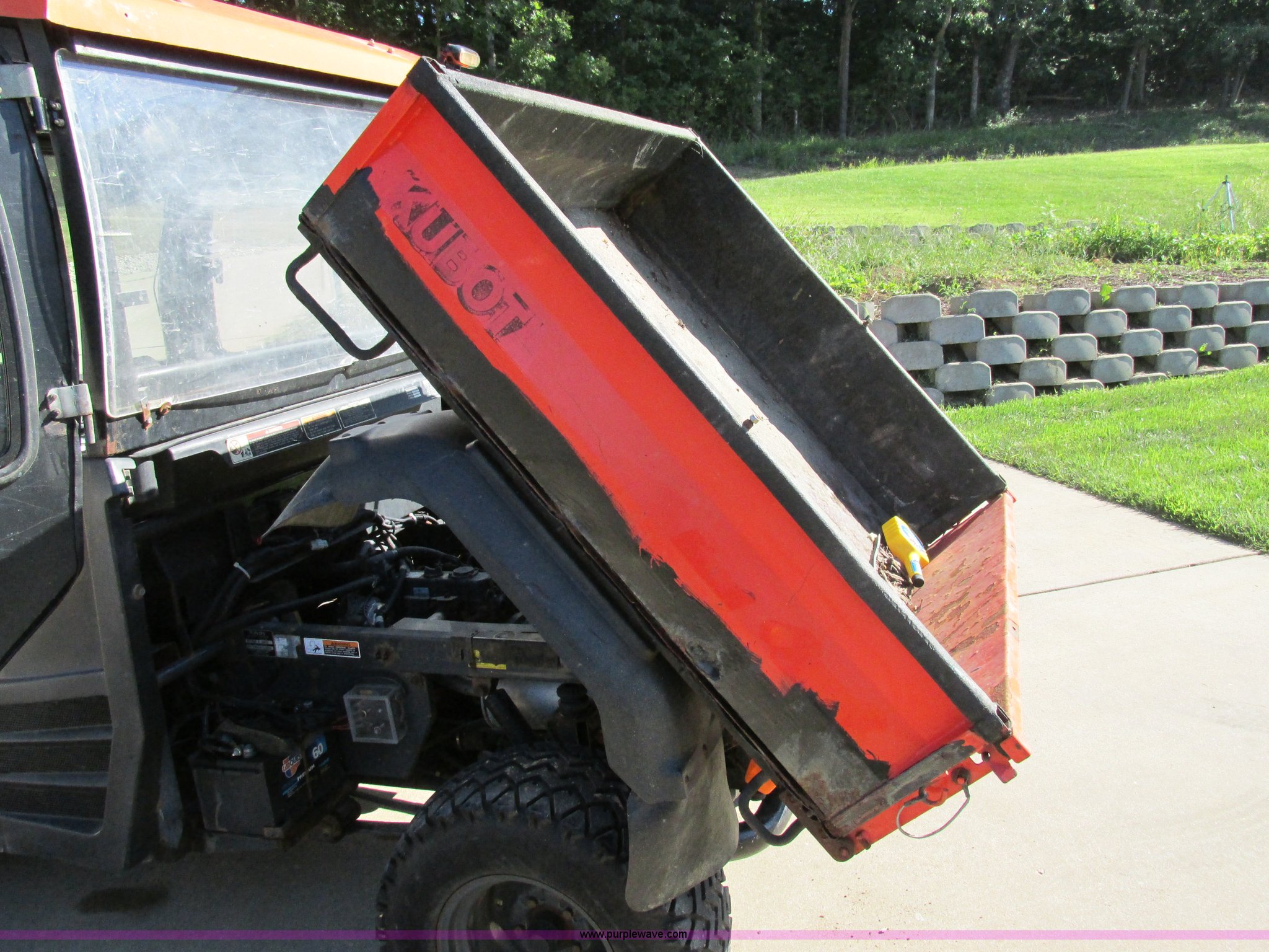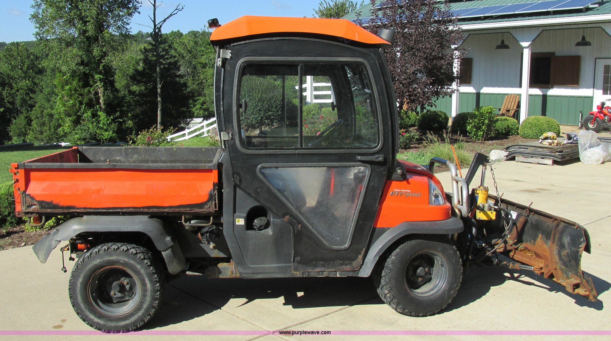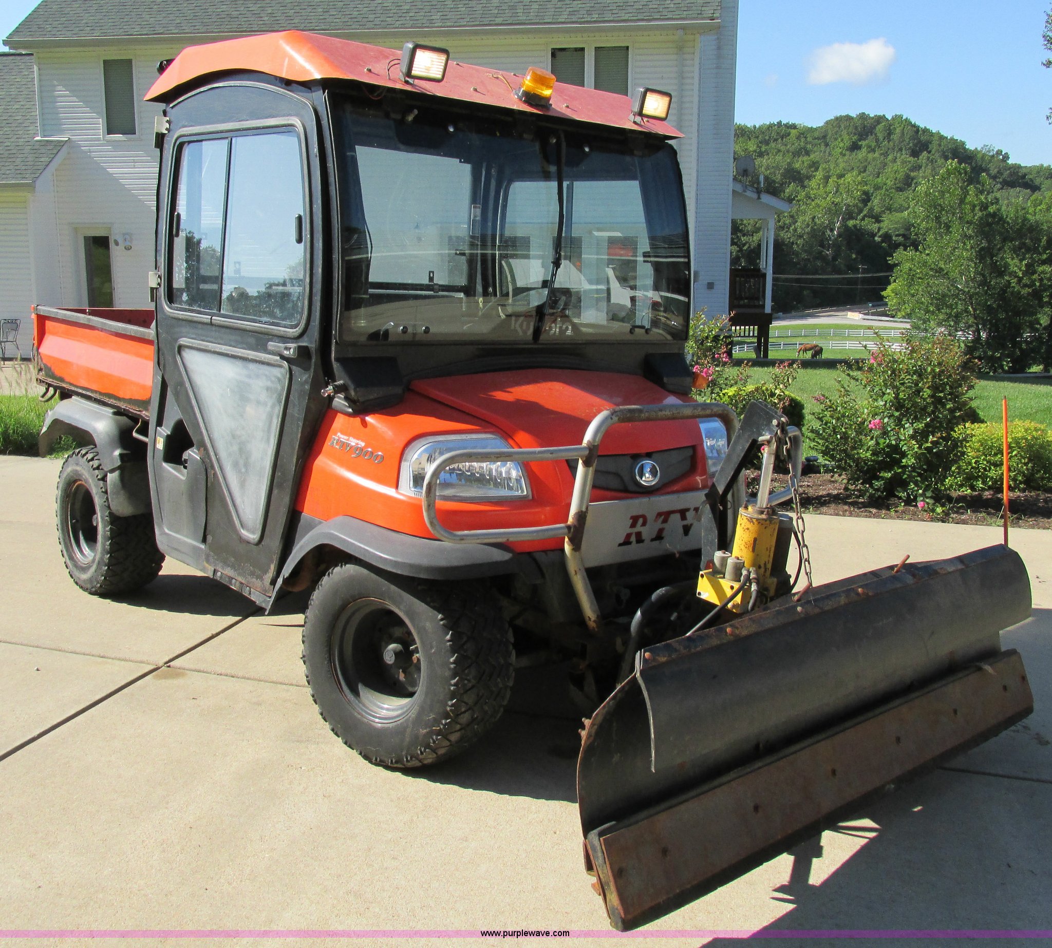 Purple Wave is selling a used Utility Vehicle in Missouri. This item is a 2004 Kubota RTU900 UTV with the following: 1,971 hours on meter, Kubota D982 three cylinder diesel engine, Serial RRTV900A41026695, Hi-Lo transmission, Four wheel drive, Enclosed cab, Heat, AM/FM/CD, Front work lights, Yellow strobe light, 47" x 52" hydraulic dump bed, Spray-in bed liner, 6'W snow plow, Hydraulic raise and lower, Hydraulic angle adjustment, In-cab plow controls, Spreader controls, Rear hydraulic remotes plumbed for spreader, 12V auxiliary outlet, Hazard lights, 1.5" x 1.5" hitch, Spring suspension, 350 Mag tires, Serial 26695