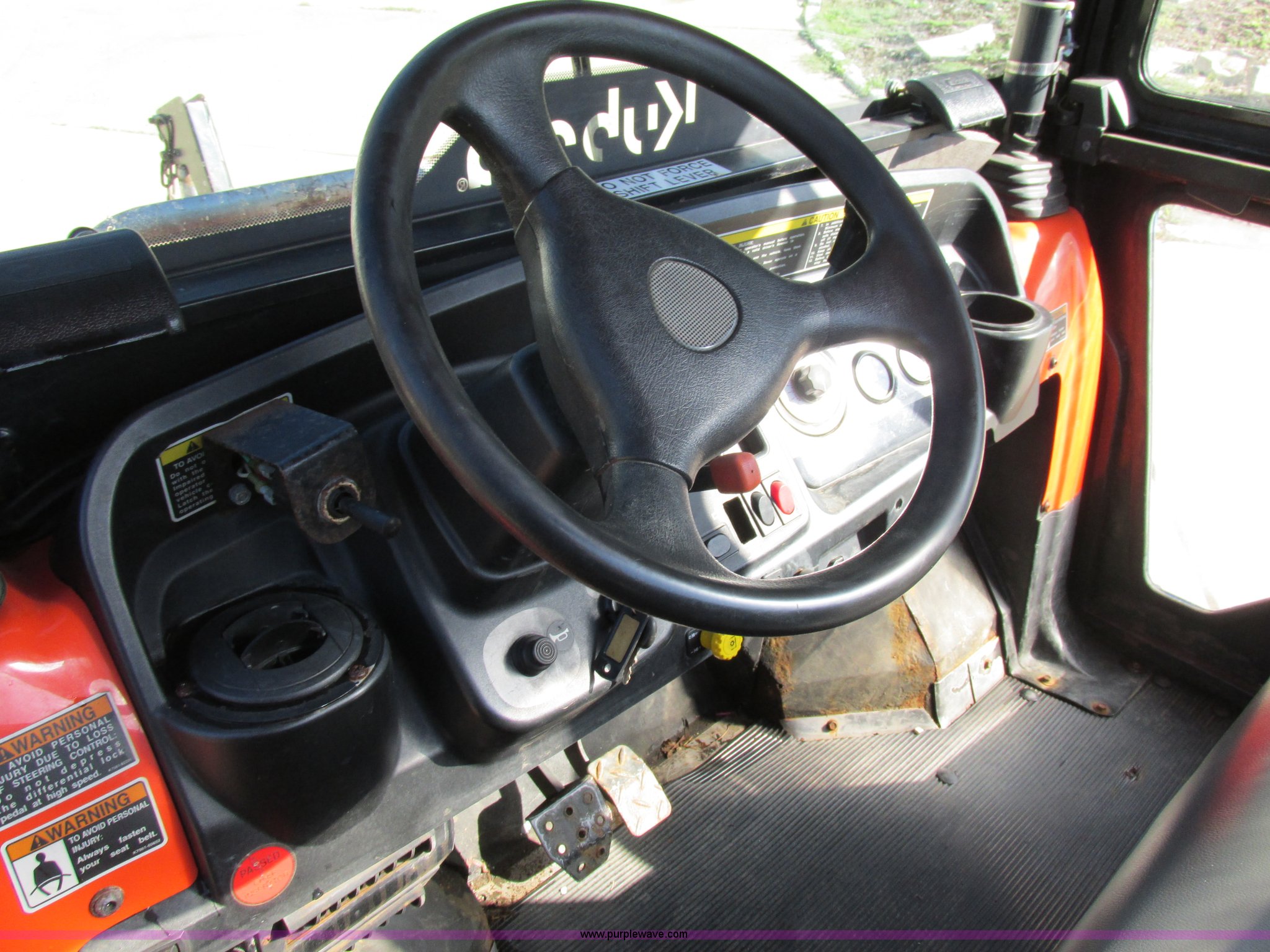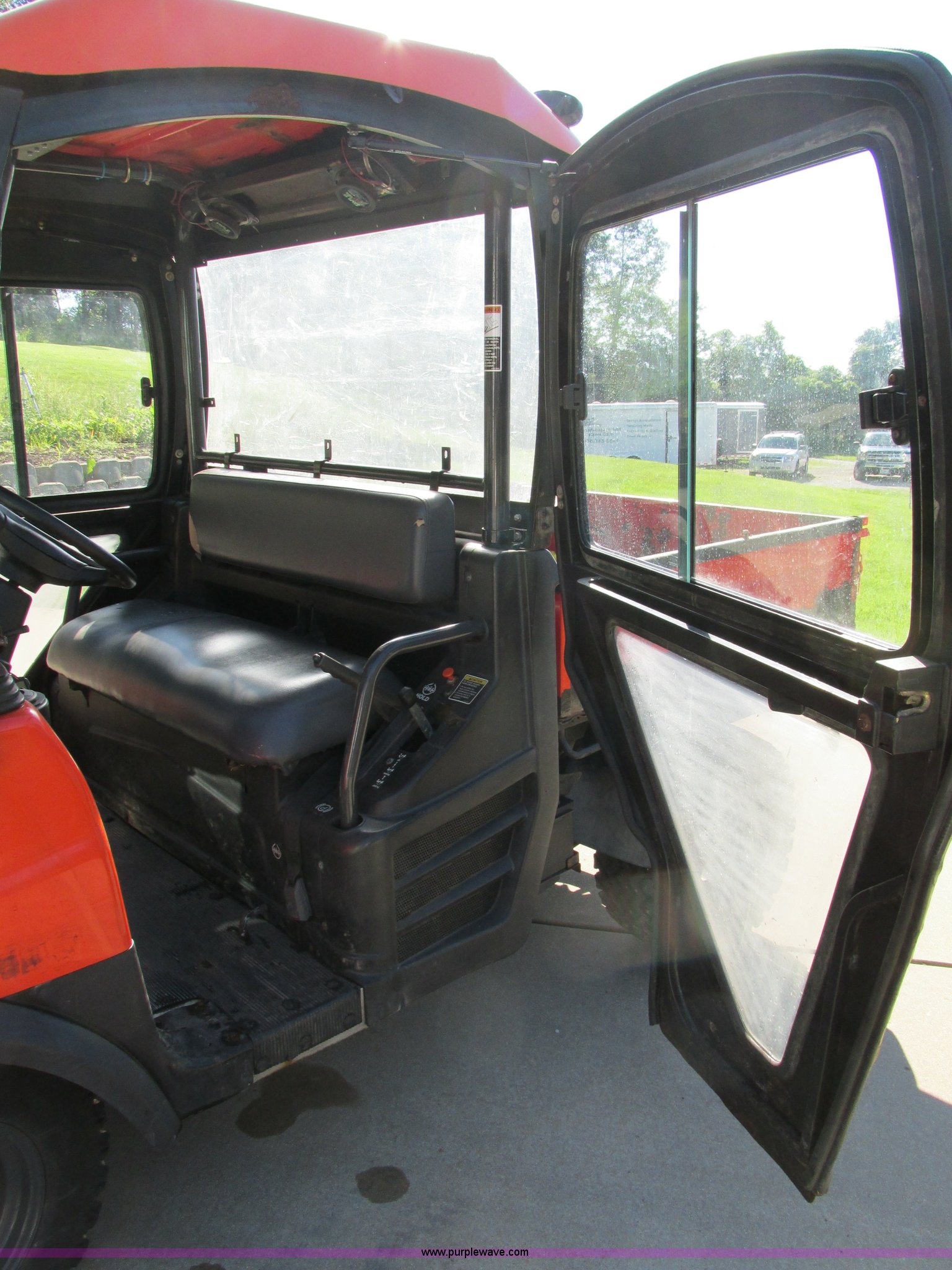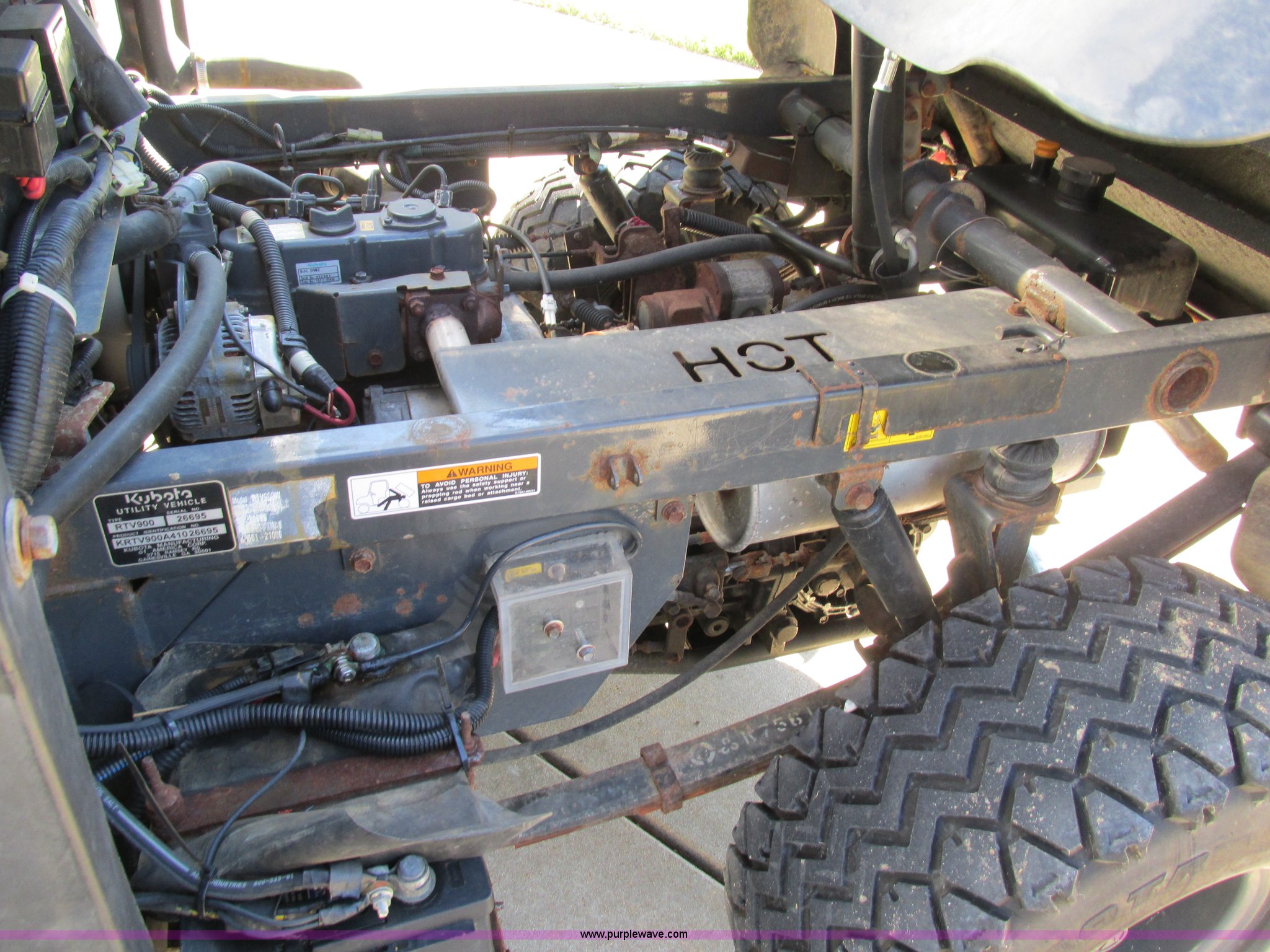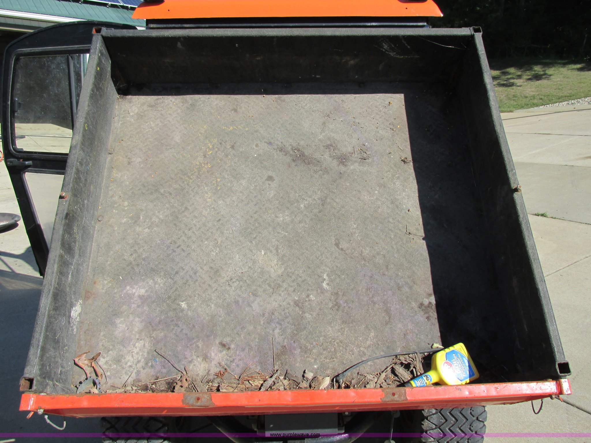 Purple Wave is selling a used Utility Vehicle in Missouri. This item is a 2004 Kubota RTU900 UTV with the following: 1,971 hours on meter, Kubota D982 three cylinder diesel engine, Serial RRTV900A41026695, Hi-Lo transmission, Four wheel drive, Enclosed cab, Heat, AM/FM/CD, Front work lights, Yellow strobe light, 47" x 52" hydraulic dump bed, Spray-in bed liner, 6'W snow plow, Hydraulic raise and lower, Hydraulic angle adjustment, In-cab plow controls, Spreader controls, Rear hydraulic remotes plumbed for spreader, 12V auxiliary outlet, Hazard lights, 1.5" x 1.5" hitch, Spring suspension, 350 Mag tires, Serial 26695