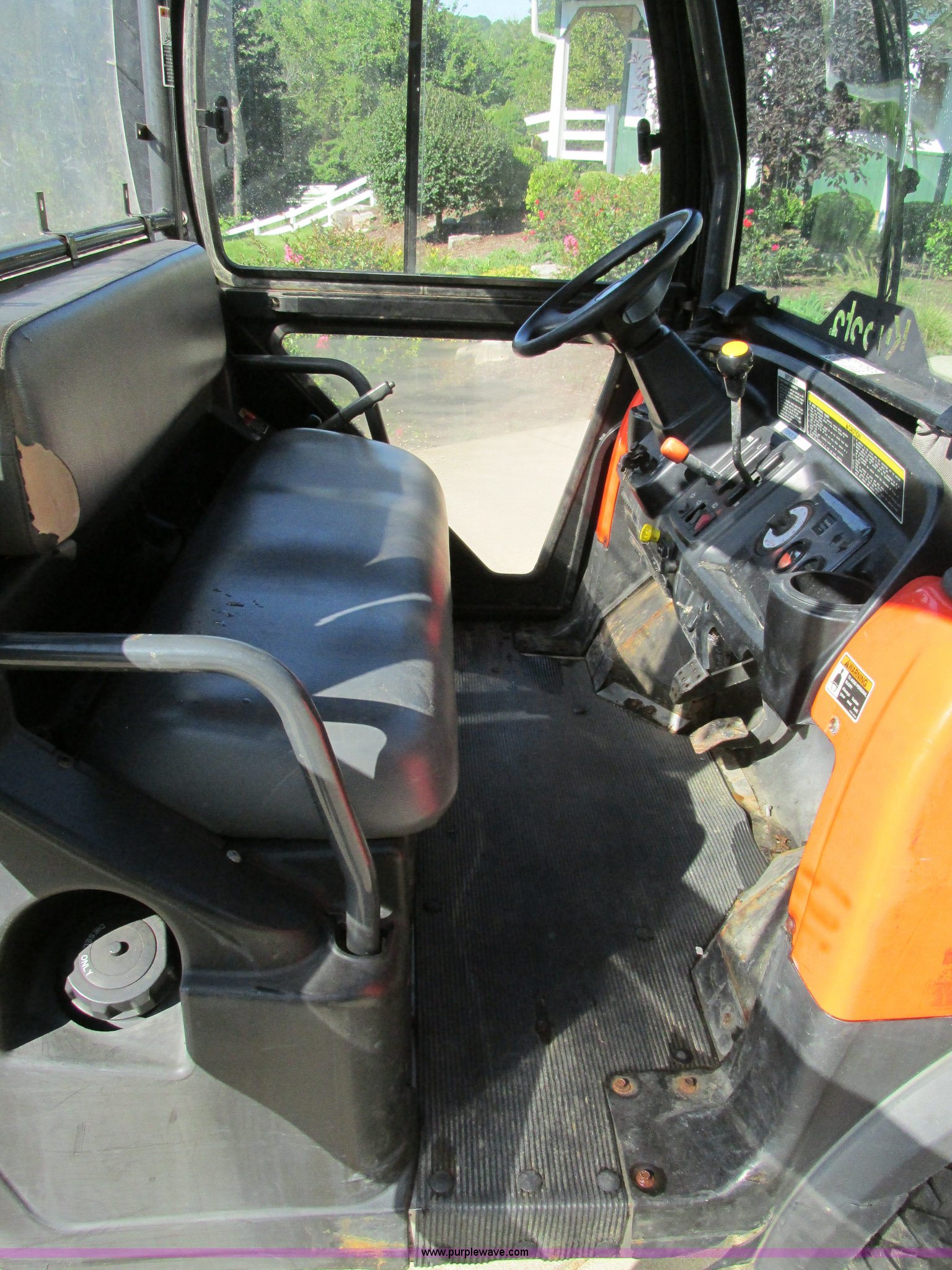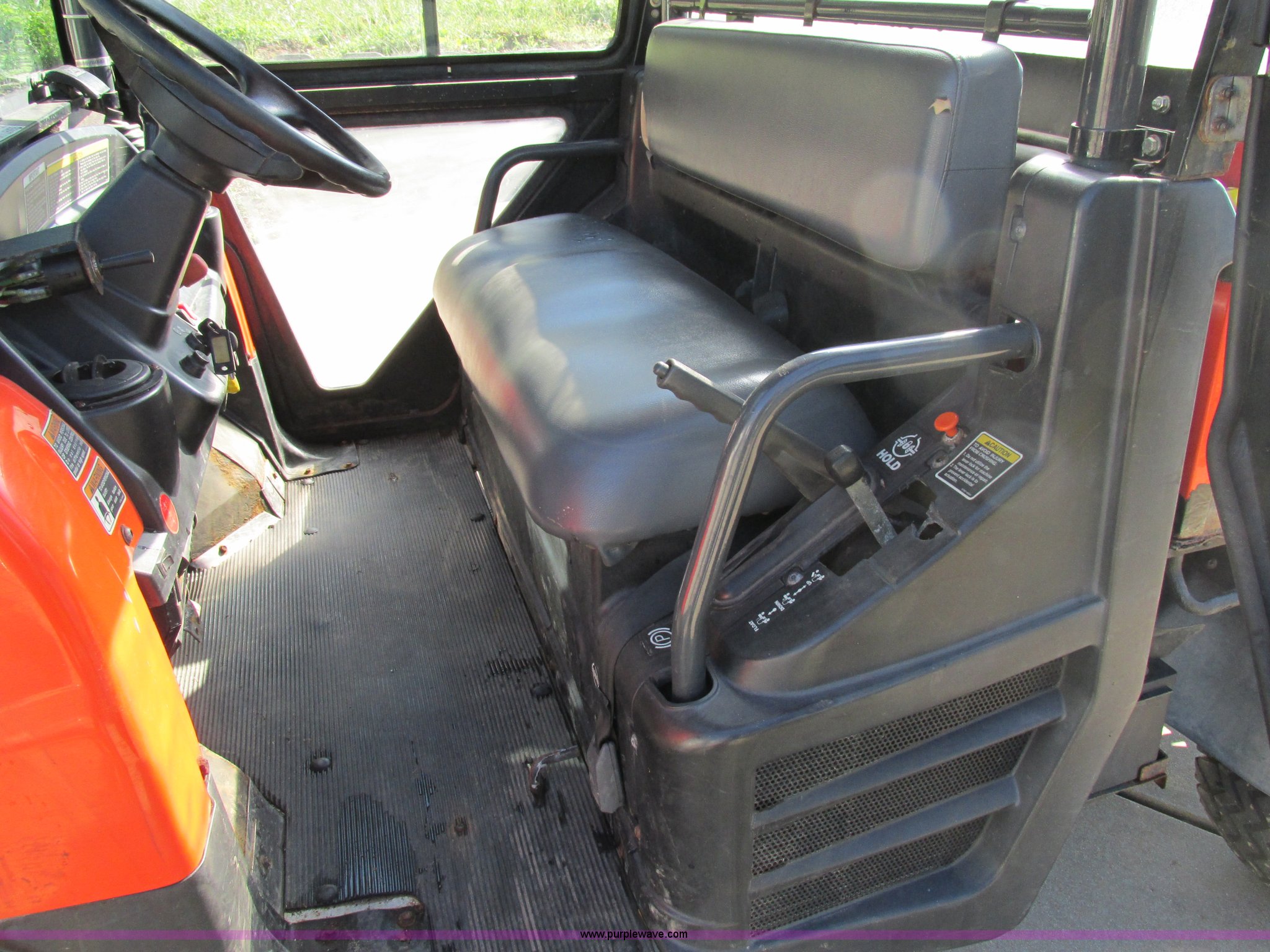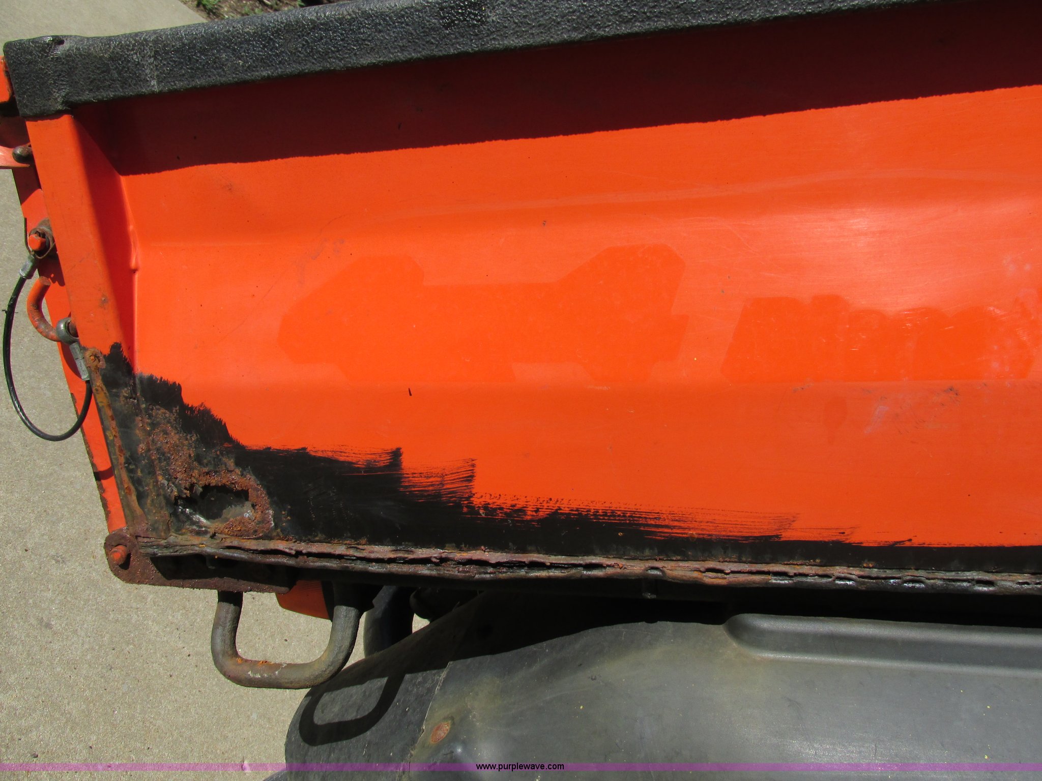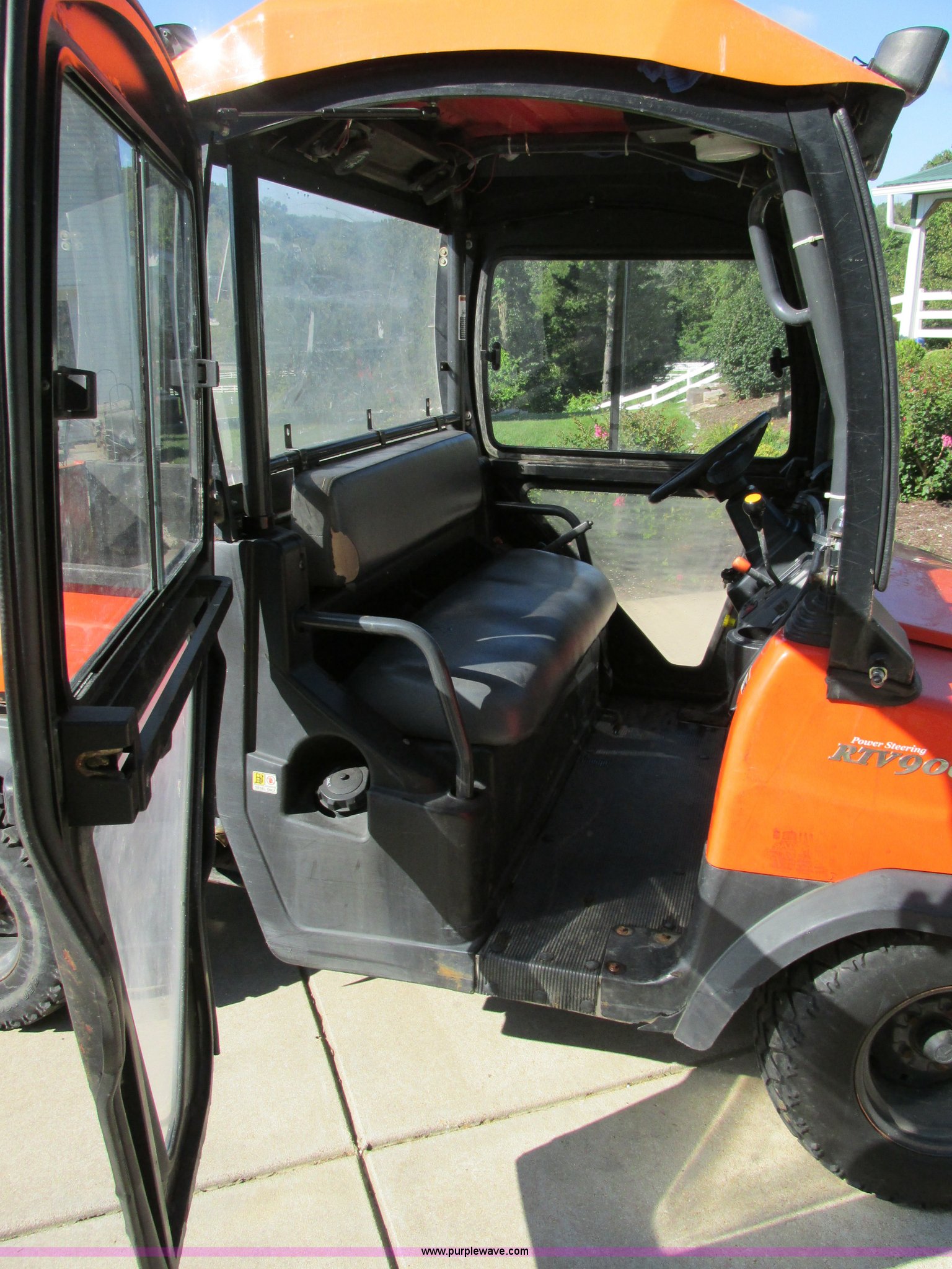 Purple Wave is selling a used Utility Vehicle in Missouri. This item is a 2004 Kubota RTU900 UTV with the following: 1,971 hours on meter, Kubota D982 three cylinder diesel engine, Serial RRTV900A41026695, Hi-Lo transmission, Four wheel drive, Enclosed cab, Heat, AM/FM/CD, Front work lights, Yellow strobe light, 47" x 52" hydraulic dump bed, Spray-in bed liner, 6'W snow plow, Hydraulic raise and lower, Hydraulic angle adjustment, In-cab plow controls, Spreader controls, Rear hydraulic remotes plumbed for spreader, 12V auxiliary outlet, Hazard lights, 1.5" x 1.5" hitch, Spring suspension, 350 Mag tires, Serial 26695