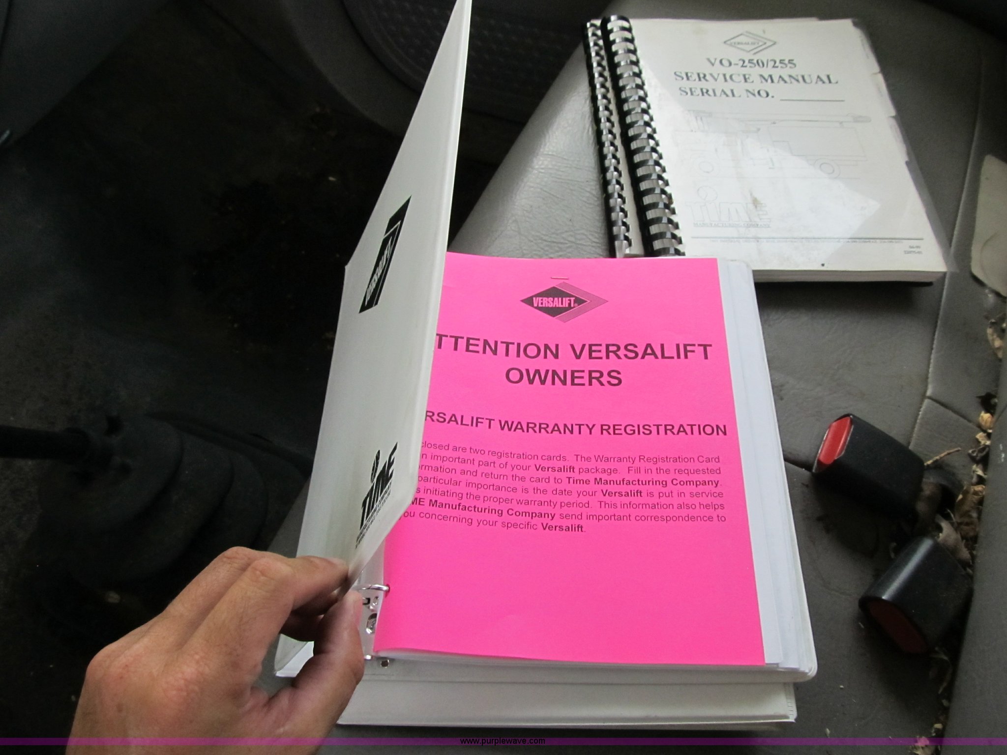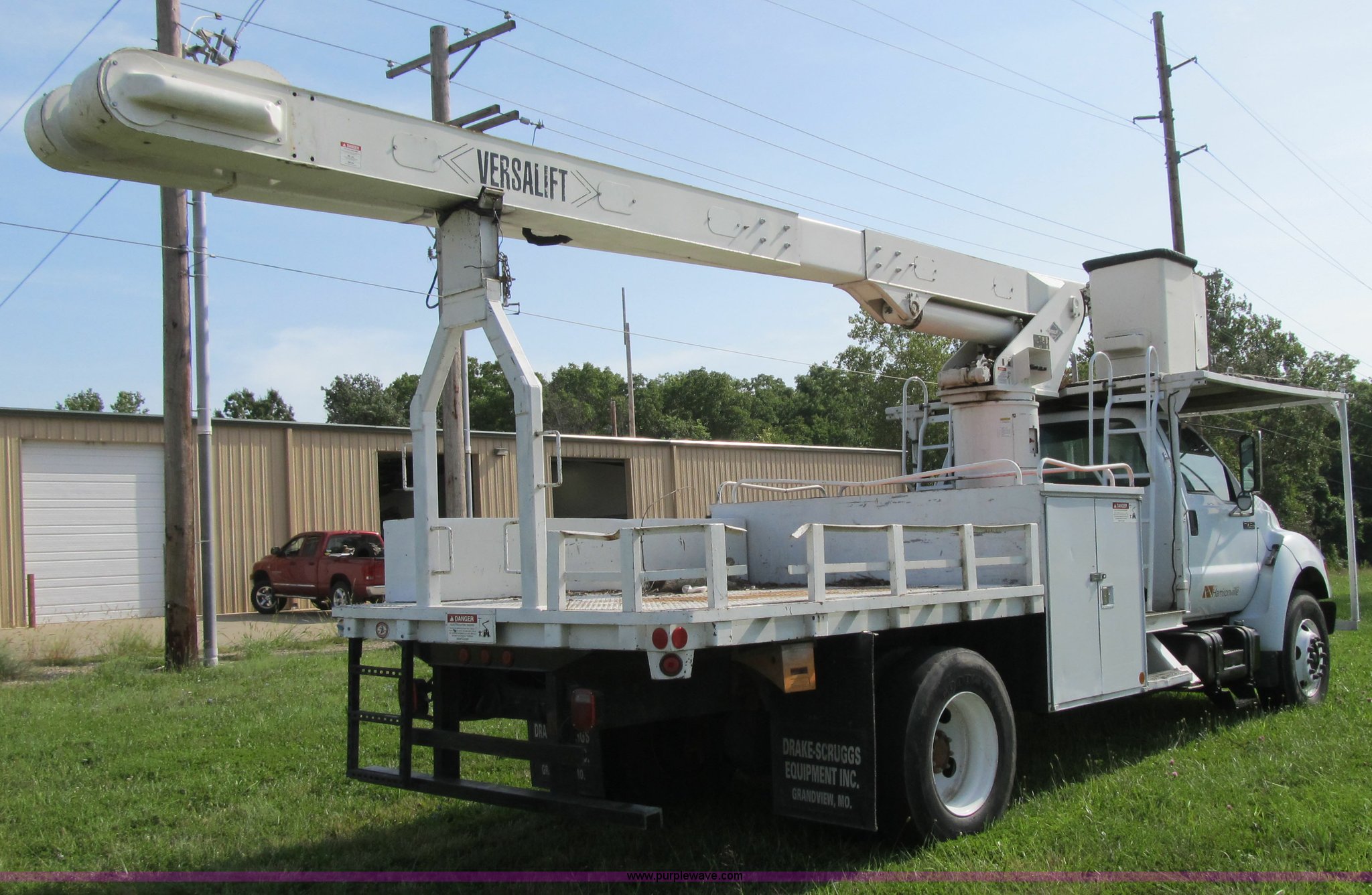 Purple Wave is selling a used Bucket Truck in Missouri. This item is a 2000 Ford F750 Super Duty XL boom truck with the following: 17,136 actual miles, Caterpillar 3126B six cylinder turbo diesel engine, Six speed manual transmission, Heat, AM/FM, Manual windows and locks, Vinyl interior, PTO, 4,181 PTO hours on meter, Backup alarm, (2) double door toolboxes, Rub rail, Stake pockets, Versalift VR55 man lift, Ground and basket controls, Over cab cat walk for basket entry, Remote throttle up and engine start stop, Dual hydraulic baskets remotes, (2) hydraulic outriggers, 50 gallon fuel tank, 194" wheelbase, 11R22.5 tires, GVWR 33,000 lbs, FAWR 12,000 lbs, RAWR 21,000 lbs, One owner, Dents