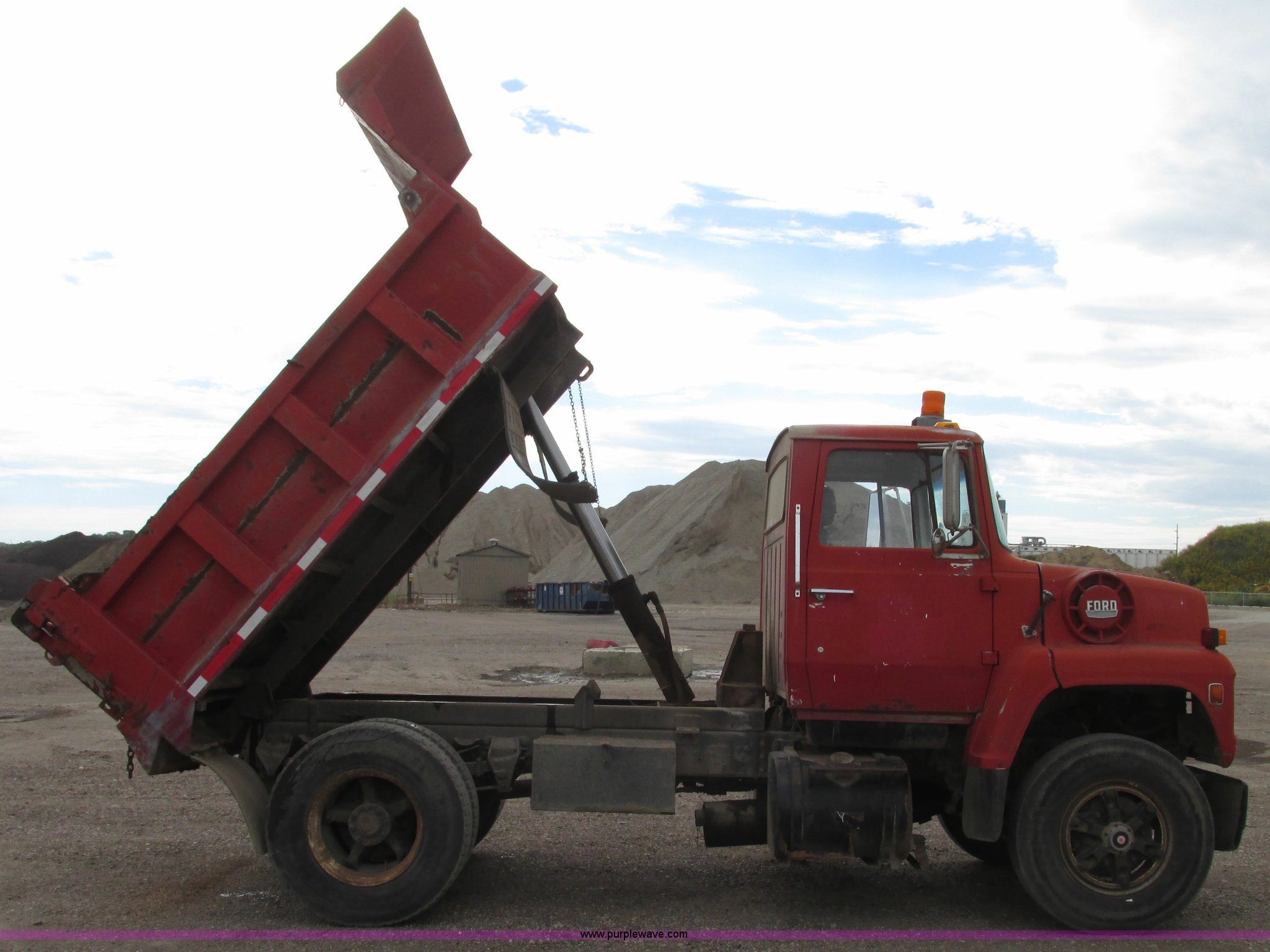 Purple Wave is selling a used Construction Dump Truck in Iowa. This item is a 1984 Ford 8000 dump truck with the following: 218,741 miles on odometer, 795 hours on meter, Caterpillar 3208 10.4L V8 diesel engine, Automatic transmission, Heat, Air suspension seat, PTO, Hayes Synchronizer trailer brake controller, Strobe light, 10'L dump bed, 78.5"H sides from ground to top, Three stage single ram, Master battery shut-off, Pintle hitch, 3,000 lbs rated capacity, Spring suspension, Air brakes, 150" wheelbase, 11R22.5 tires, Roof cracked, Headliner missing, Unit# 140044