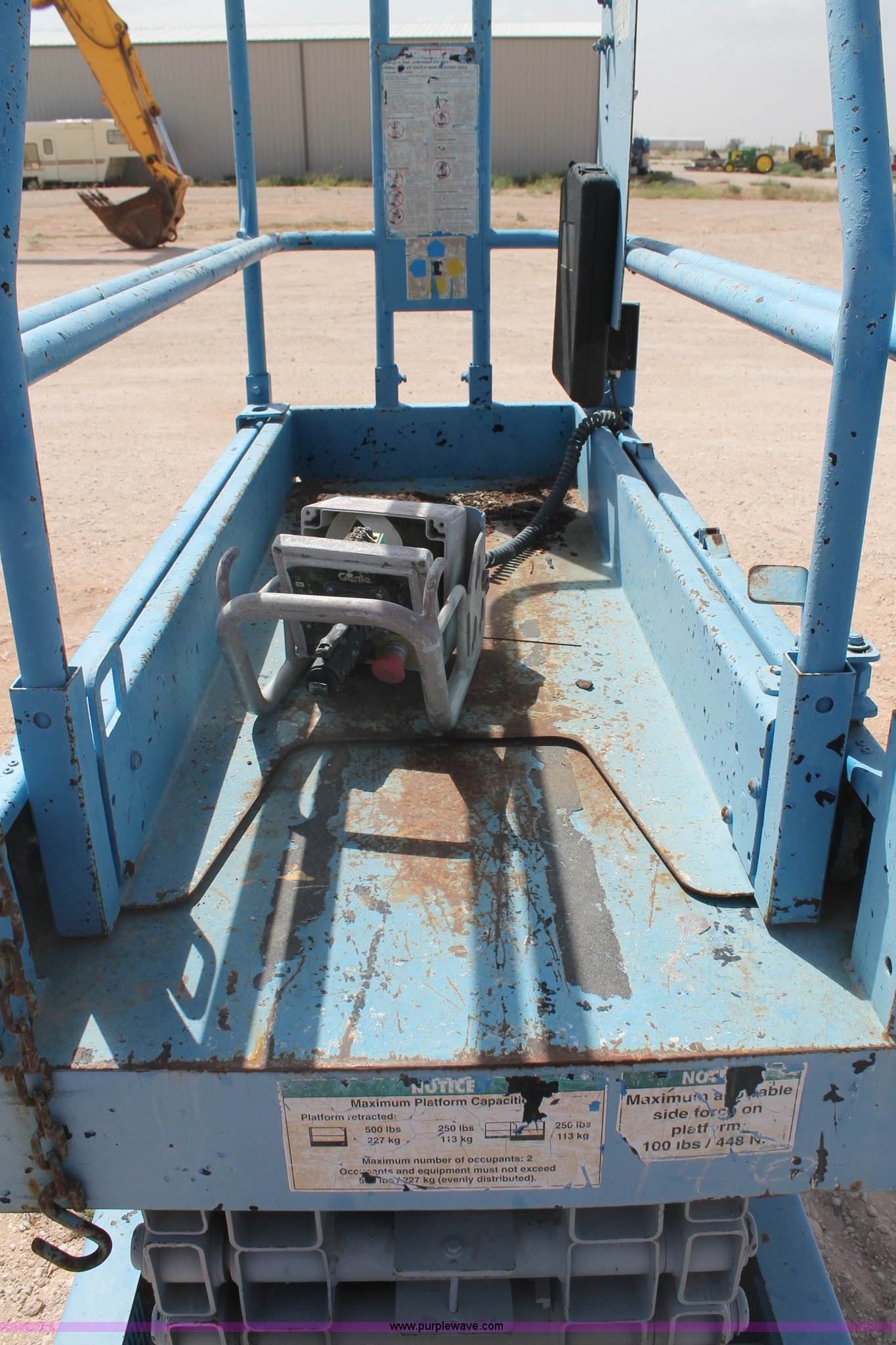 Genie GS-1930 scissor lift. 976 hours on meter, 500 lbs maximum lift capacity, Four stage lift, Joystick controls, 64"L x 29"W platform, 58" slide-out platform extension, Electric over hydraulic operation, Some repairs needed. Seminole, TX 79360