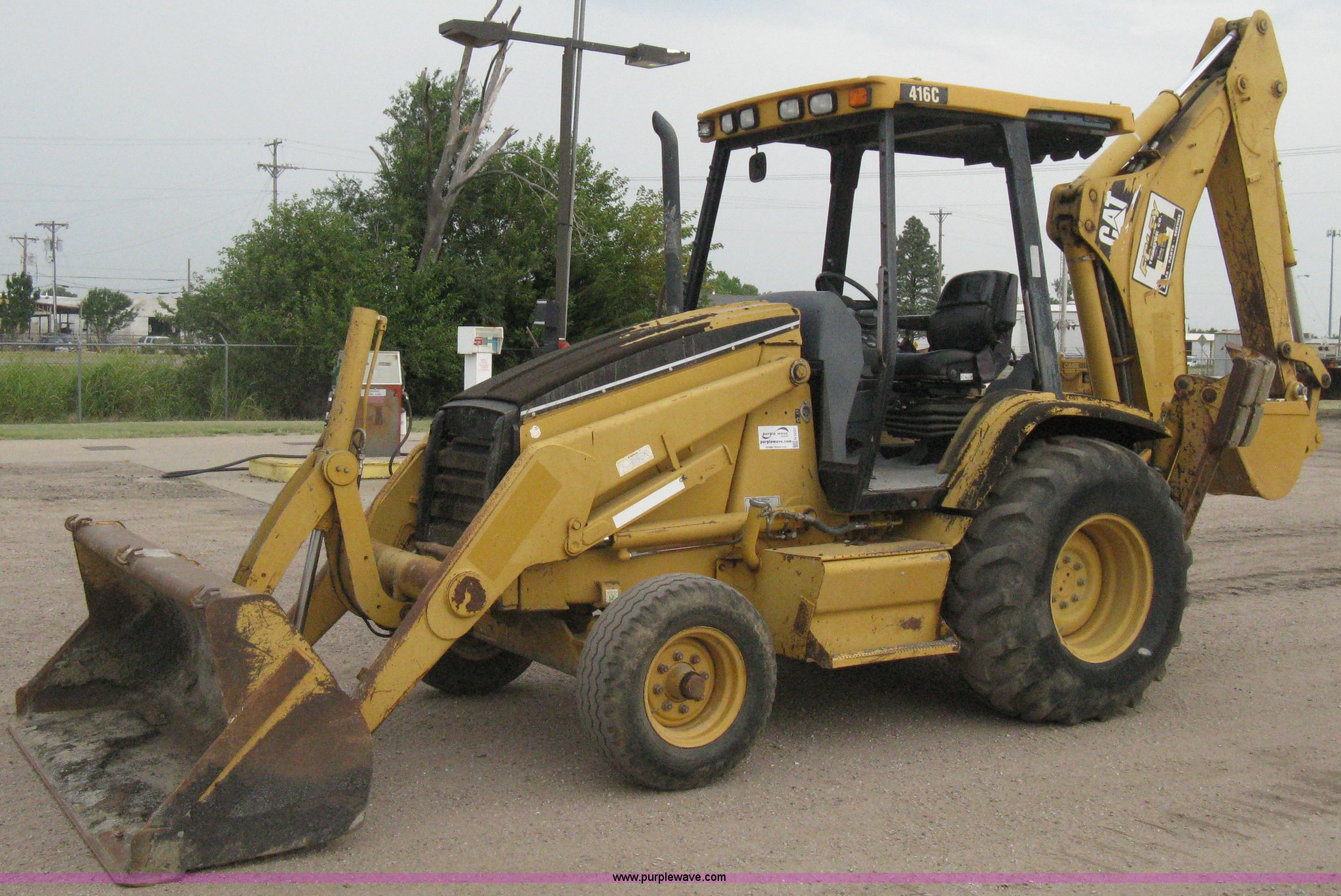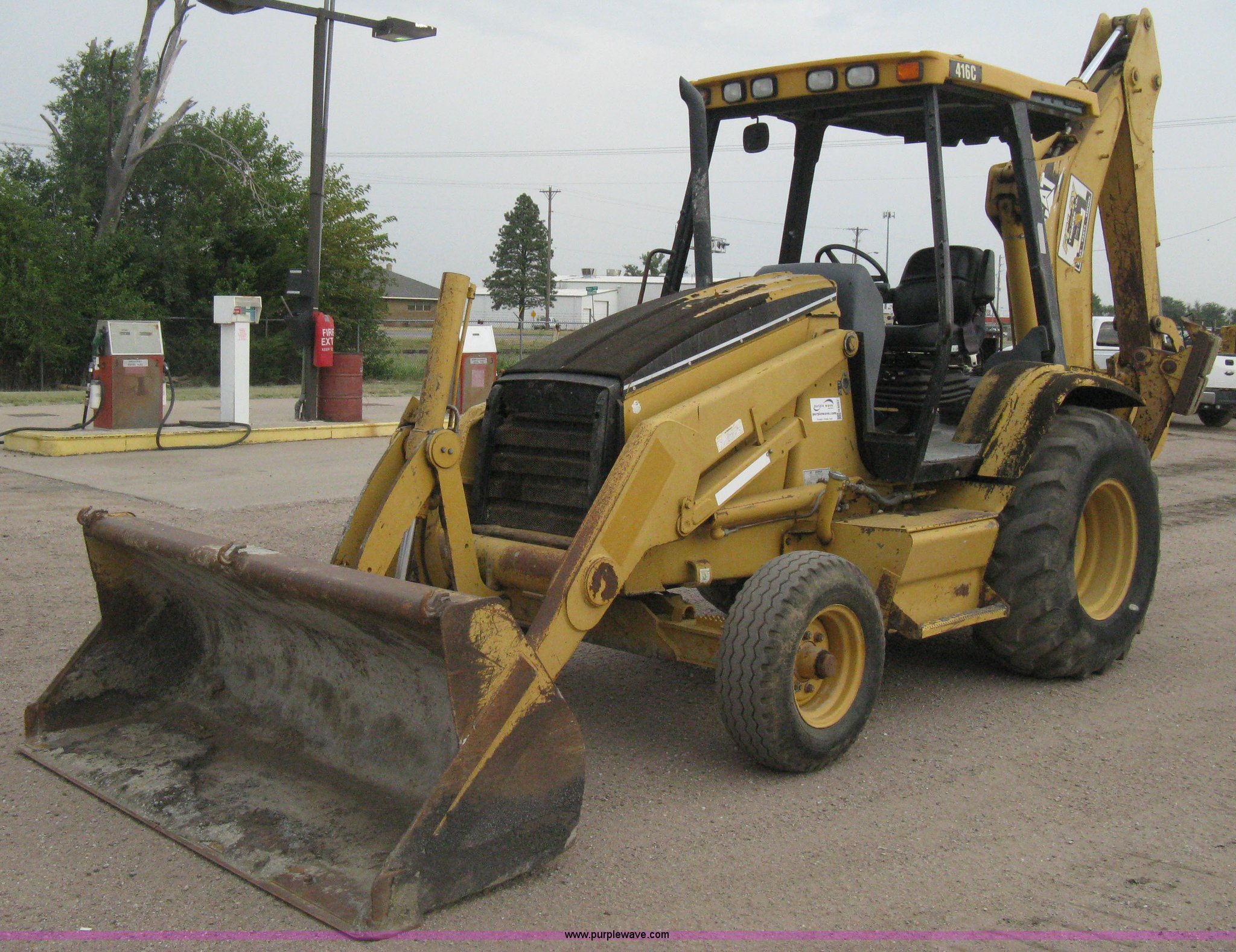 1998 Caterpillar 416C backhoe. 7,404 hours on meter, Caterpillar diesel engine Serial 5HK79549, Shuttle shift transmission 4F-4R gears, OROPS, Air suspension seat, Four stick backhoe controls, Front and rear work lights, 18"W toothed backhoe bucket, Outriggers with street pads, 87"W loader bucket Bolt-on cutting edge, Vandal guard, Galaxy 11L-16.5L front tires, 19.5L-24 rear tires, 13,892 lbs. base operating weight, Nails in rear tire, Serial 5YN06330, Unit# 53.57L. View equipment video. Sherwood Construction. 3219 W May. Wichita, KS 67277