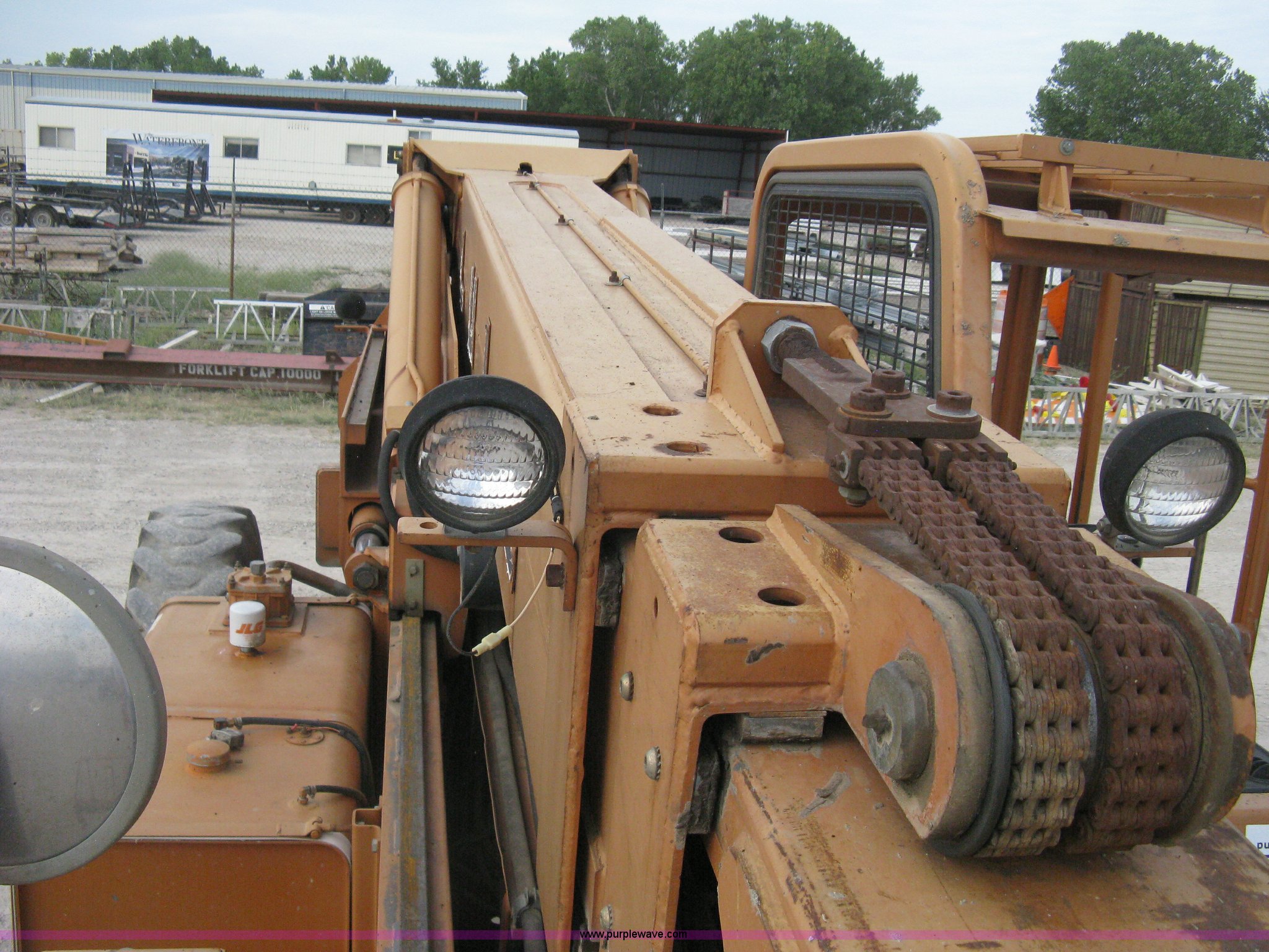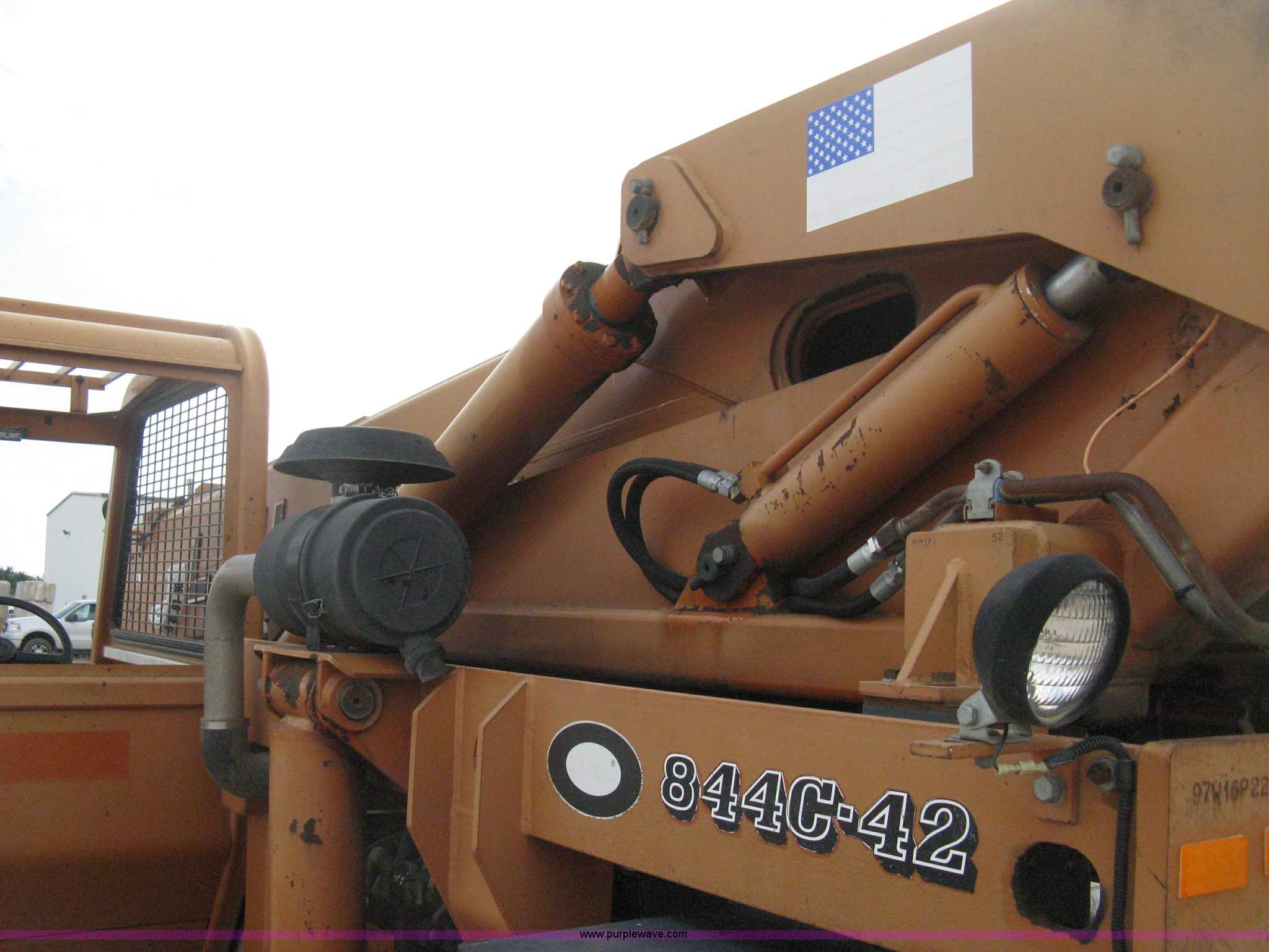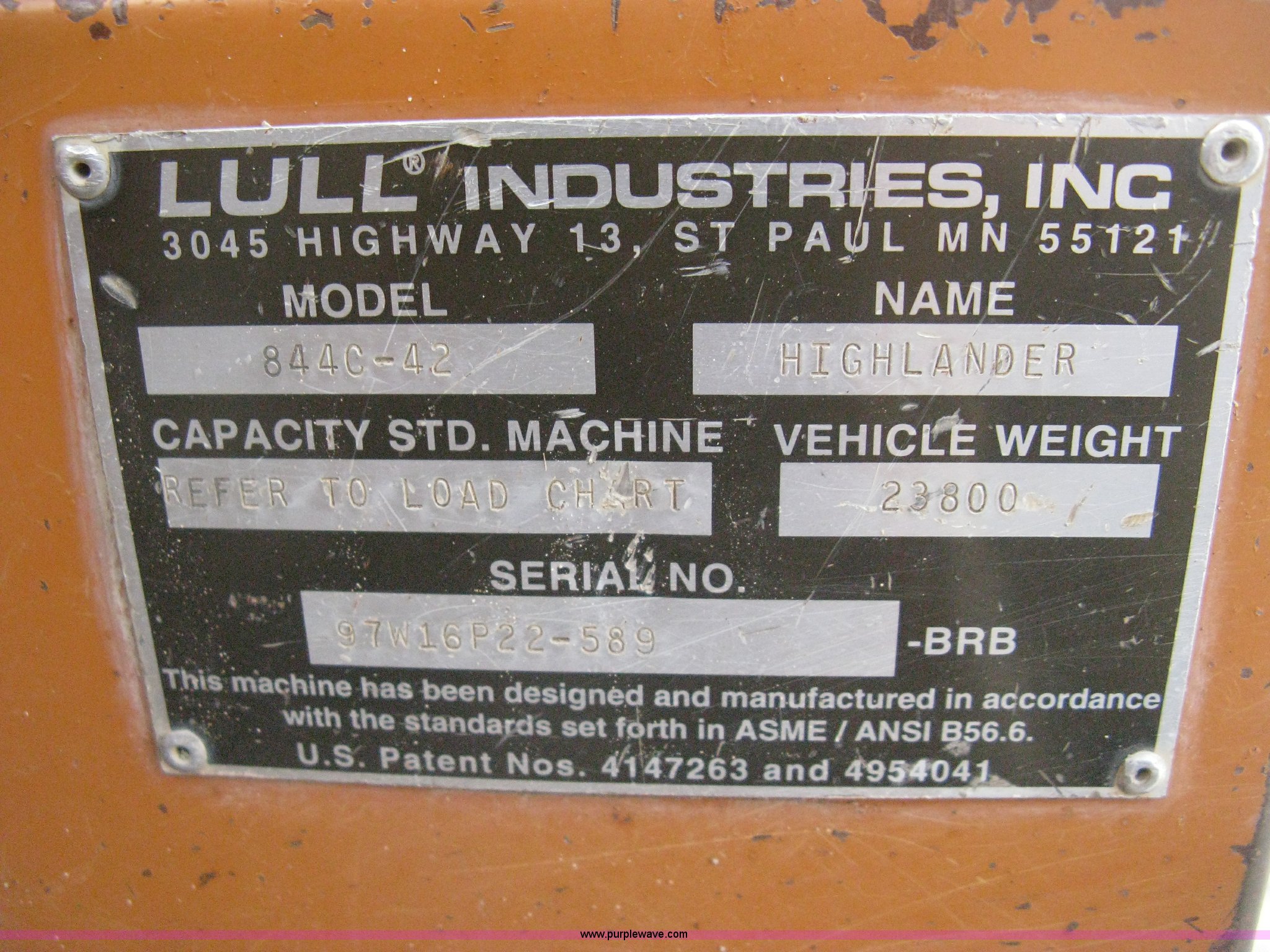 Purple Wave is selling a used Telehandler in Kansas. This item is a 1997 Lull 844C-42 Highlander telehandler with the following: 3,796 hours on meter, Approx. 8,646 total hours, John Deere 4039TF001 four cylinder diesel engine, Serial T04039T556813, Powershift transmission, 4F-4R gears, Four wheel drive, ROPS, Heat, Non-operational, 8,000 lbs lift capacity, 42'L reach, (3) boom sections, 48"L x 4"W forks, Tilt carriage, Rotating carriage, Hydraulic leveling, Auxiliary hydraulics, Quick attach, 13.00-24TG foam-filled tires, Wheel lug damage, 23,800 lbs. base operating weight, Serial 97W16P22-589, Unit# MH003