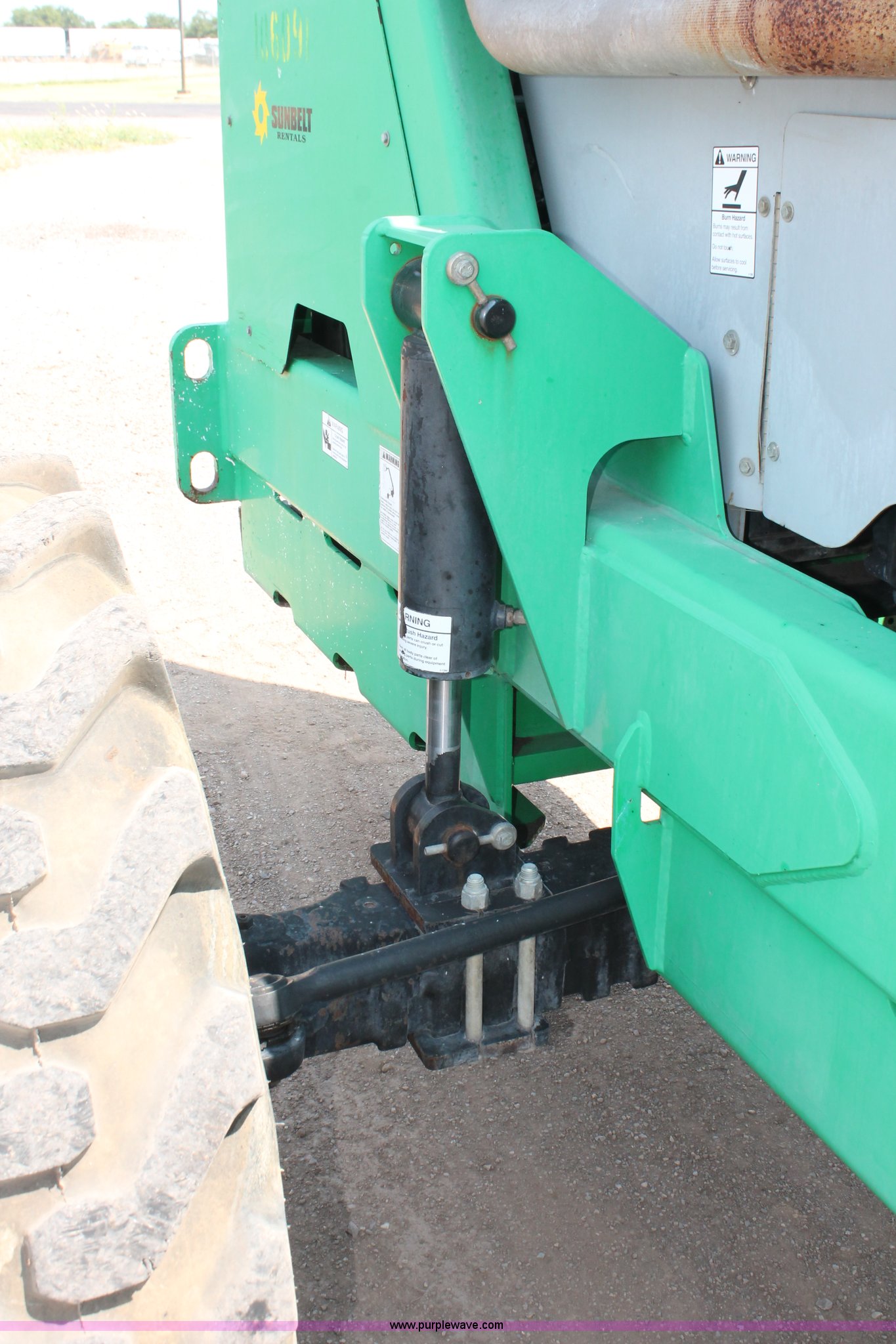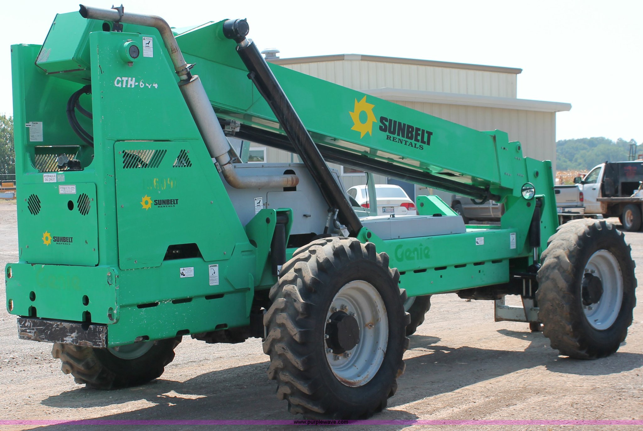 Purple Wave is selling a used Telehandler in Oklahoma. This item is a 2006 Genie GTH-644 telehandler with the following: 3,544 hours on meter, John Deere 4045TF2708 4.5L four cylinder diesel engine, 100 HP, Power shift transmission, 4F-4R gears, Four wheel drive, Crab steer, Circle steer, ROPS, 6,000 lbs maximum lift capacity, 44' maximum reach, Three boom sections, 48"L x 4"W forks, Tilt carriage, Hydraulic leveling, Hydraulic outriggers, Auxiliary hydraulics, Work lights, 13.00-24 foam filled tires, 21,564 lbs. base operating weight, Serial GTH0606A-9882