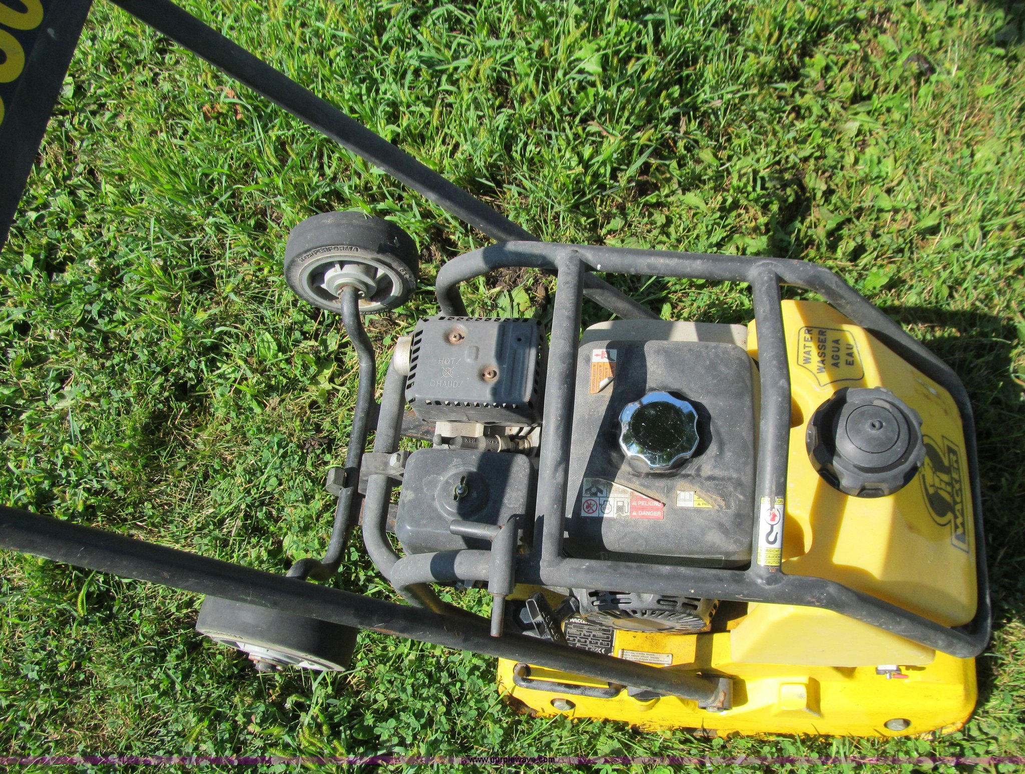 Purple Wave is selling a used Walk Behind Compactor in Iowa. This item is a Wacker WP1550 walk-behind vibratory plate compactor with the following: Honda 5.5HP one cylinder gas engine, 18" x 22" plate, Transport wheel kit, Lifting bail, Water system, Serial 5459505
