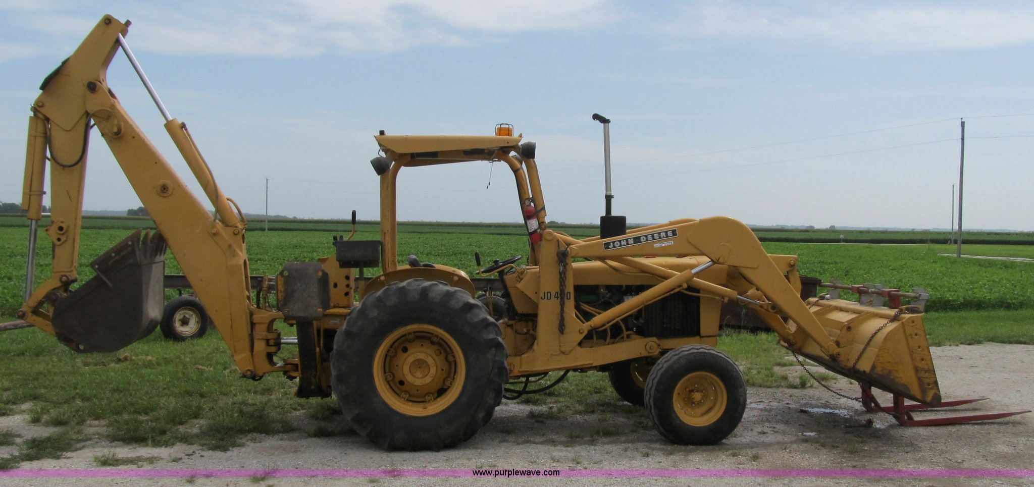 Purple Wave is selling a used Tractor Loader Backhoe in Missouri. This item is a John Deere 400 backhoe with the following: 3,768 hours on meter, John Deere 4129DR10 four cylinder diesel engine, Engine remanufactured within the last 200 hours, Serial 422284T, Powershift transmission, 8F-8R gears, ROPS canopy, Two stick backhoe controls, Hydraulic outriggers, Standard front end loader, John Deere 80"W bucket, Weld-on cutting edge, 4'L forks, 28" backhoe bucket, 12" trench bucket, 11L-15 front tires, Eight ply, 16.6-24 rear tires, Rebuilt outrigger and main boom cylinders