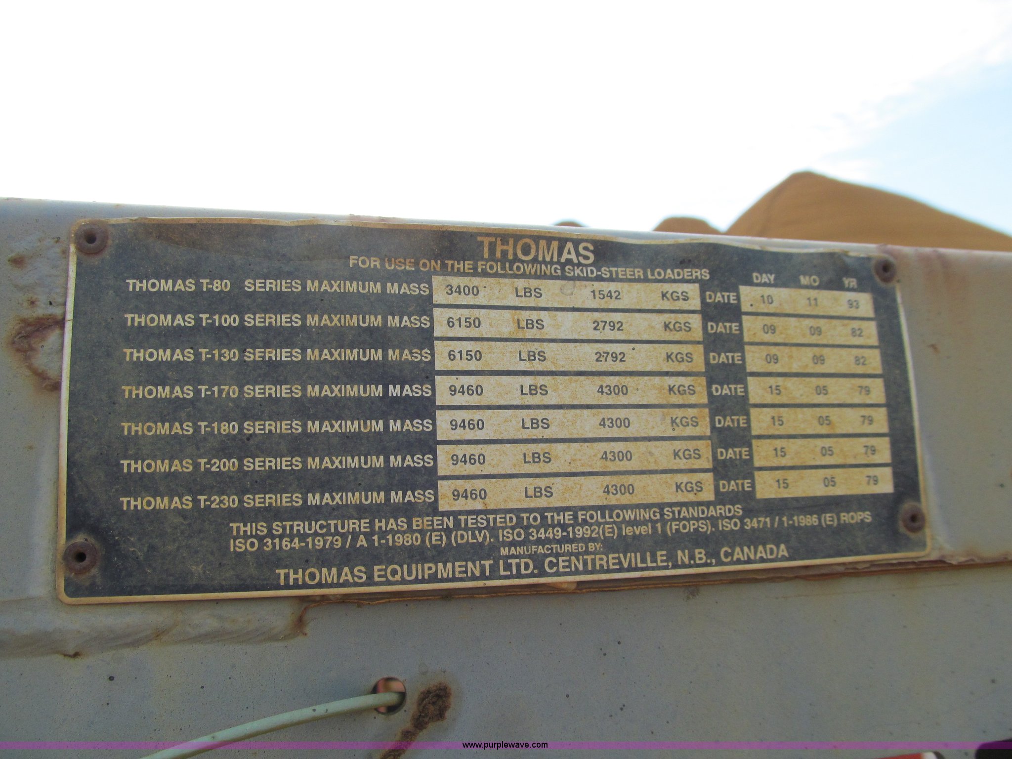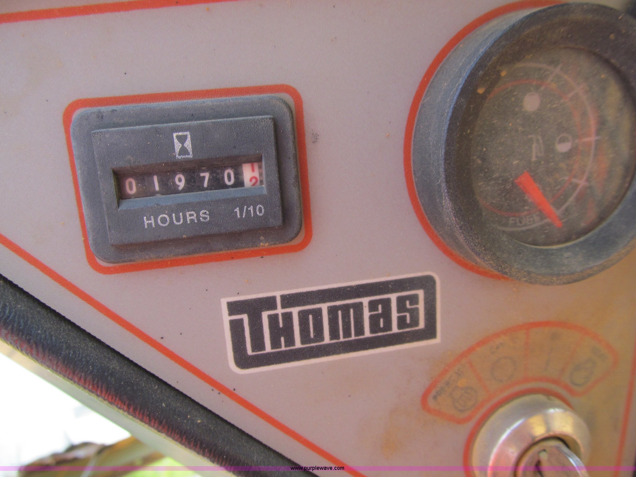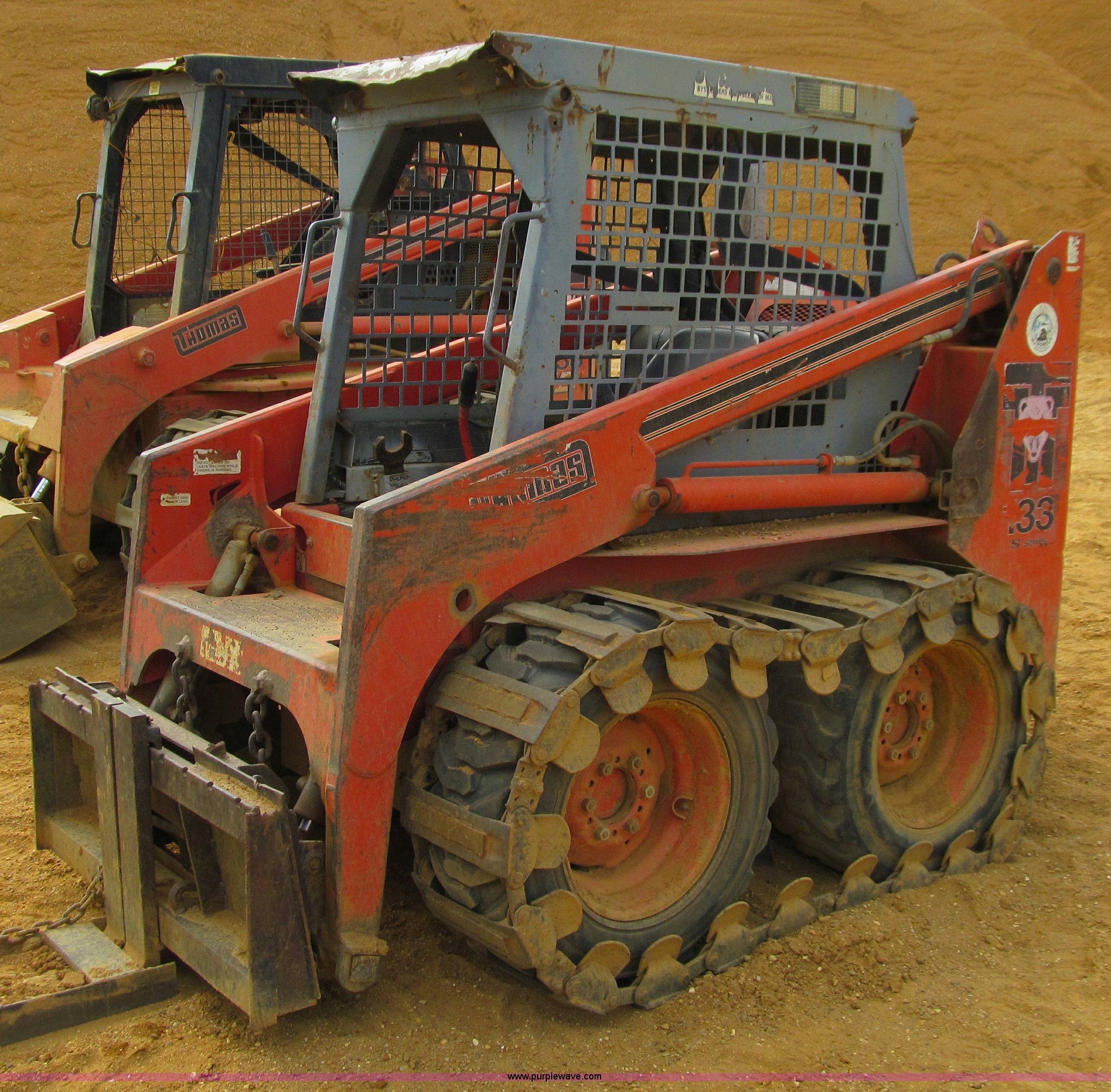 Purple Wave is selling a used Tracked Skid Steer Loader in Iowa. This item is a 1998 Thomas A50-T133 skid steer with the following: 1,970 hours on meter, Kubota 1.9L three cylinder diesel engine, 43 HP, Hydrostatic transmission, Hand and foot controls, Rear work light, Auxiliary hydraulics, Manual quick coupler, Hand wrench included, Thomas A501-U762 60"W bucket, Weld-on cutting edge, 1,300 lbs capacity, Power King 10-16.5 NHS tires, 4,800 lbs. base operating weight, Tire chains included, Clean-out tool not included, Serial LE006478S