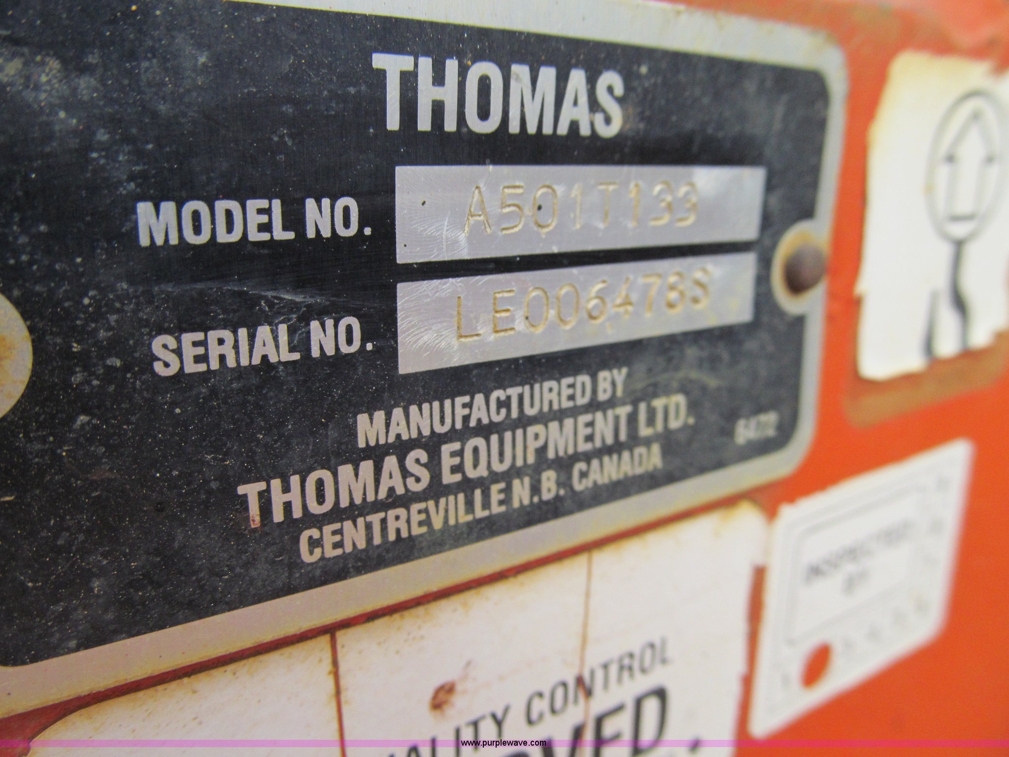1998 Thomas A50-T133 skid steer. 1,970 hours on meter, Kubota 1.9L three cylinder diesel engine 43 HP, Hydrostatic transmission, Hand and foot controls, Rear work light, Auxiliary hydraulics, Manual quick coupler Hand wrench included, Thomas A501-U762 60"W bucket Weld-on cutting edge, 1,300 lbs capacity, Power King 10-16.5 NHS tires, 4,800 lbs. base operating weight, Tire chains included, Clean-out tool not included, Serial LE006478S. View equipment video. McAlister Parts and Equipment, Inc.. 3056 270th St. Stuart, IA 50250