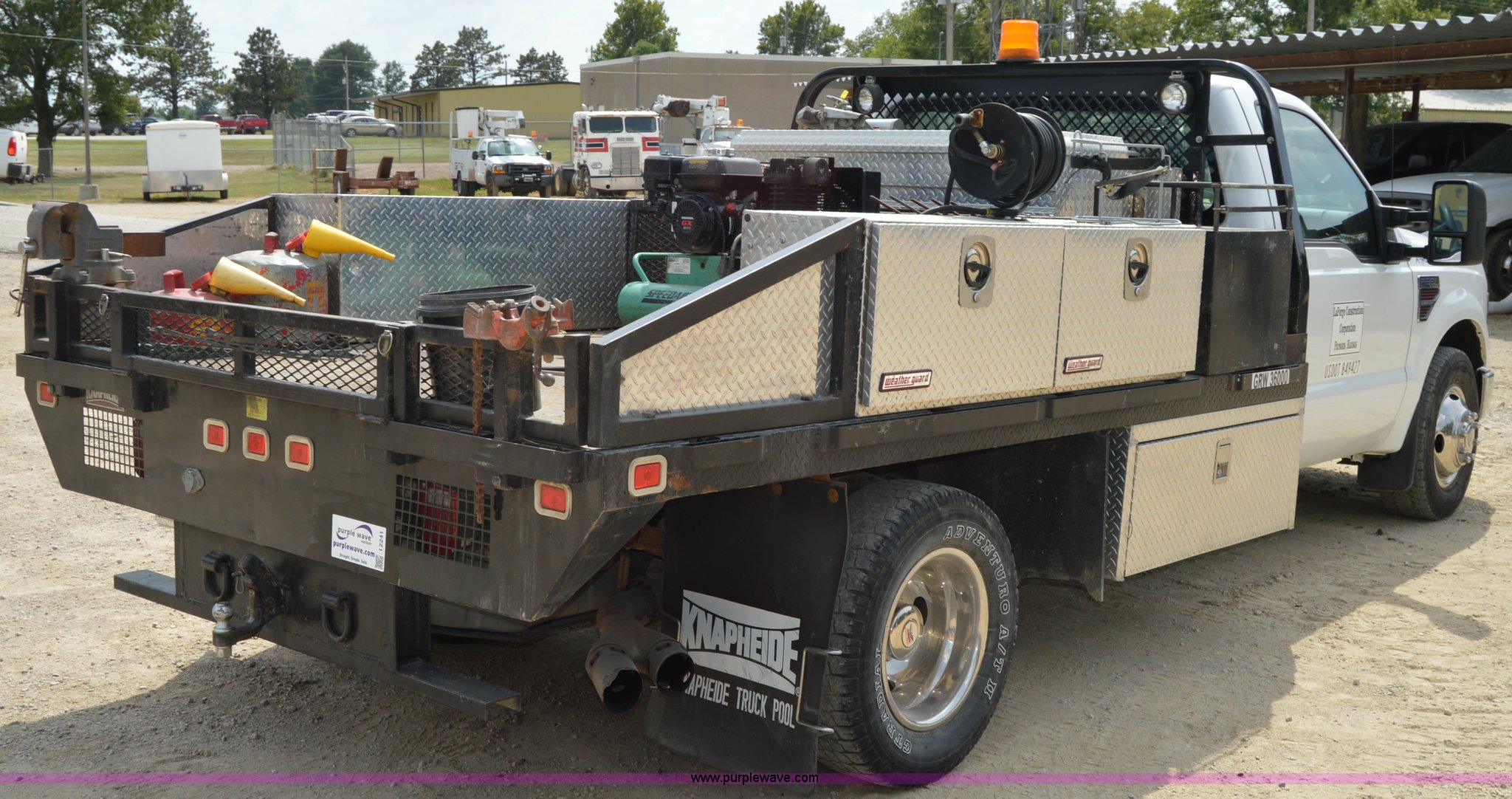 Purple Wave is selling a used Service Truck in Kansas. This item is a 2008 Ford F350 Super Duty XL service truck with the following: 122,334 miles on odometer, Mileage will vary, unit in use, 6.4L V8 OHV 32V turbo diesel engine, Automatic transmission, AC and heat, Tilt, Cruise, AM/FM/CD, Manual windows and locks, Vinyl interior, Rear work lights, Aluminum toolboxes, Tools included, 100 gallon fuel tank, 20'L fuel hose, Gas cans are not included, 3,500 watt generator, Speedair air compressor, Honda GX200 gas engine, Gooseneck hitch, Receiver hitch, Trailer wiring, 165" wheelbase, 245/75R17 tires, Windshield cracked, Unit# A465