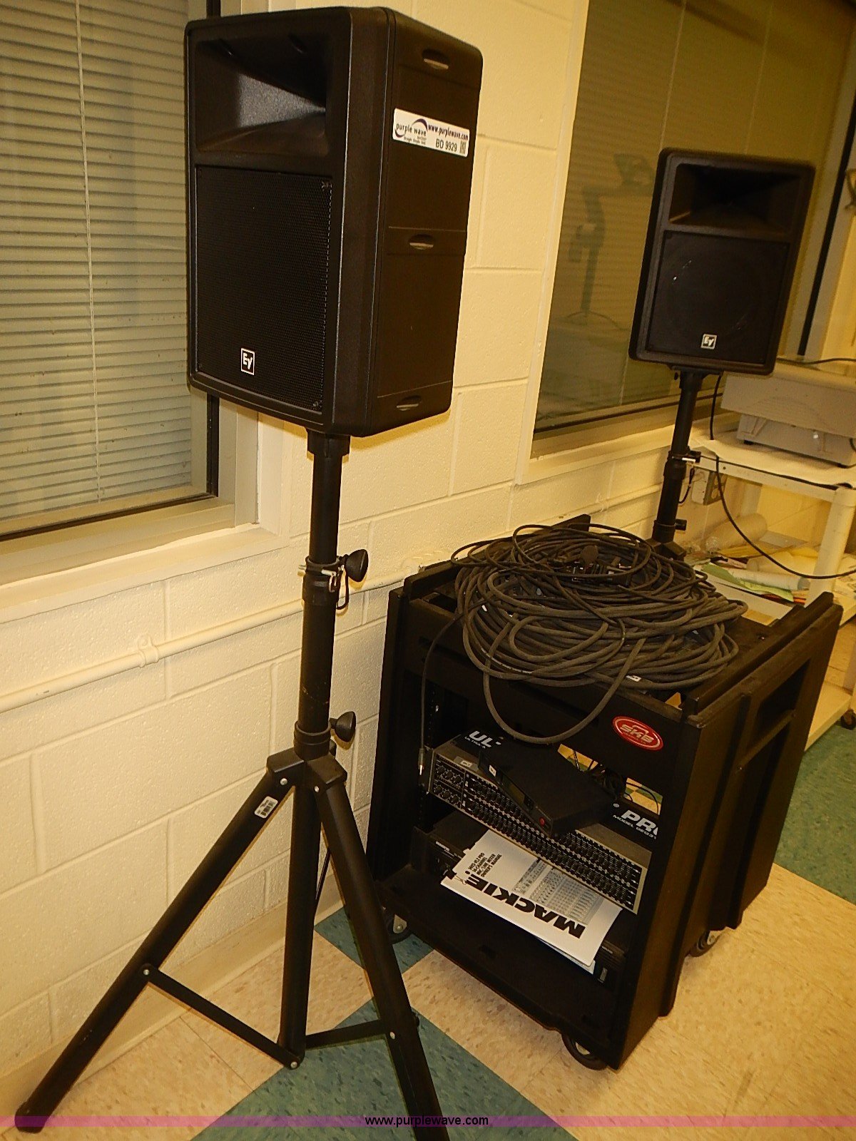 Purple Wave is selling a used Electronics in Kansas. This item is a Portable PA system with the following: (2) EV speakers, Stands, Sennheiser EW100 microphone, Power cords, Mackie 14 channel 1402-VLZ Pro microphone/line mixer, Manual, Ultra-Graph Pro equalizer, Model GEQ3102