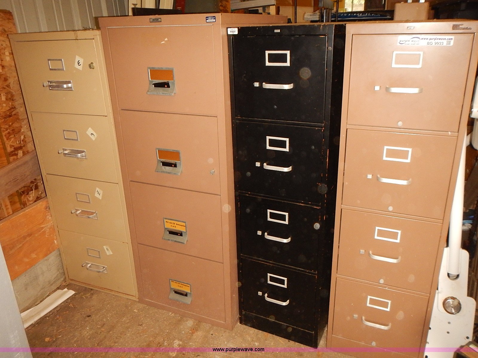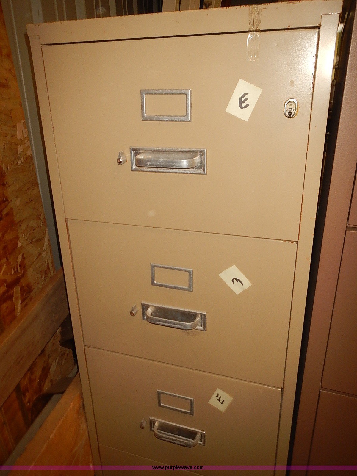 Purple Wave is selling a used Office Supplies and Equip. in Kansas. This item is a (5) metal file cabinets with the following: (3) four drawer, (2) four drawer, Fire proof, Keys