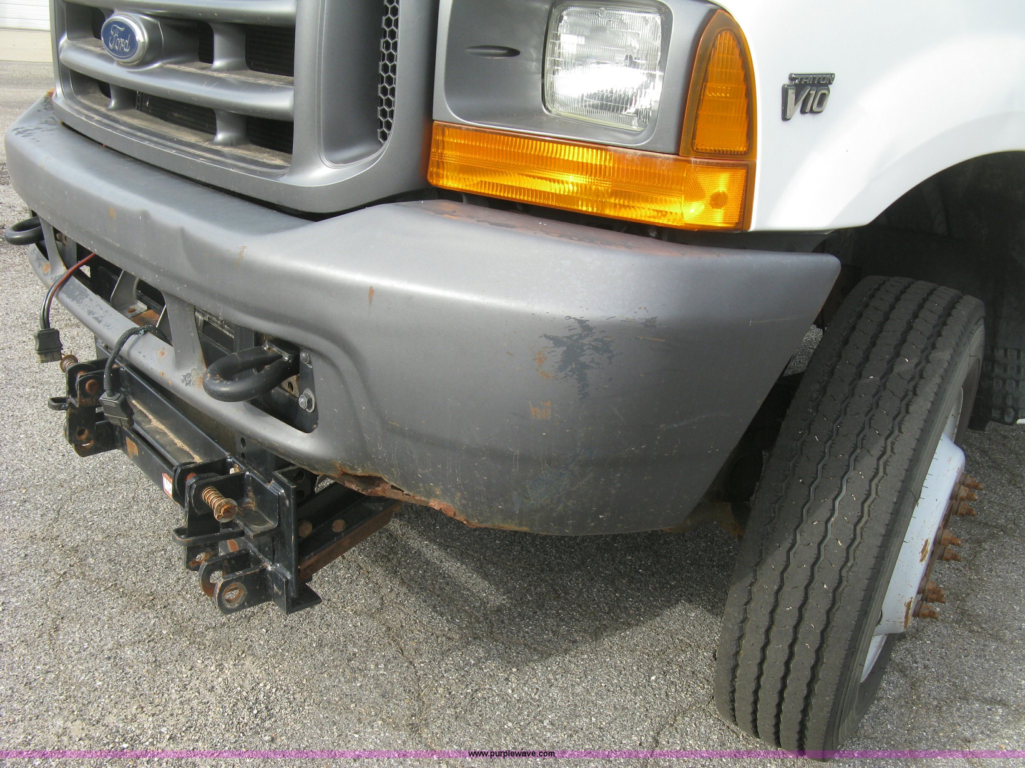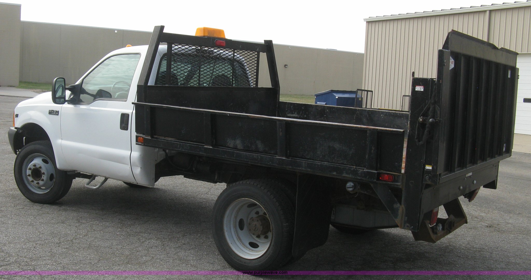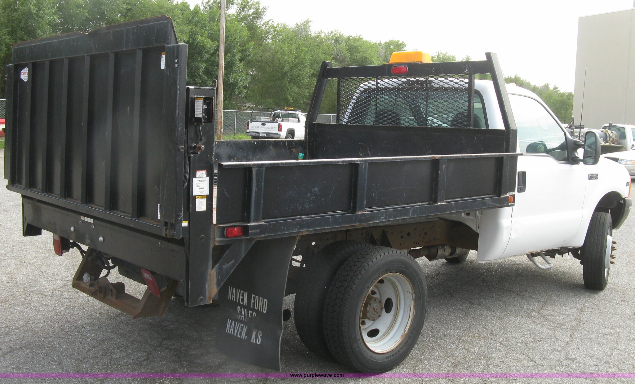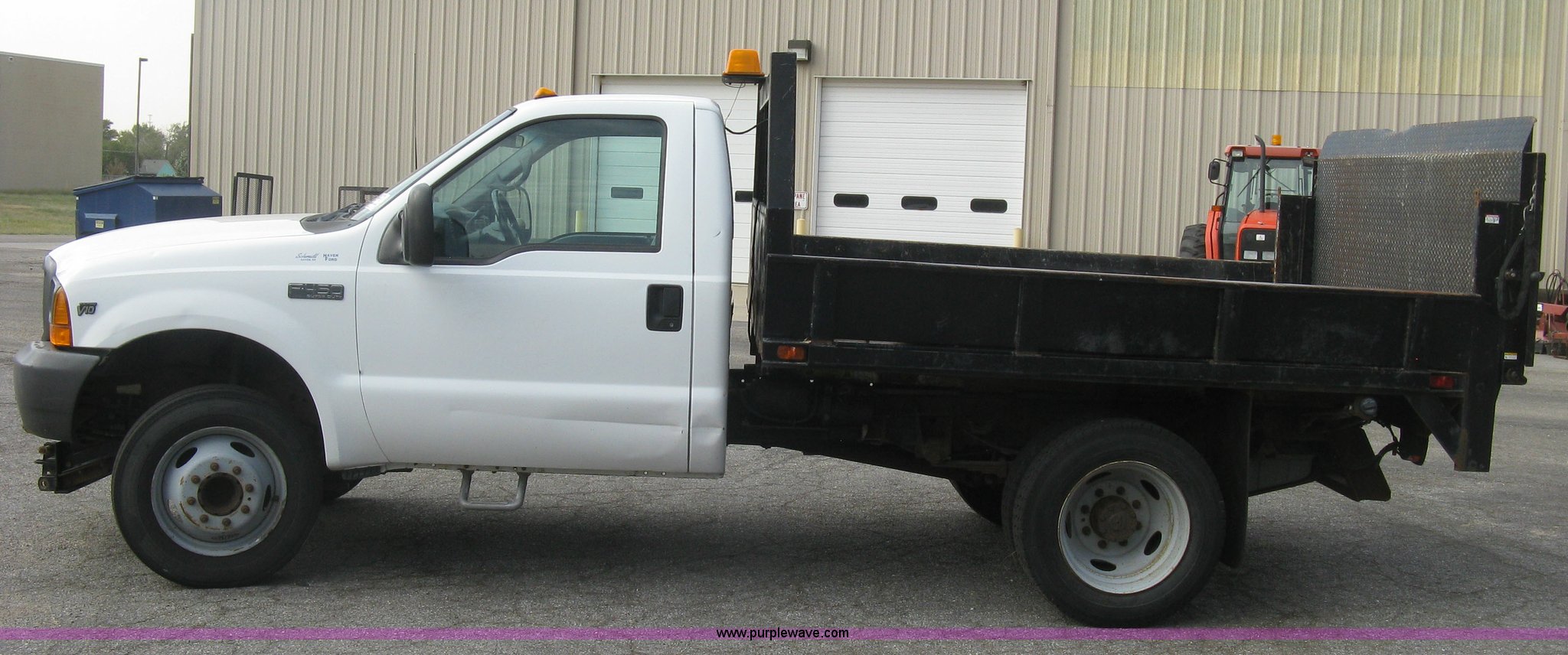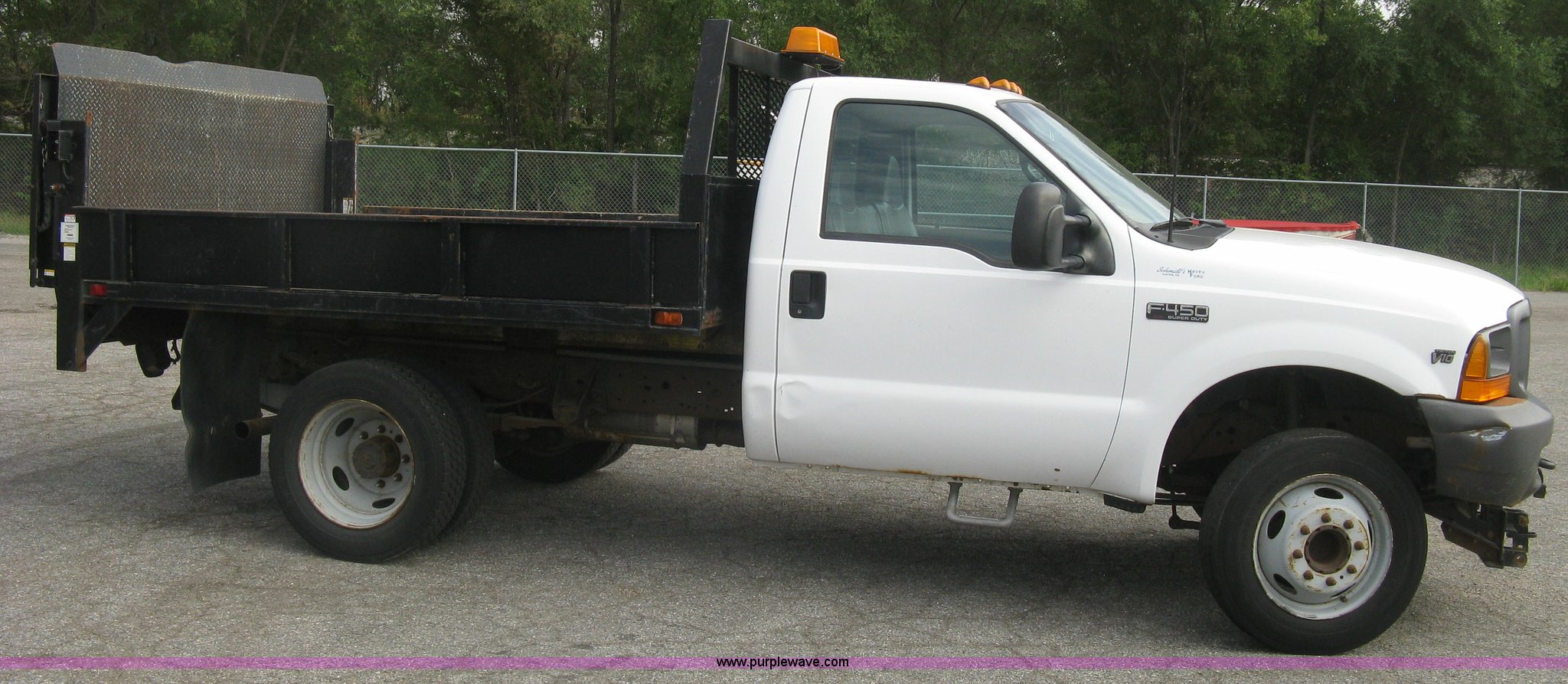 Purple Wave is selling a used Flat Bed Truck in Kansas. This item is a 2000 Ford F450 Super Duty XL flatbed truck with the following: 115,796 actual miles, 6.8L V10 SOHC 20V gas engine, Automatic transmission, AC and heat, AM/FM, Manual windows and locks, Vinyl interior, Electric trailer brake booster, Western plow control toggle, Tethered dump bed remote, 9'L x 91" dump flatbed, Harsh hoist, Tommy Gate lift gate, Large platform, Serial 00505659, Western snow plow mounting frame, No plow, Receiver hitch, Trailer wiring, 225/70R19.5 tires, Interior/exterior cosmetic damage, Cracked windshield, Catalytic converter is bad, Body damage, Rust, Unit# 94