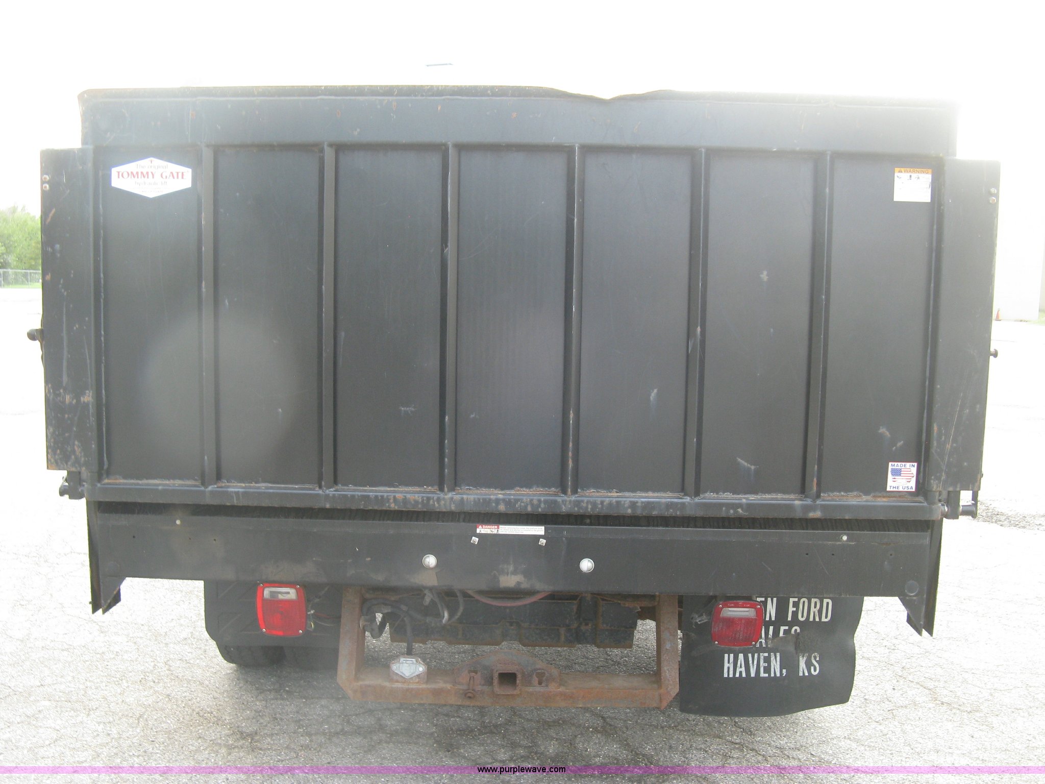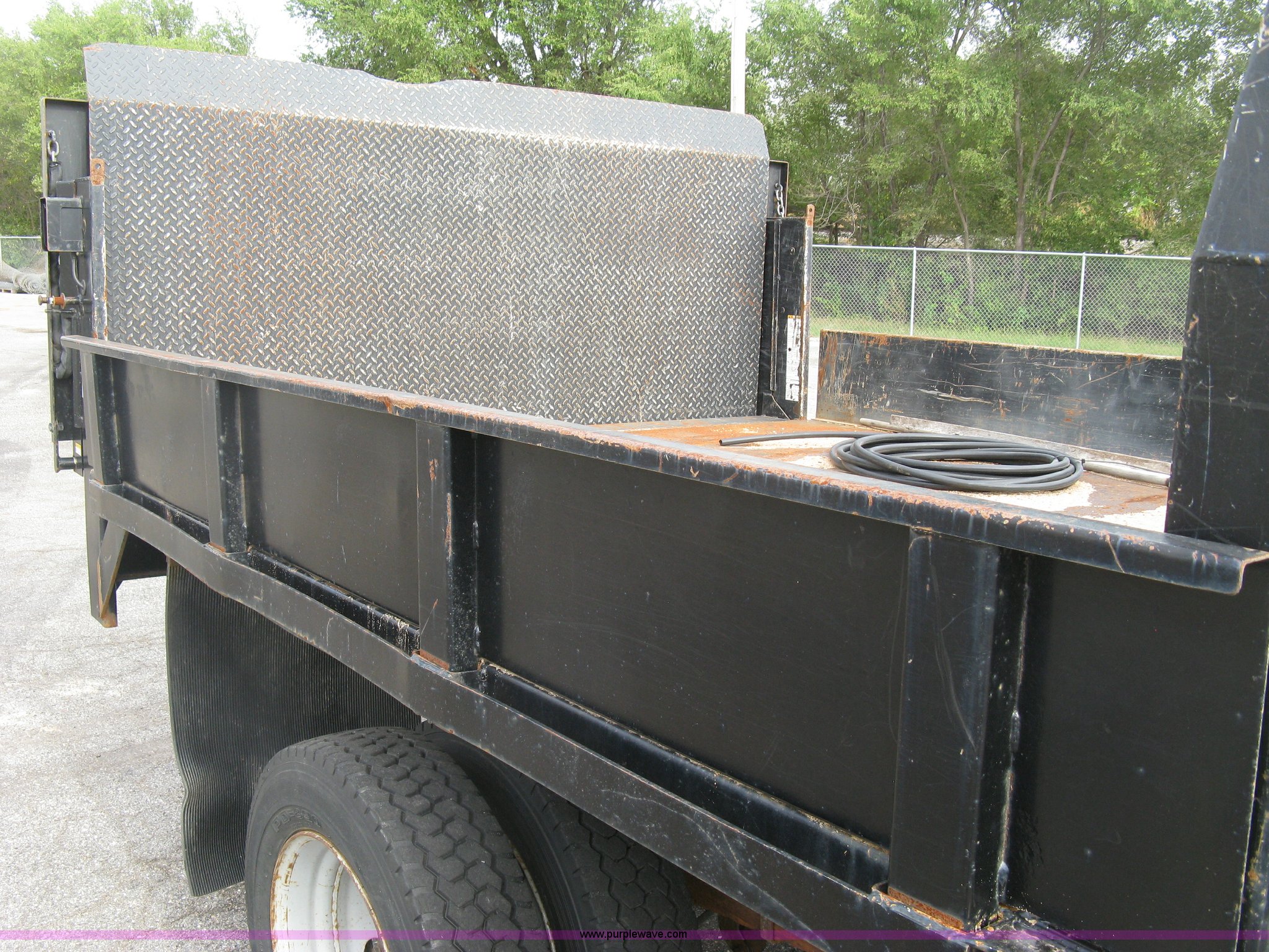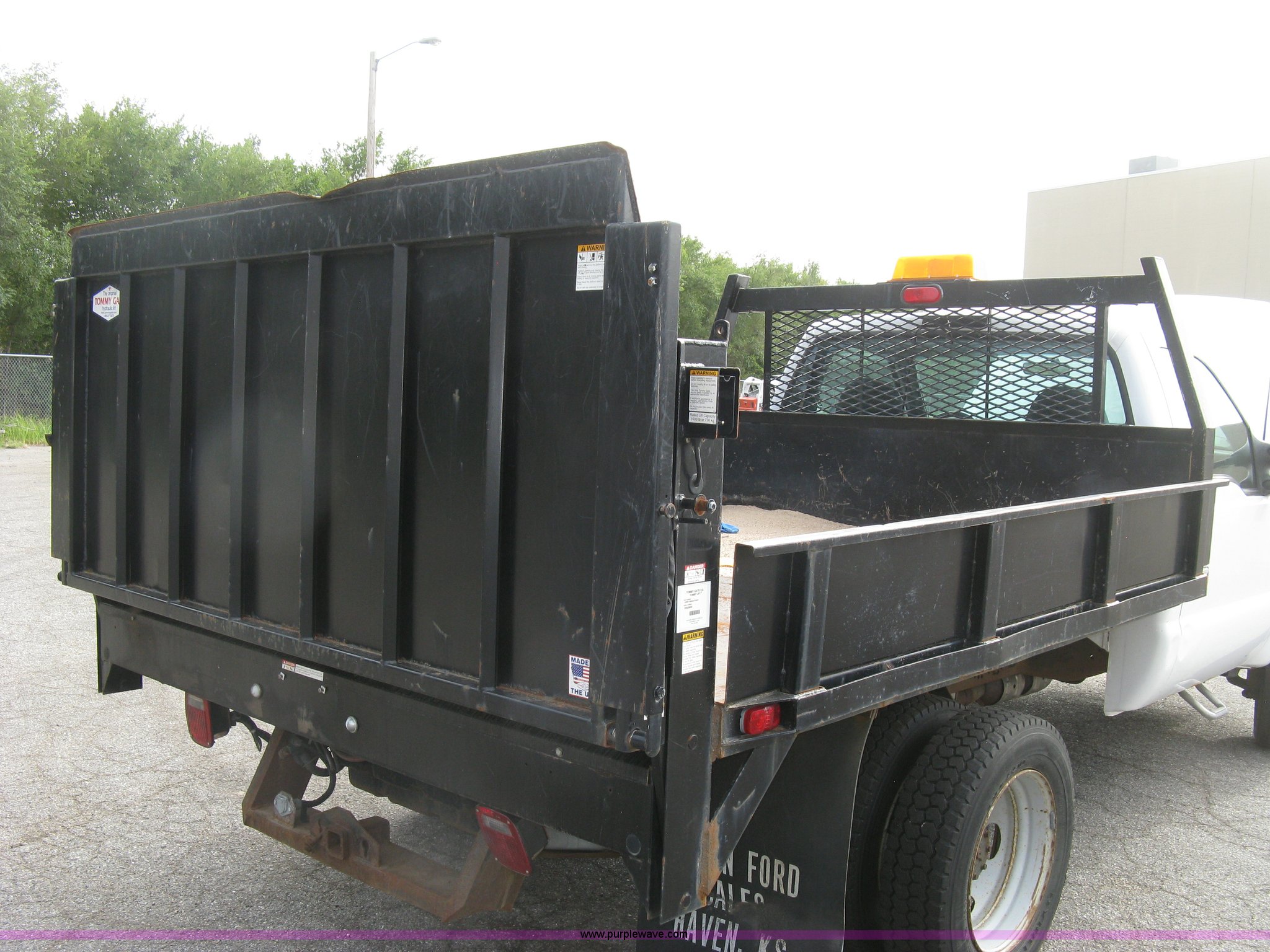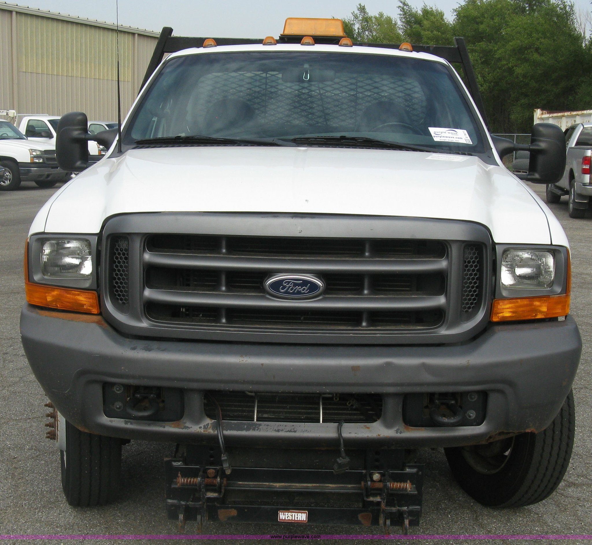 Purple Wave is selling a used Flat Bed Truck in Kansas. This item is a 2000 Ford F450 Super Duty XL flatbed truck with the following: 115,796 actual miles, 6.8L V10 SOHC 20V gas engine, Automatic transmission, AC and heat, AM/FM, Manual windows and locks, Vinyl interior, Electric trailer brake booster, Western plow control toggle, Tethered dump bed remote, 9'L x 91" dump flatbed, Harsh hoist, Tommy Gate lift gate, Large platform, Serial 00505659, Western snow plow mounting frame, No plow, Receiver hitch, Trailer wiring, 225/70R19.5 tires, Interior/exterior cosmetic damage, Cracked windshield, Catalytic converter is bad, Body damage, Rust, Unit# 94