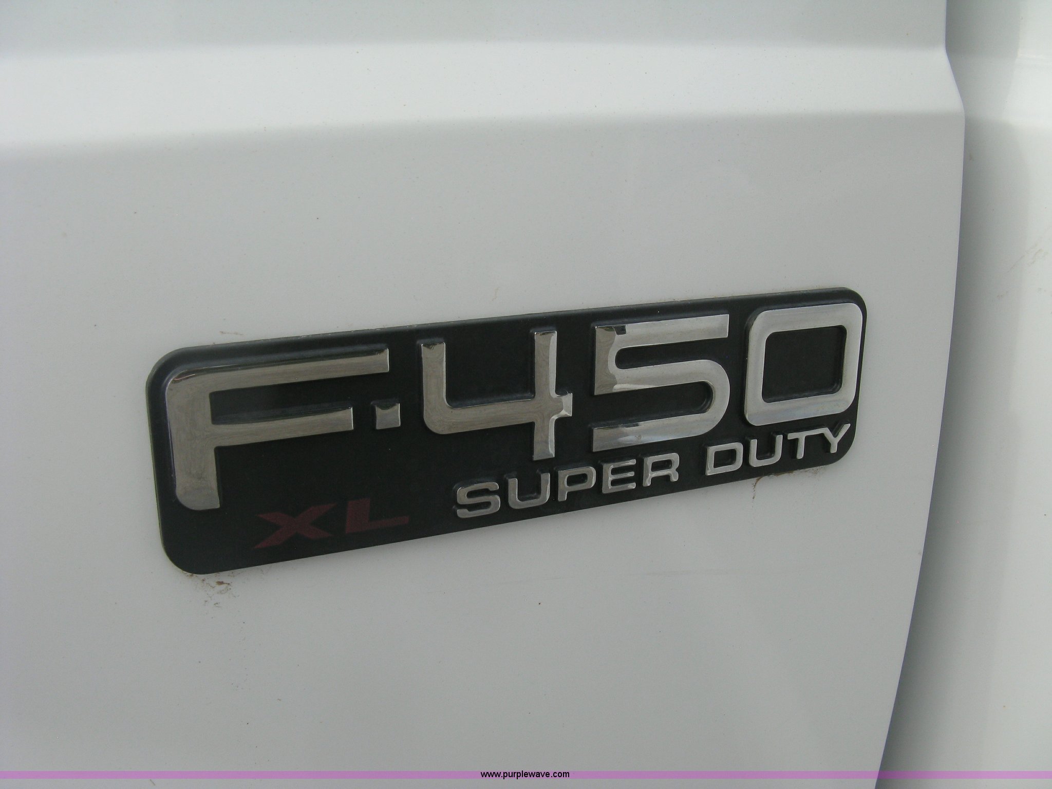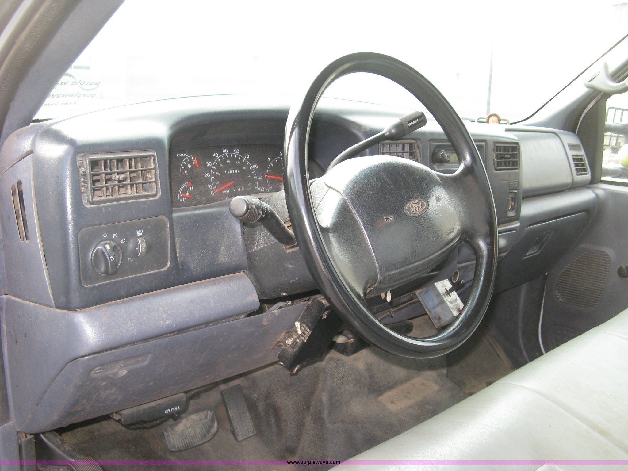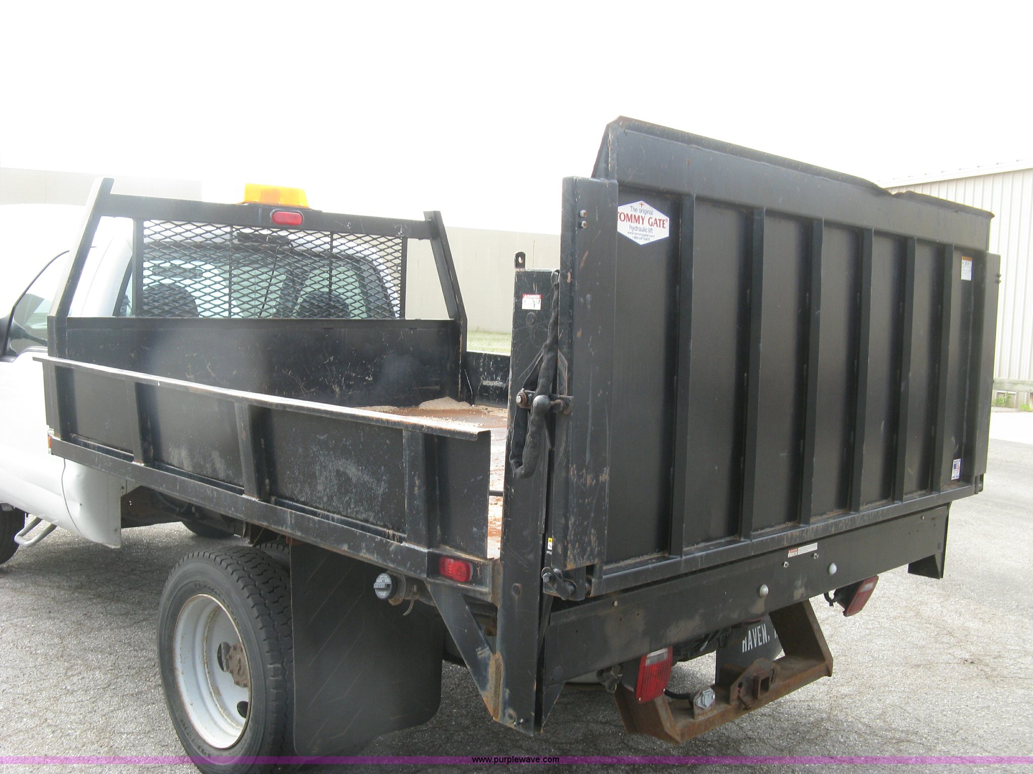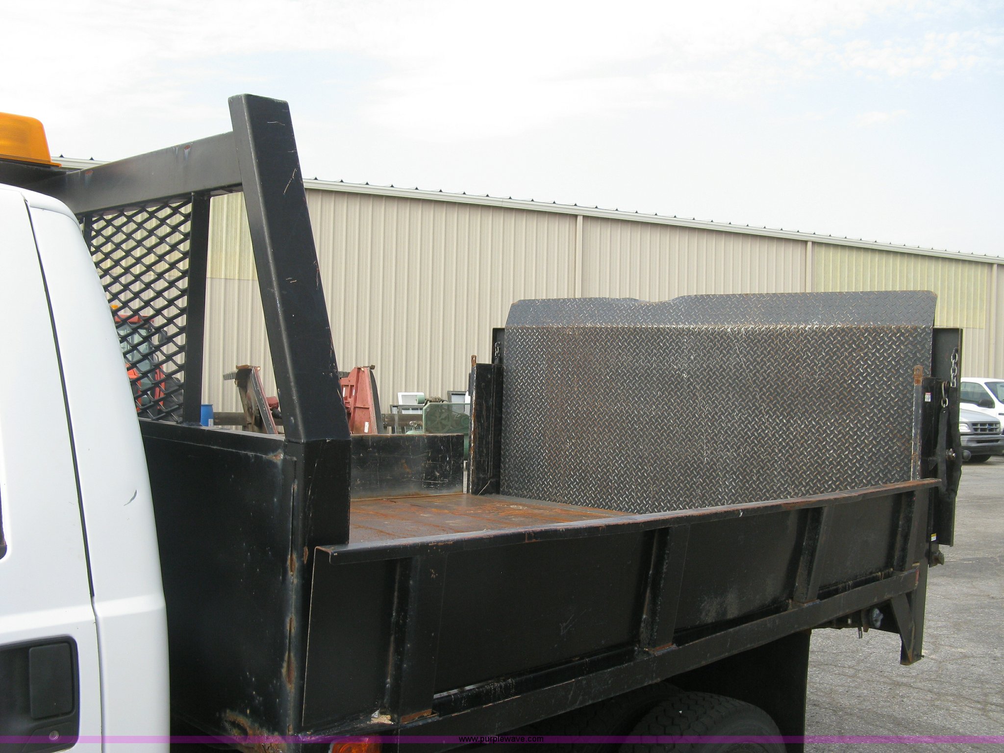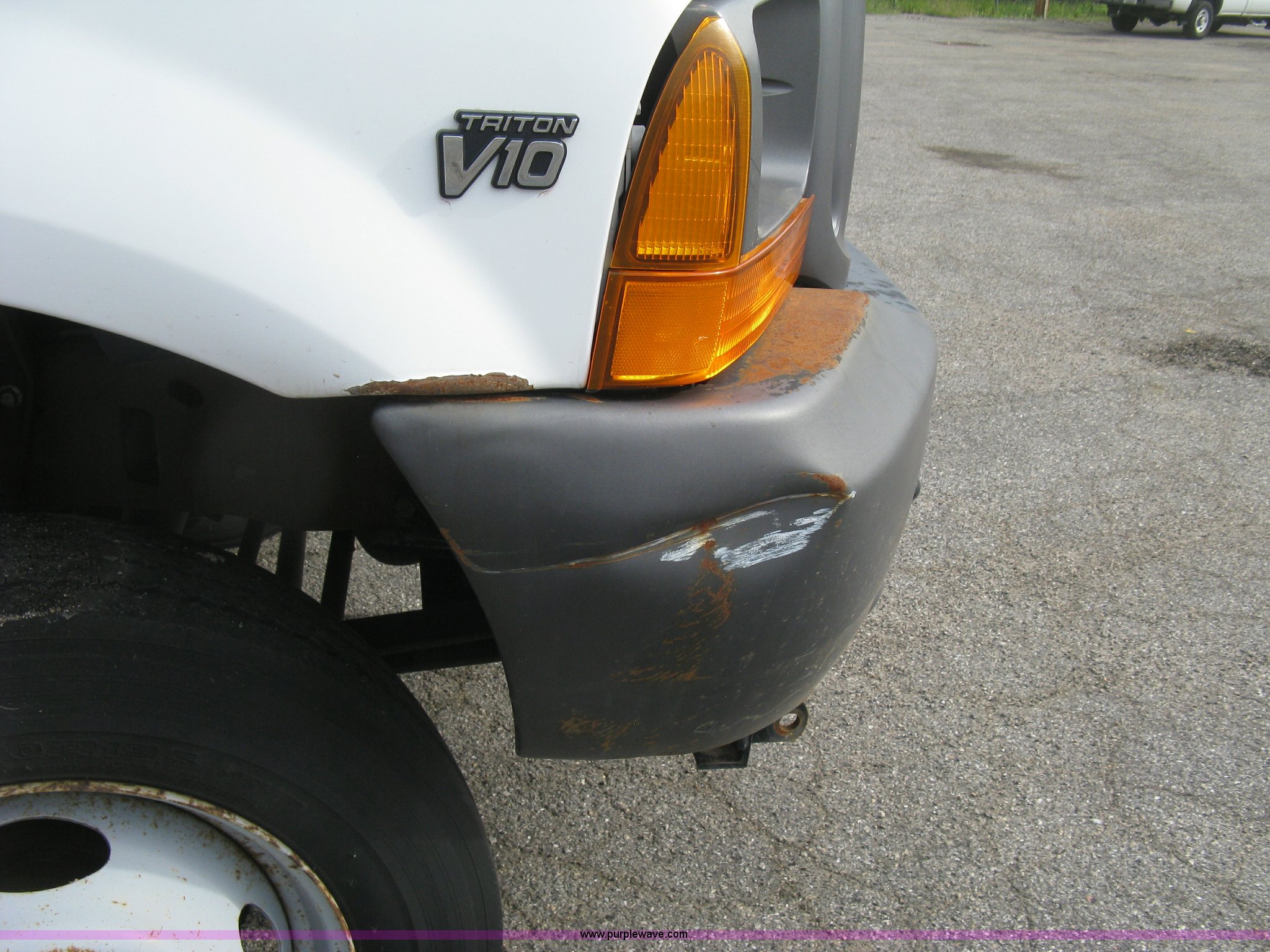 Purple Wave is selling a used Flat Bed Truck in Kansas. This item is a 2000 Ford F450 Super Duty XL flatbed truck with the following: 115,796 actual miles, 6.8L V10 SOHC 20V gas engine, Automatic transmission, AC and heat, AM/FM, Manual windows and locks, Vinyl interior, Electric trailer brake booster, Western plow control toggle, Tethered dump bed remote, 9'L x 91" dump flatbed, Harsh hoist, Tommy Gate lift gate, Large platform, Serial 00505659, Western snow plow mounting frame, No plow, Receiver hitch, Trailer wiring, 225/70R19.5 tires, Interior/exterior cosmetic damage, Cracked windshield, Catalytic converter is bad, Body damage, Rust, Unit# 94