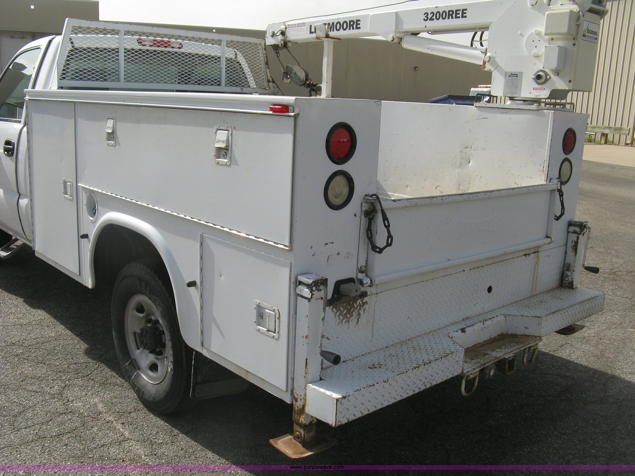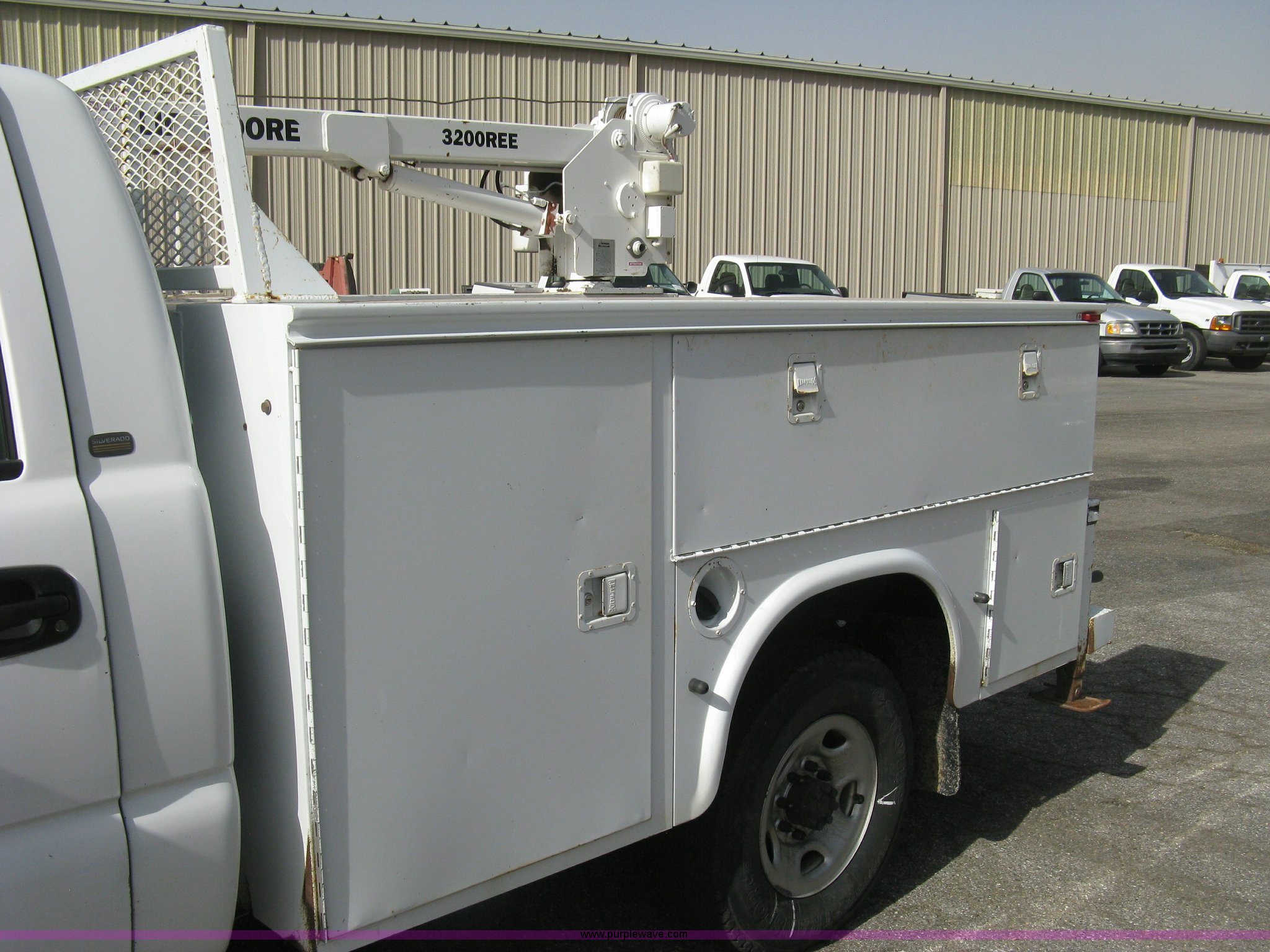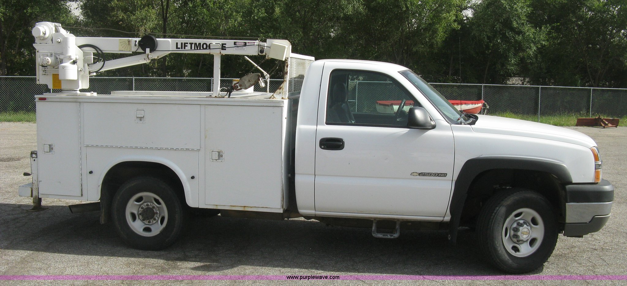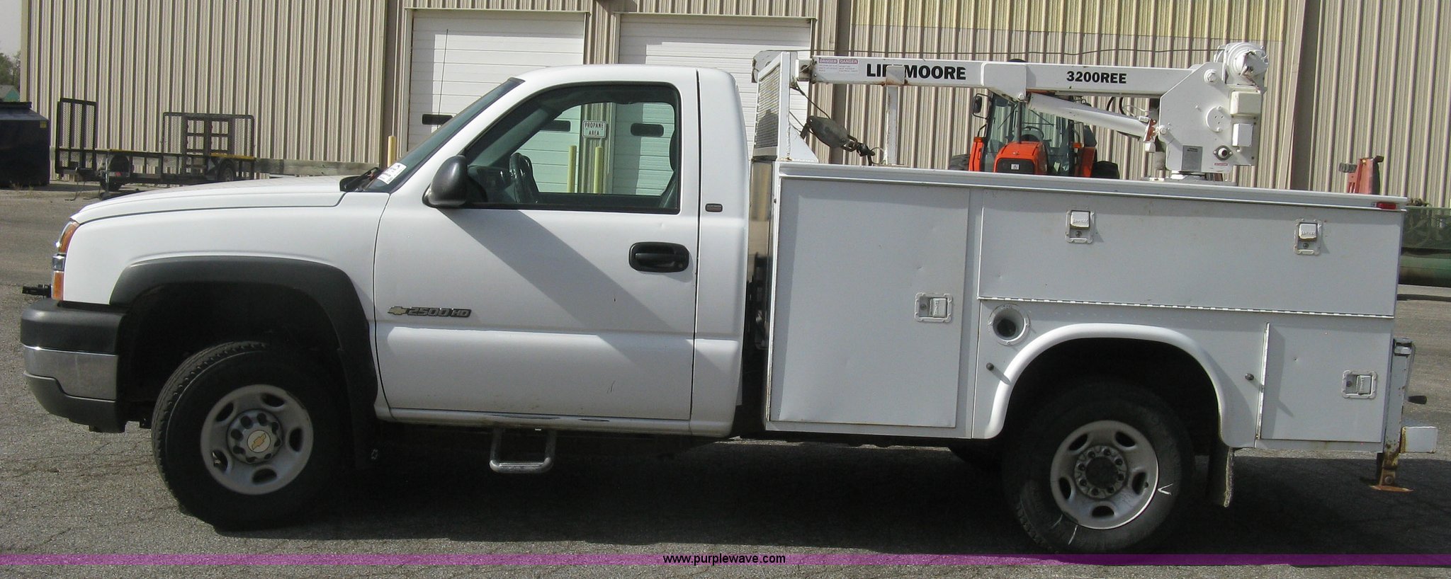 Purple Wave is selling a used Service Truck in Kansas. This item is a 2004 Chevrolet Silverado 2500HD utility truck with the following: 119,662 actual miles, 6.0L V8 OHV 16V gas engine, Automatic transmission, Four wheel drive, AC and heat, Tilt, AM/FM, Manual windows and locks, Cloth interior, Knapheide utility bed, 8'L x 78"W, Headache rack, Step-up bumper, Manual jack support/outrigger on rear bumper, (6) tool cabinets, Lift Moore 3200REE telescopic crane, Tethered remote, Serial S554W58, Boss snow plow mounting frame, No plow, Receiver hitch, Trailer wiring, LT245/75R16 tires, Interior/exterior cosmetic damage, Unit# 31